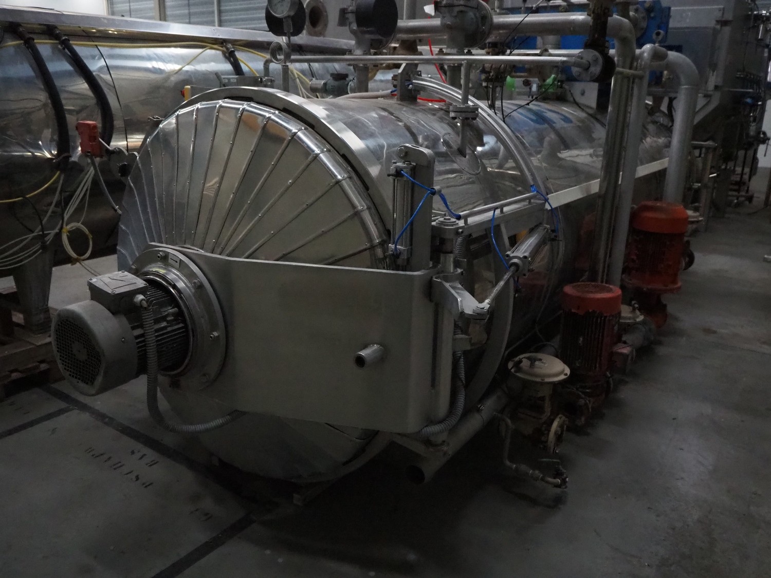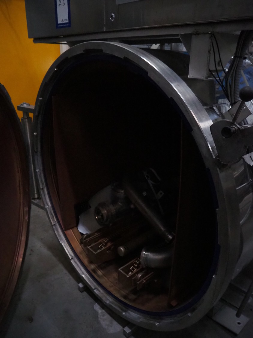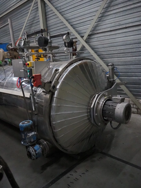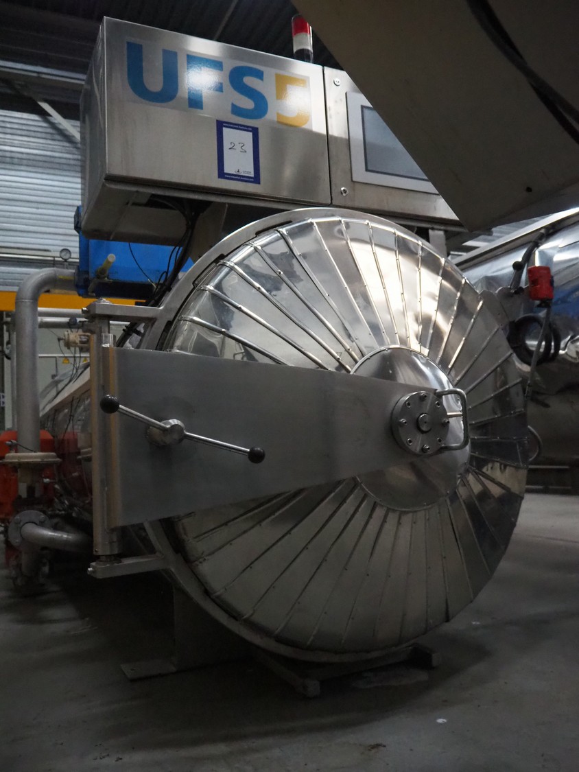 J. Lagarde autoclave, year of construction: 1994, diameter: 1300 mm, content: 6450 litres, 3 x 400 V, 50 Hz, 25.5 kW, heating: steam, working pressure: 5 bar, working temperature: 158 °C, Vicarb heat exchanger, type: V28-5054, automatic transport inside autoclave, 2-doors, total dimensions: 5800 mm x 1900 mm x 2400 mm.