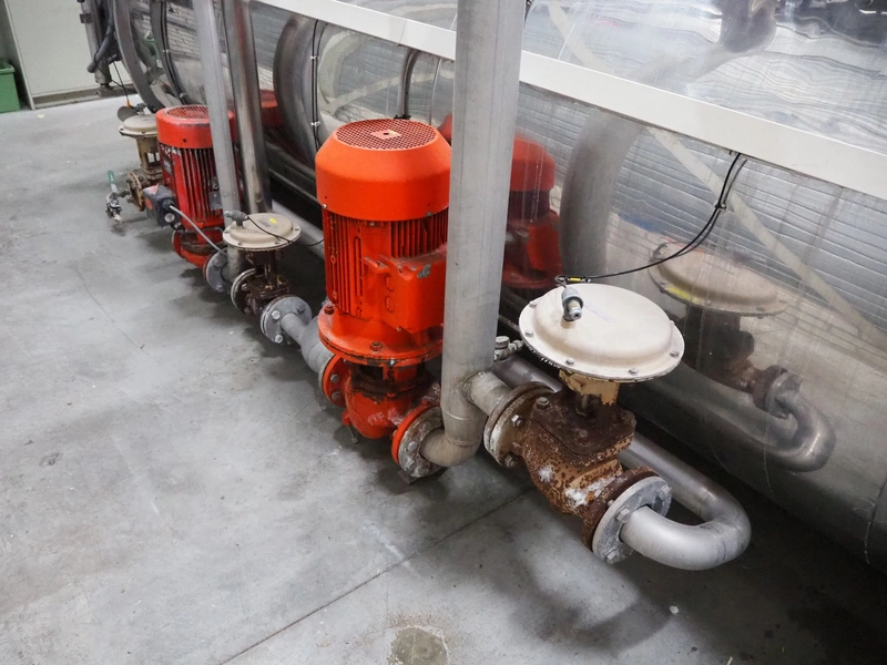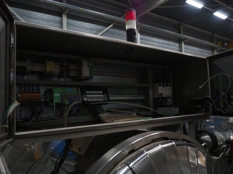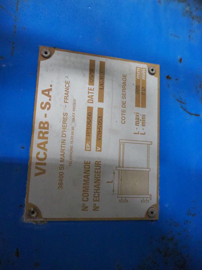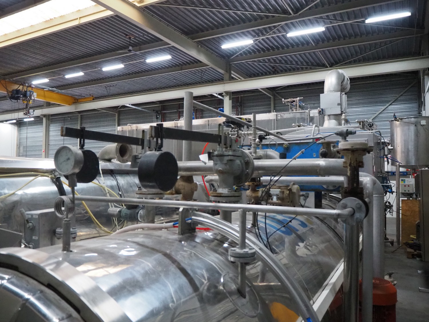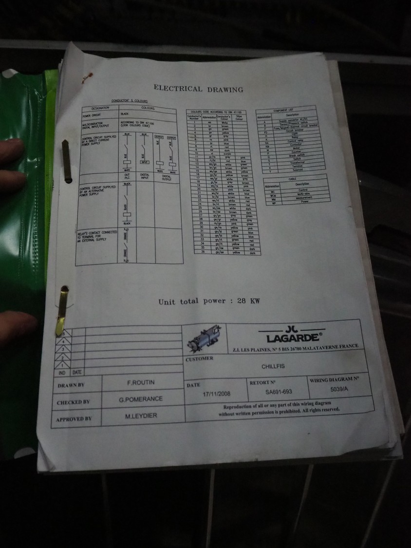 J. Lagarde autoclave, year of construction: 1994, diameter: 1300 mm, content: 6450 litres, 3 x 400 V, 50 Hz, 25.5 kW, heating: steam, working pressure: 5 bar, working temperature: 158 °C, Vicarb heat exchanger, type: V28-5054, automatic transport inside autoclave, 2-doors, total dimensions: 5800 mm x 1900 mm x 2400 mm.