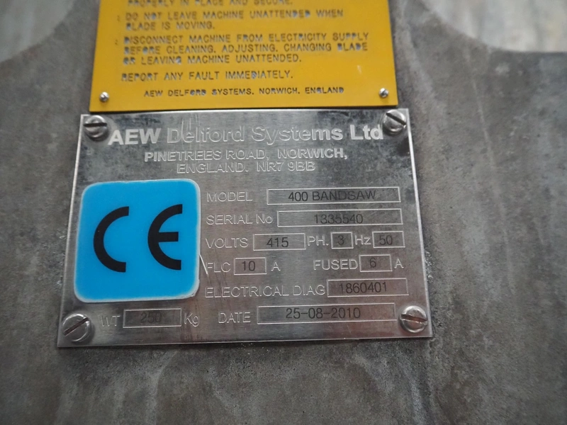 AEW Delford Systems Ltd bandsaw, model: 400 Bandsaw, serial number: 1335540, year of construction: 25/08/2010, 415 V, 3 Ph, 50 Hz, 10/6 A, weight: 250 kg, dimensions: 1070 mm x 1050 mm x 1900 mm. Without saw.