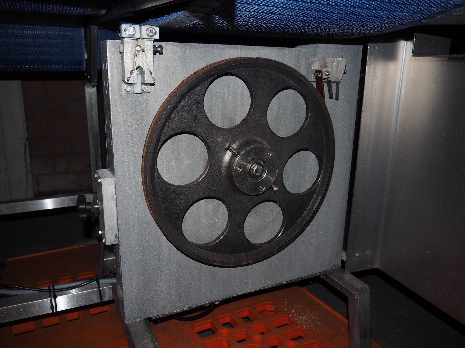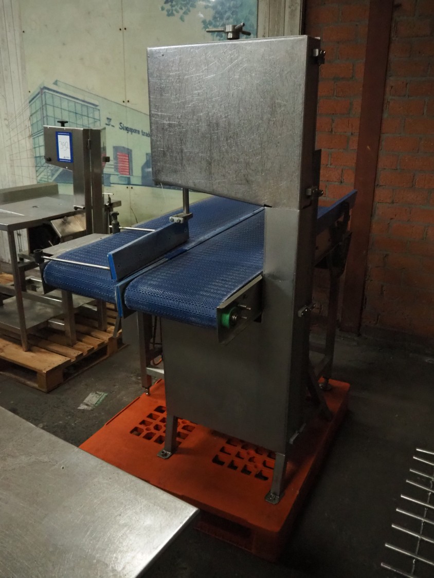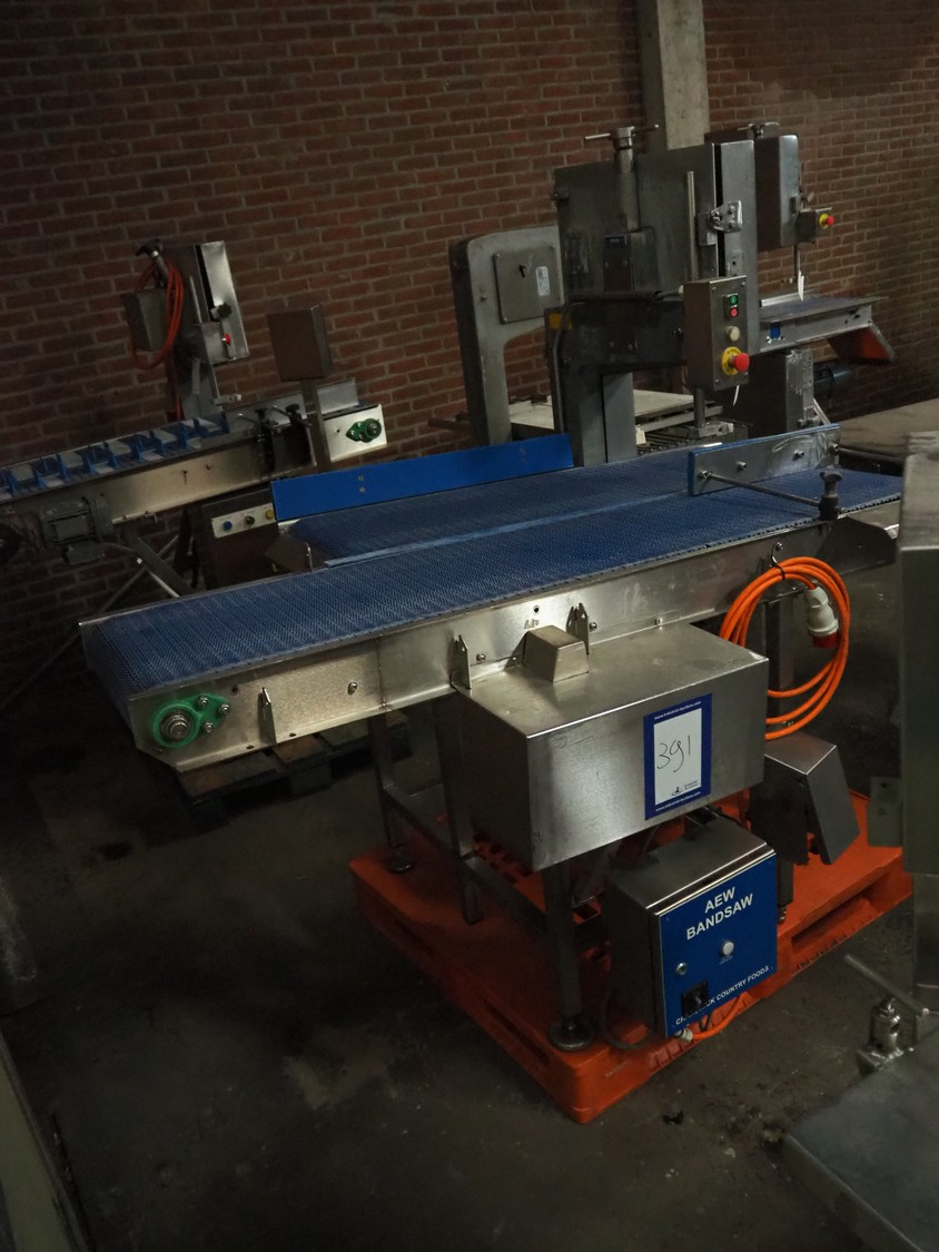 AEW bandsaw, plastic belt, belt width: 380 mm, total dimensions: 1860 mm x 1190 mm x 1750 mm. Incomplete. Without saw.