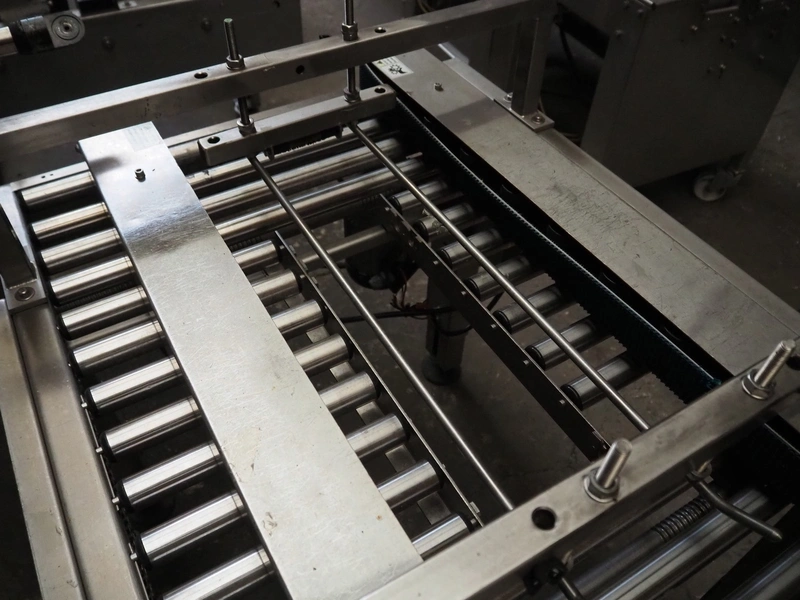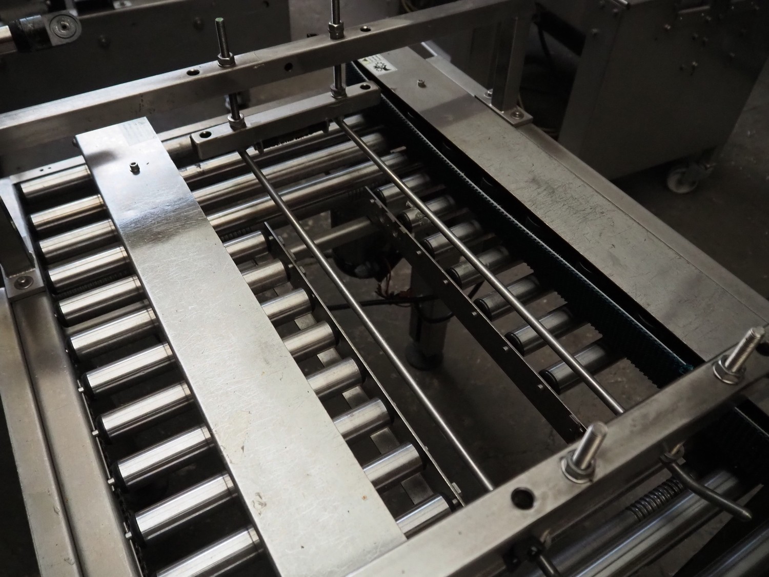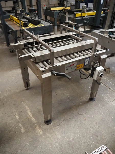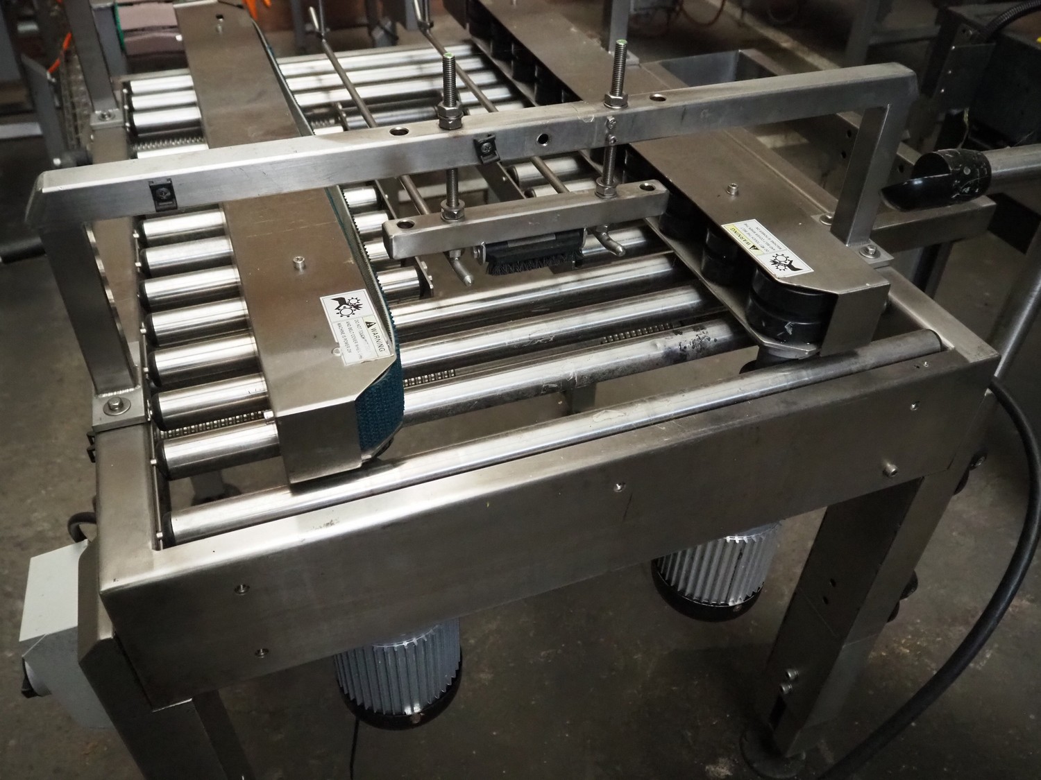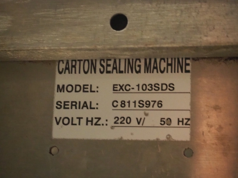 Box closing machine, model: EXC-103SDS, serial number: C811S976, 220 V, 50 Hz, plastic rollers, roller width: 680 mm and 250 mm, total dimensions: 1100 mm x 1100 mm x 1150 mm. Incomplete.