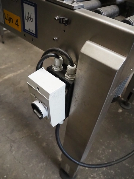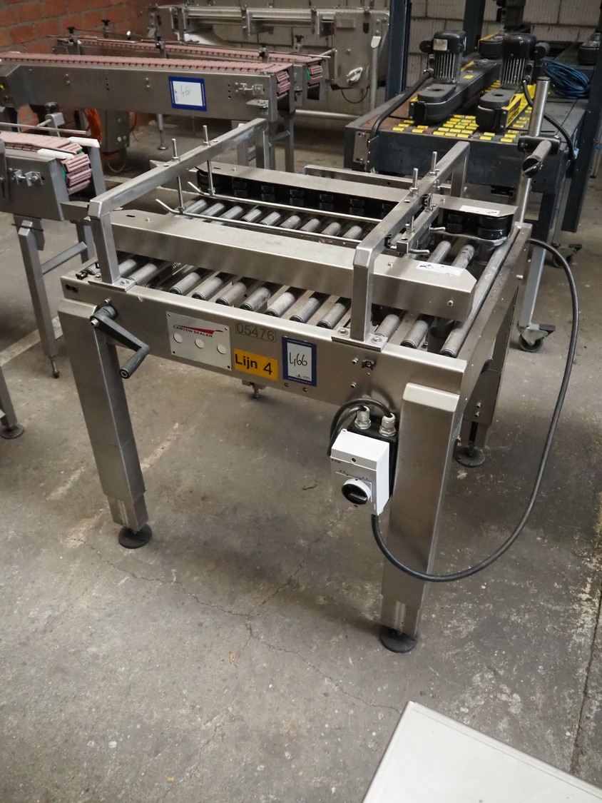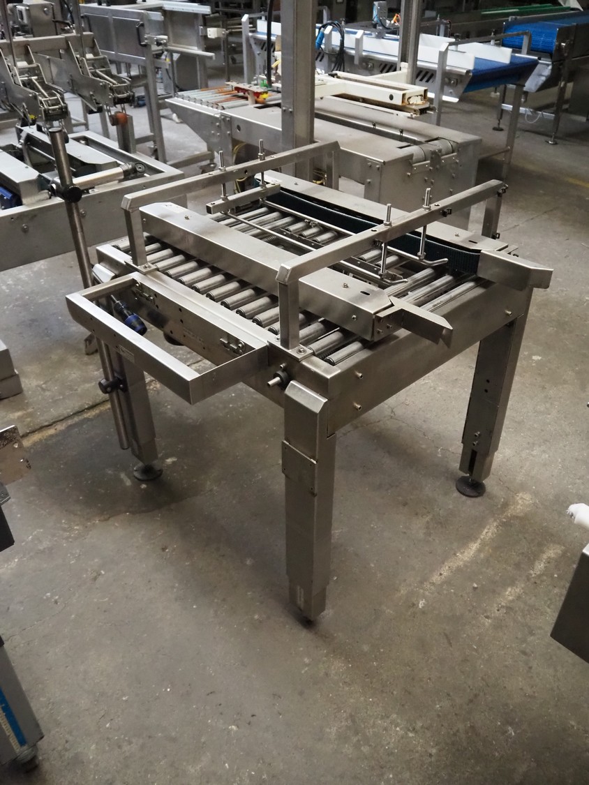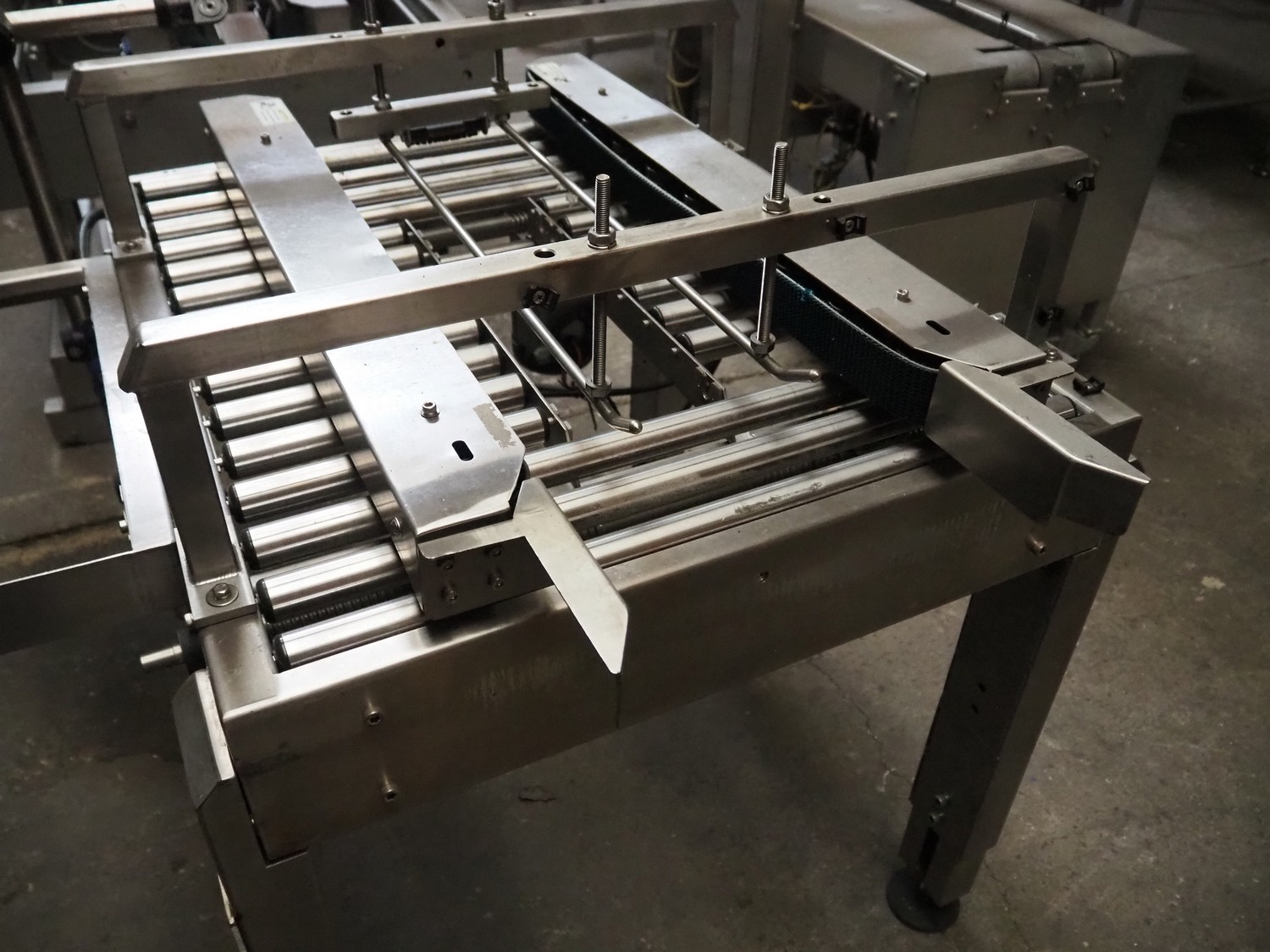 Box closing machine, model: EXC-103SDS, serial number: C811S976, 220 V, 50 Hz, plastic rollers, roller width: 680 mm and 250 mm, total dimensions: 1100 mm x 1100 mm x 1150 mm. Incomplete.