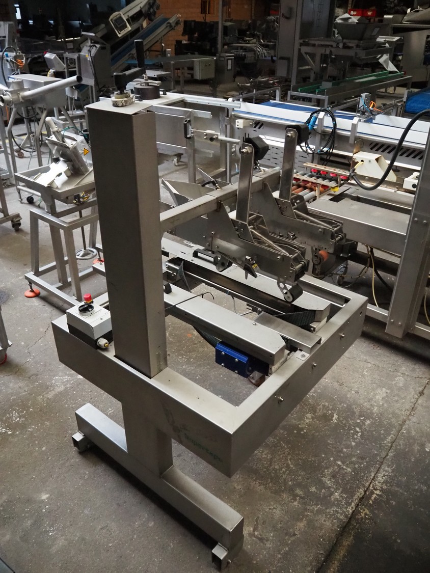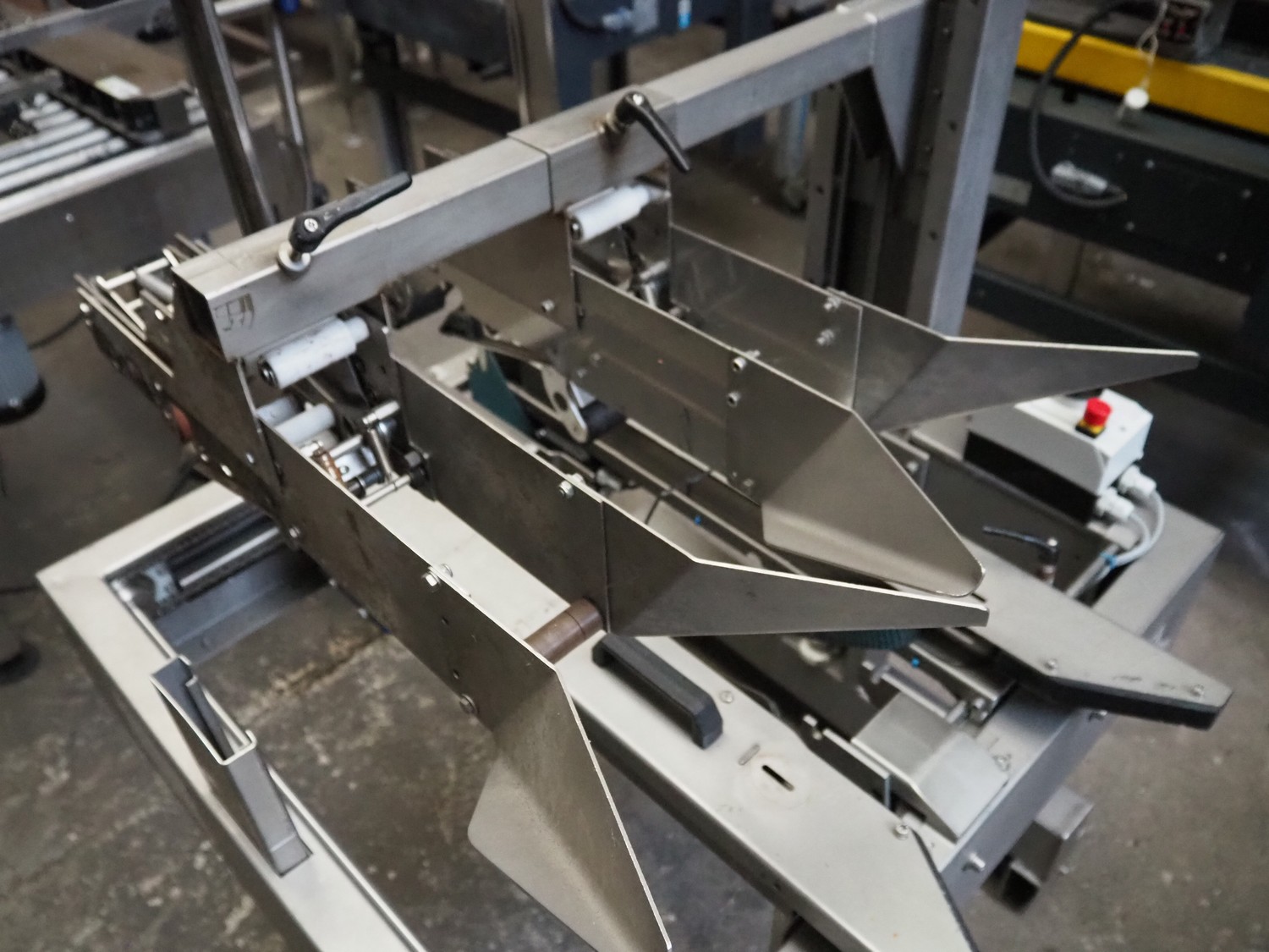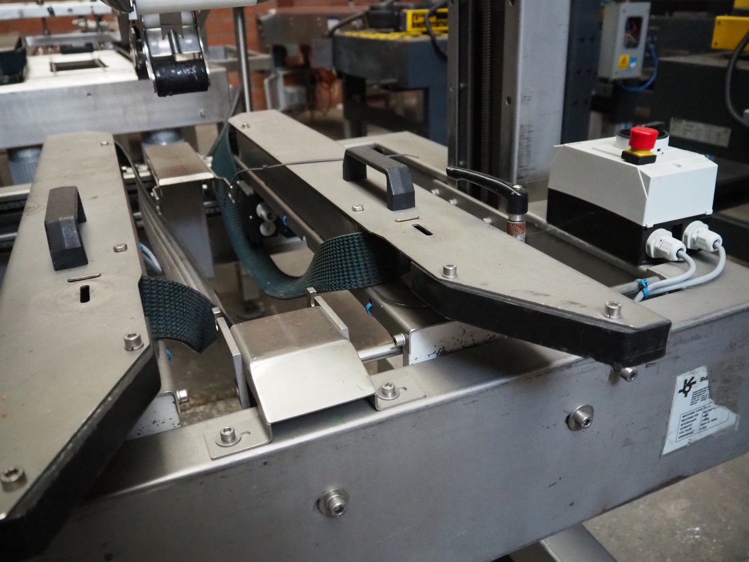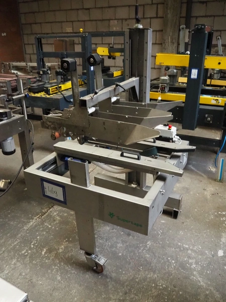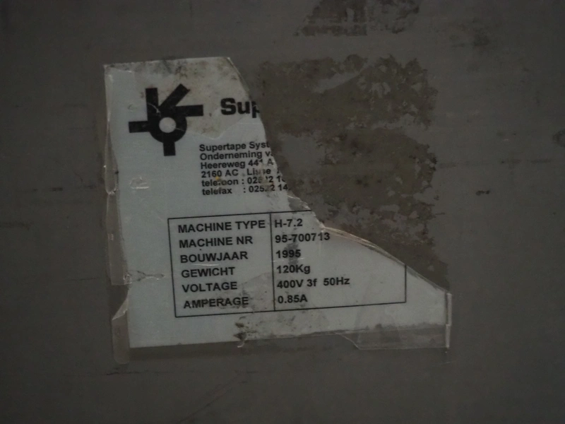 Supertape Systems box closing machine with 2 top tapers, type: H-7.2, machine number: 95-700713, year of construction: 1995, 400 V, 3 Ph, 50 Hz, 0.85 A, dimensions: 950 mm x 870 mm x 1150 mm.