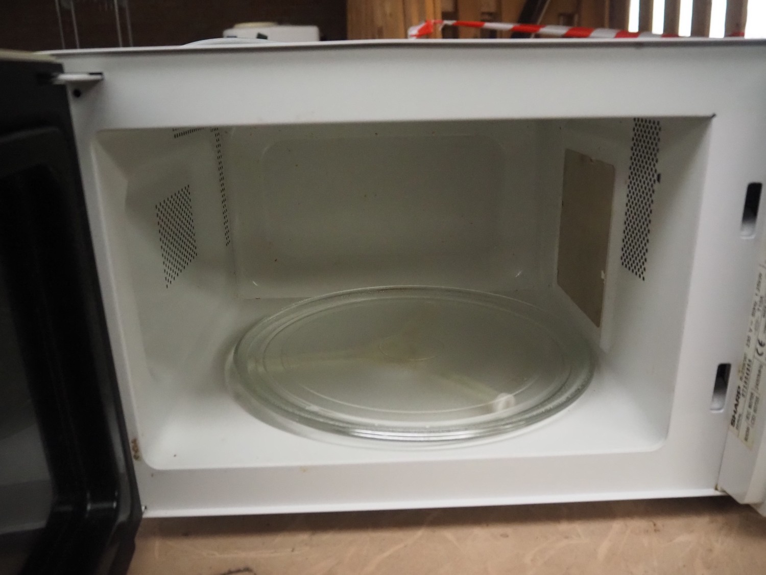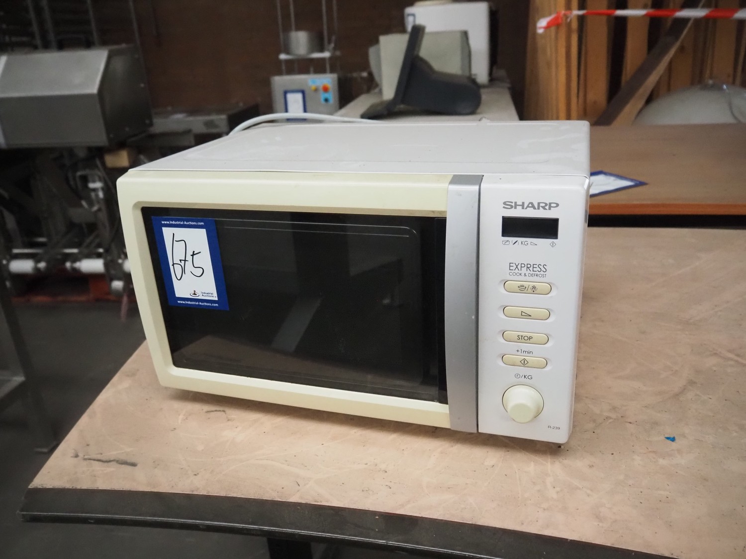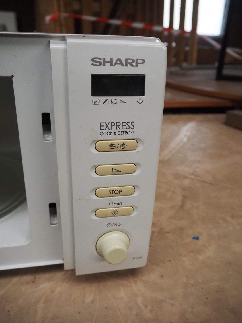 Sharp microwave, type: R239(W), serial number: 071054358, 230 V, 50 Hz, 1.25 kW, dimensions: 460 mm x 320 mm x 260 mm.