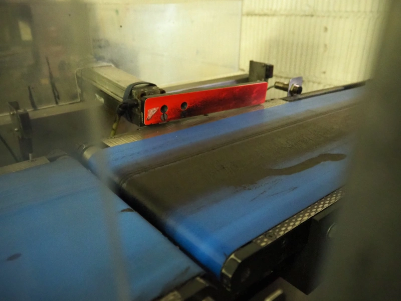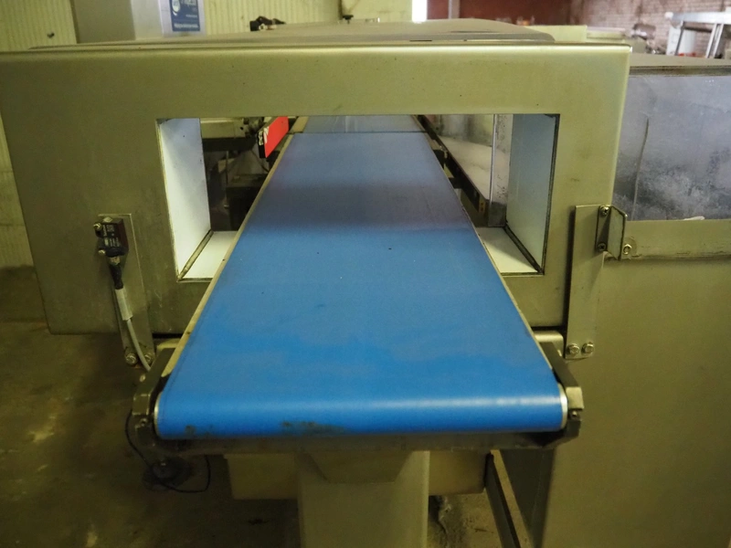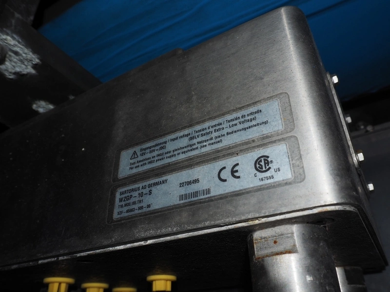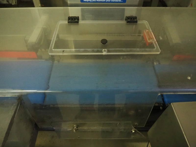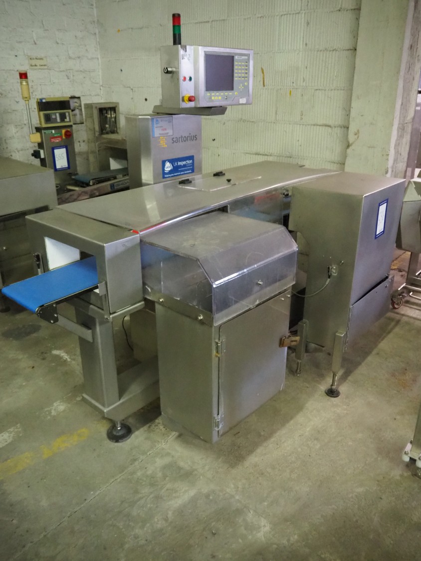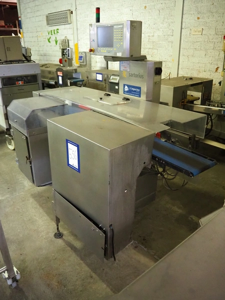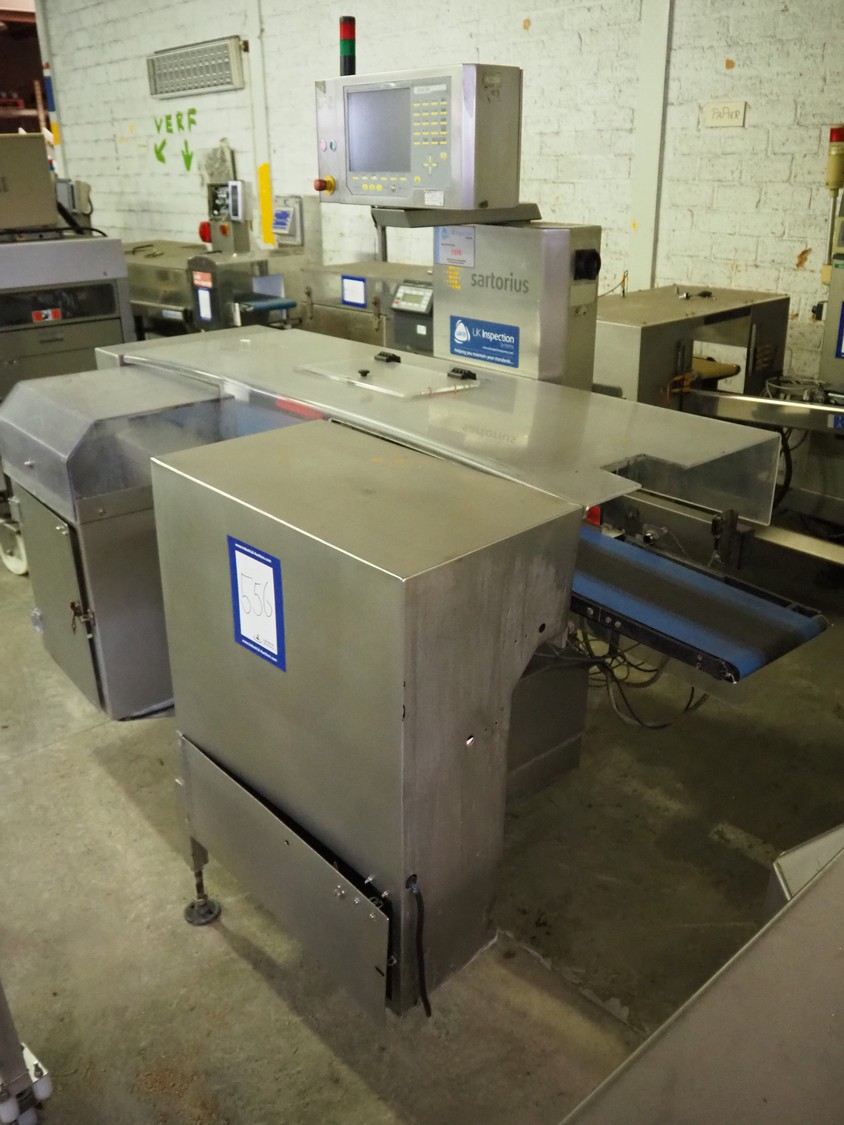 Sartorius checkweigher and metal detector with rejector, plastic belt, belt width: (3x) 230 mm, clearance: 230 mm x 135 mm, total dimensions: 2300 mm x 1300 mm x 1900 mm.