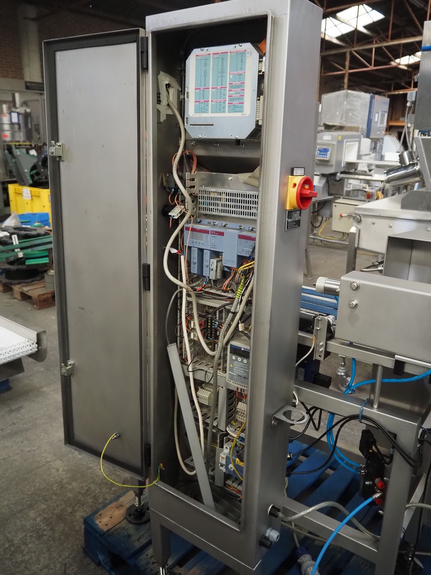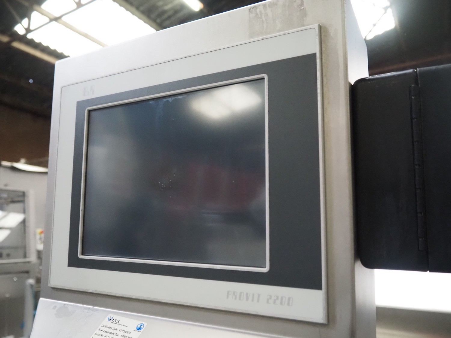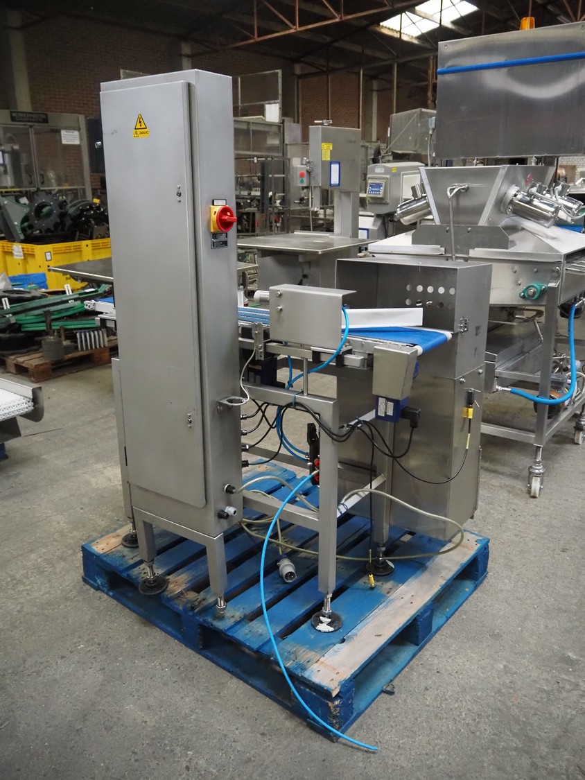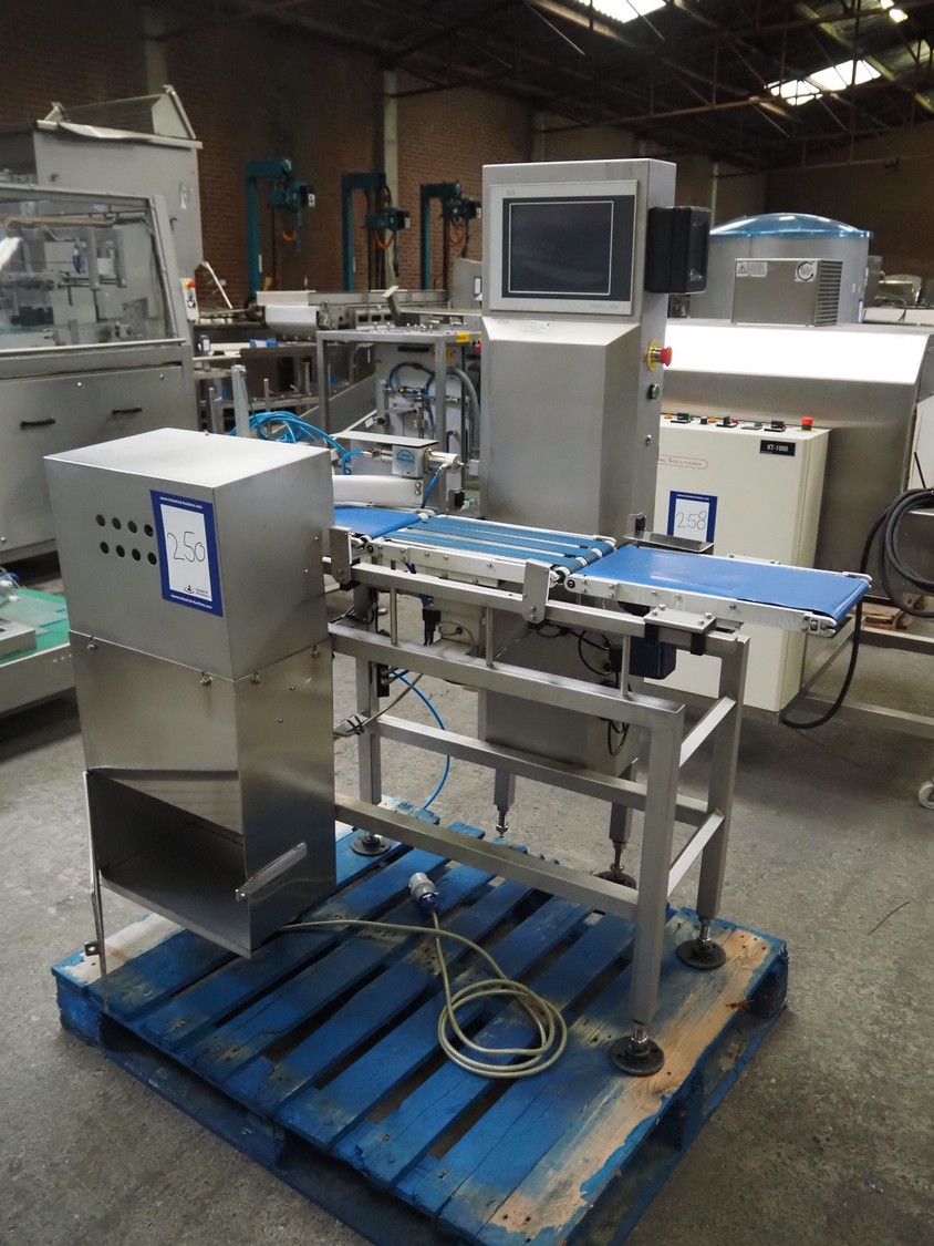 Cintex LTD checkweigher with rejector, type: CS4000, serial number: 81642, year of construction: 2002, 230 V, 1 Ph, 50 Hz, 3 A, plastic belts, belt width: (2x) 205 mm, (1x) 180 mm, total dimensions: 1300 mm x 900 mm x 1570 mm.