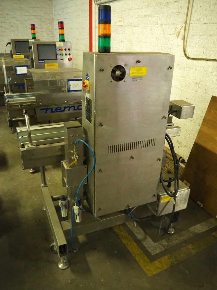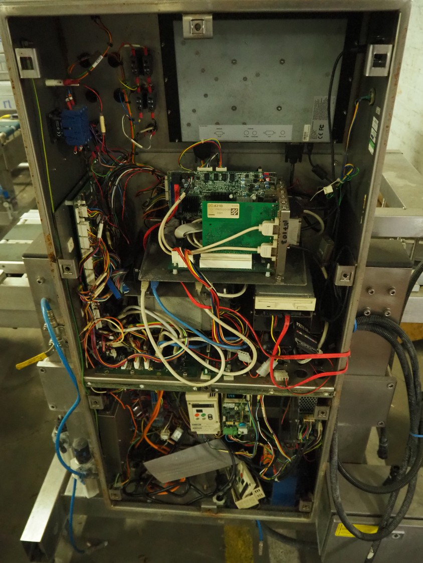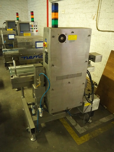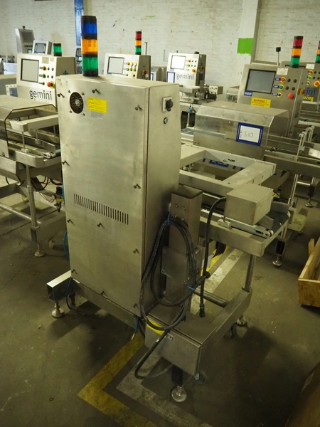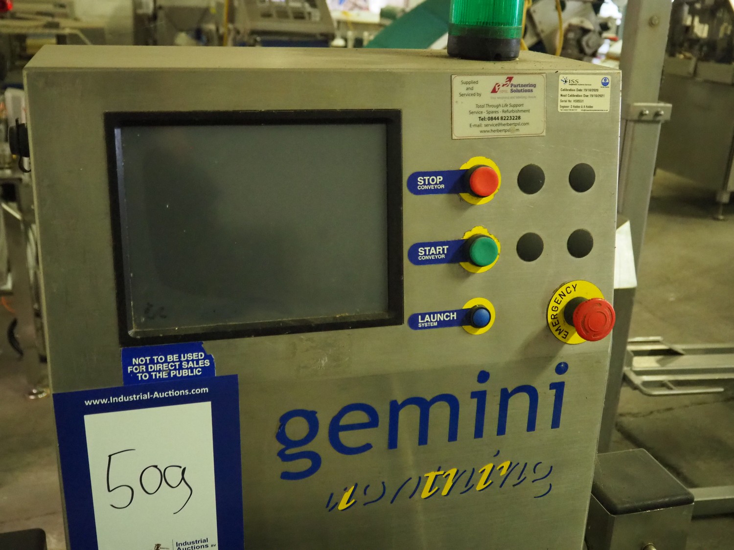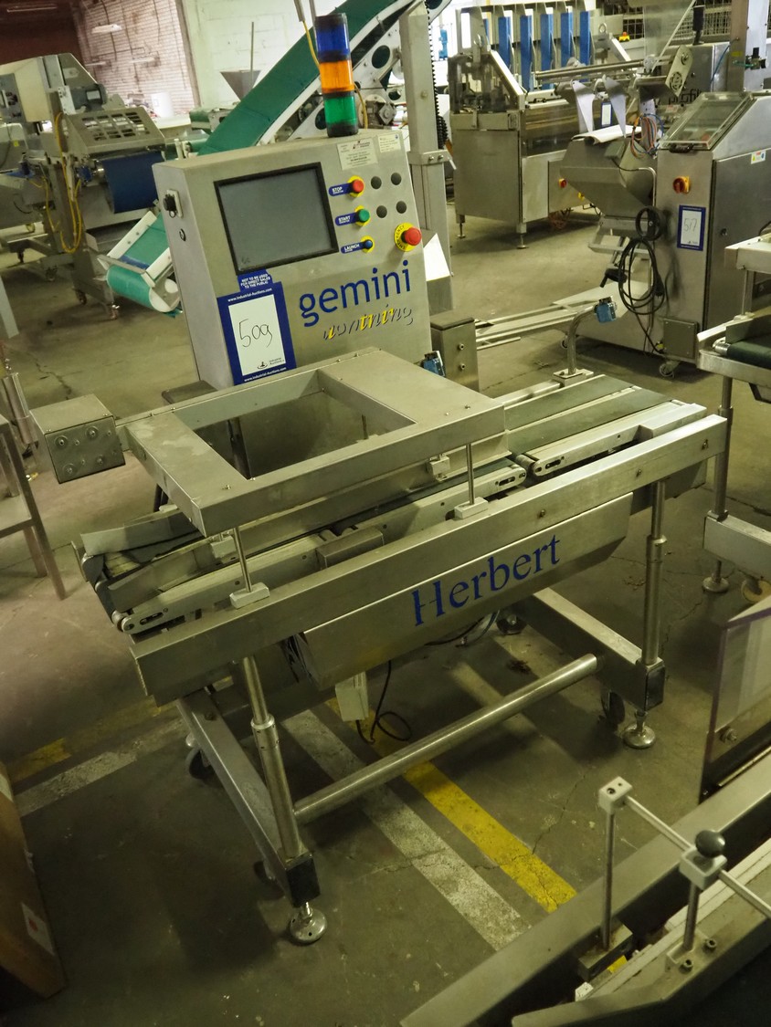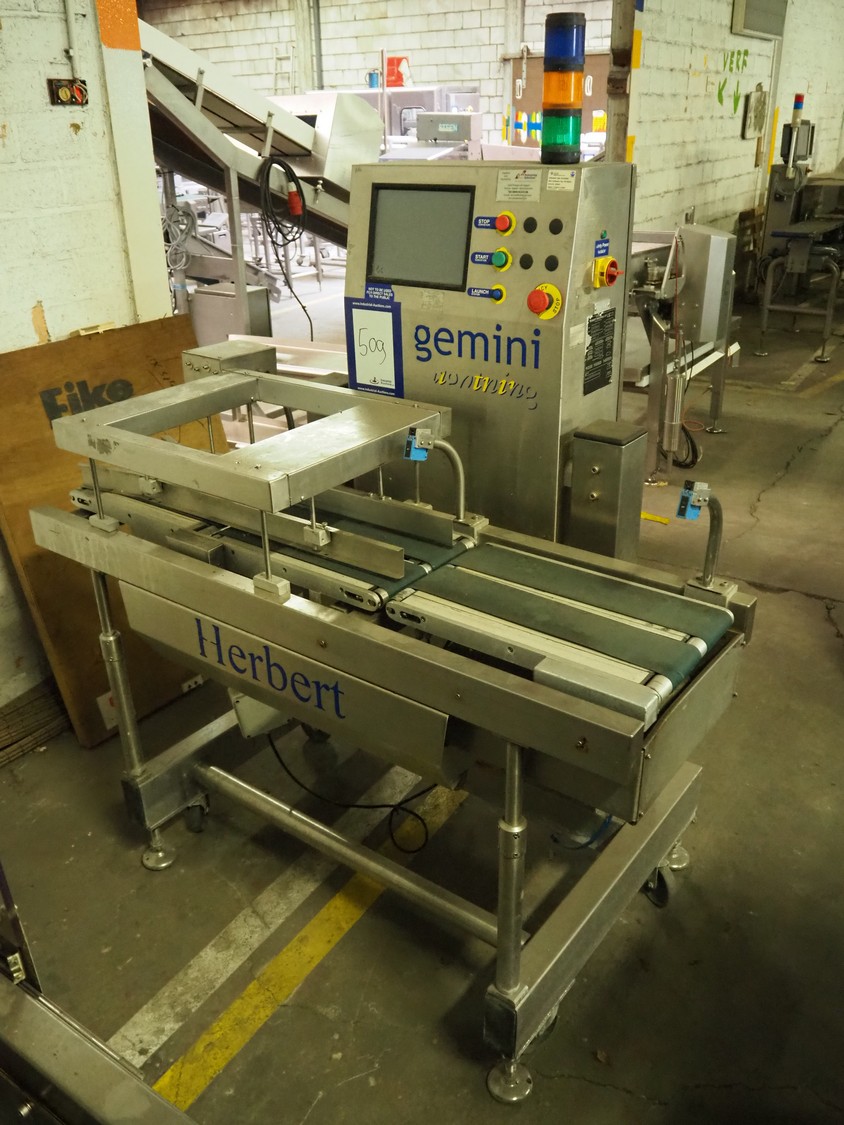Herbert Industrial Ltd. checkweigher, model: Gemini, serial number: HS 85531, year of construction: 2005, 230 V, 1 Ph, 50 Hz, 1.3/0.4 A, capacity: 150 packages/minute, plastic belt, belt width: (2x) 100 mm, total dimensions: 1330 mm x 820 mm x 1730 mm.