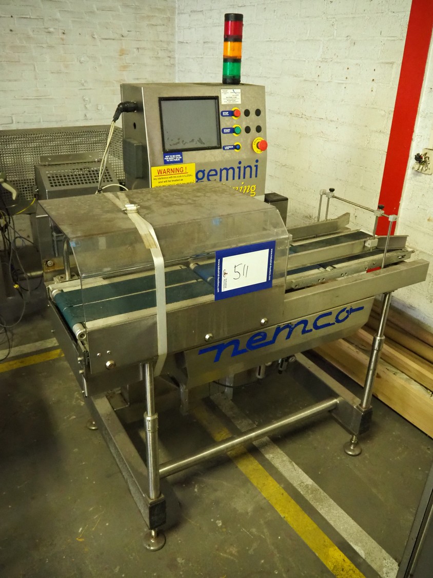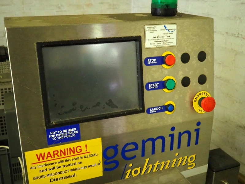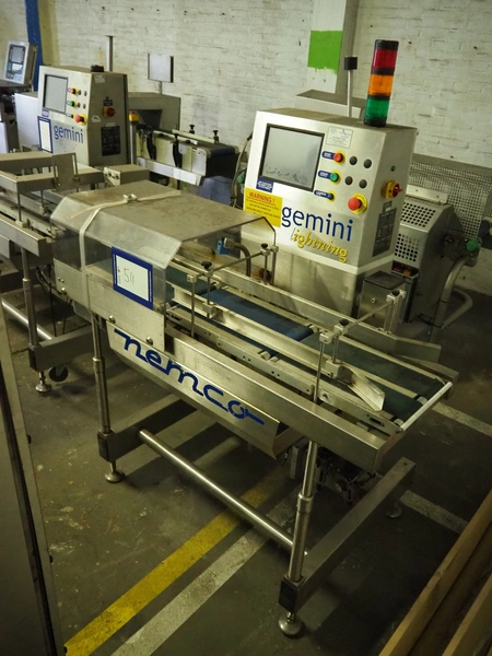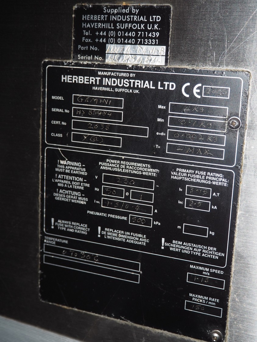 Herbert checkweigher, model: GEMINI, serial number: HS 85484, year of construction: 2005, 230 V, 1 Ph, 50 Hz, 1.3/0.4 A, maximum weight: 4 kg, minimum weight: 0.1 kg, e=d= 02 kg, plastic belts, belt width: (2x) 100 mm, total dimensions: 1250 mm x 800 mm x 1500 mm.