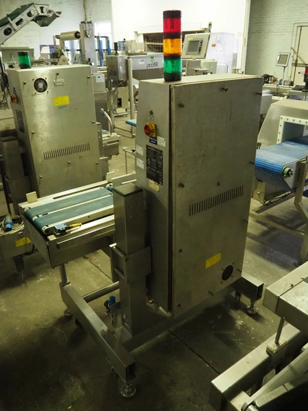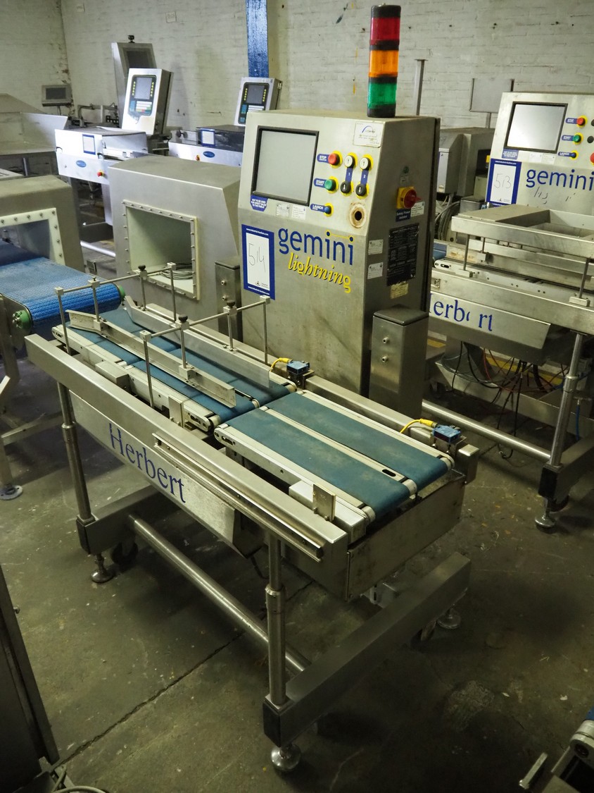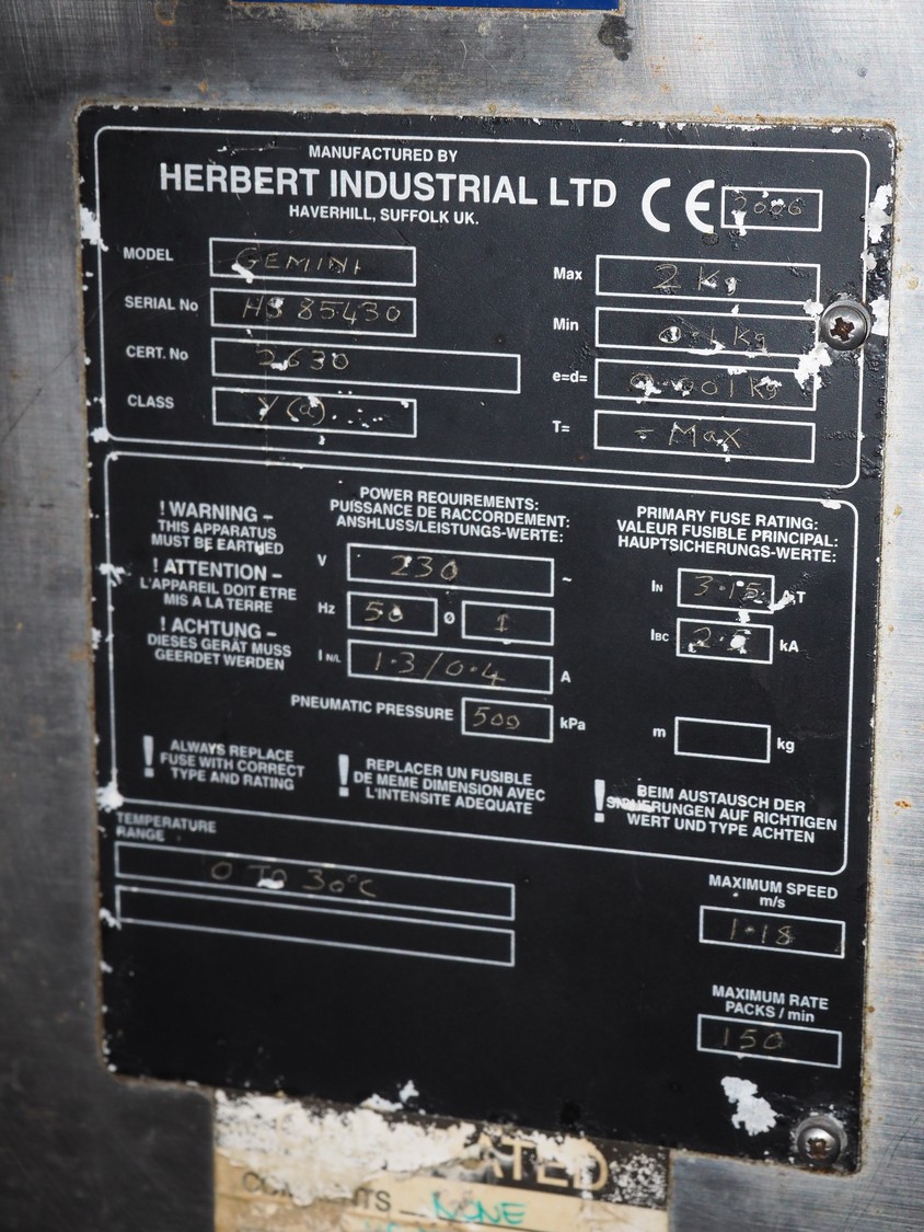 Herbert Industrial LTD checkweigher, model: GEMINI, serial number: HS85430, maximum weight: 2 kg, minimum weight: 0.1 kg, e = 01 kg, 230 V, 1 Ph, 50 Hz, 1.3/0.4 A, plastic belt, belt width: (2x) 100 mm, dimensions: 1400 mm x 800 mm x 1500 mm. Incomplete, technical condition unknown.