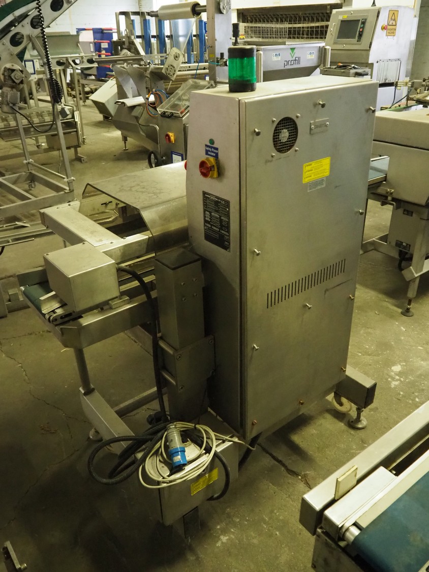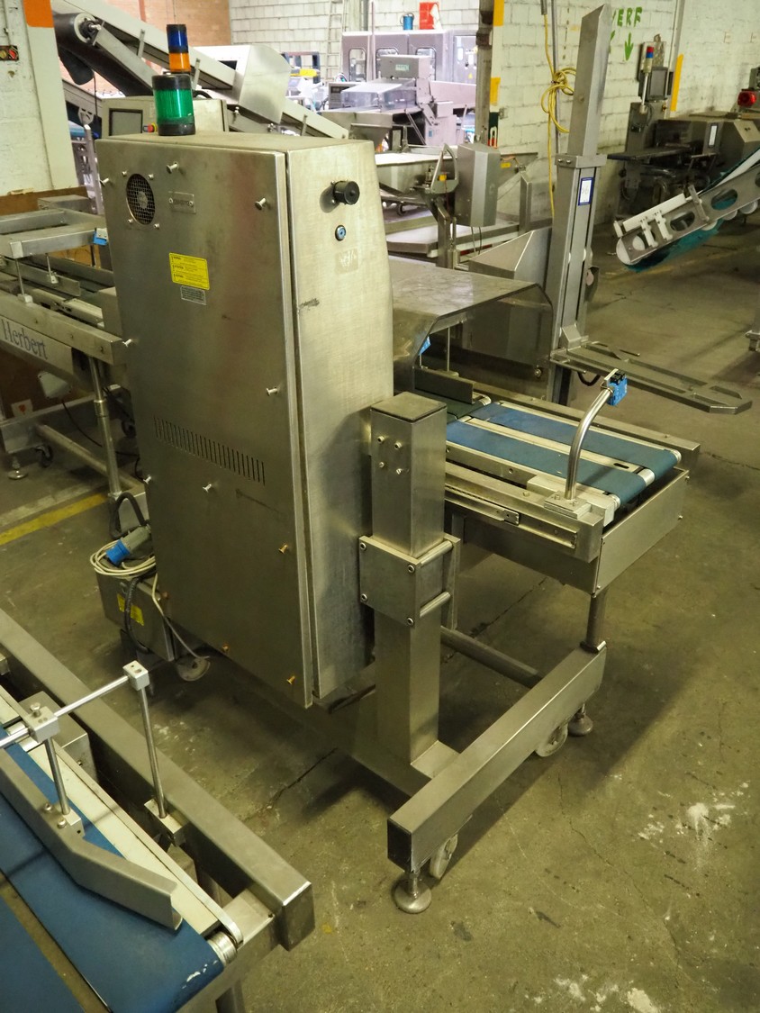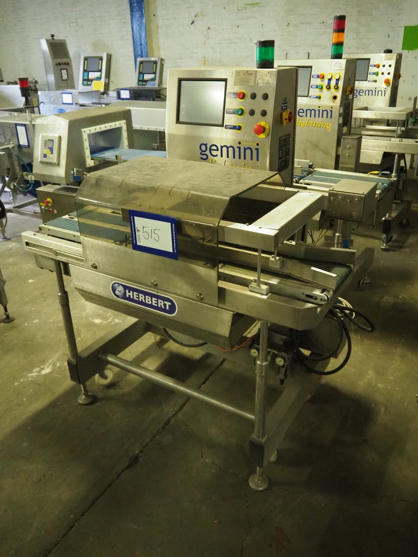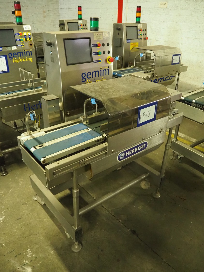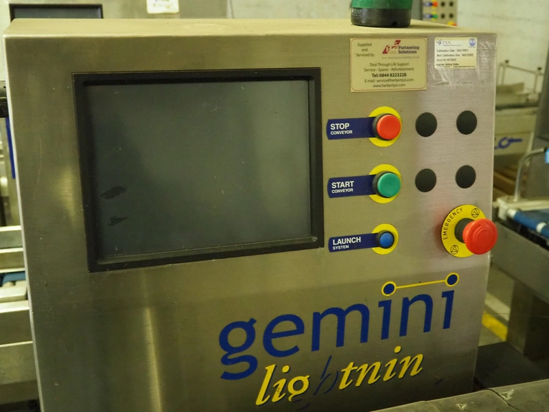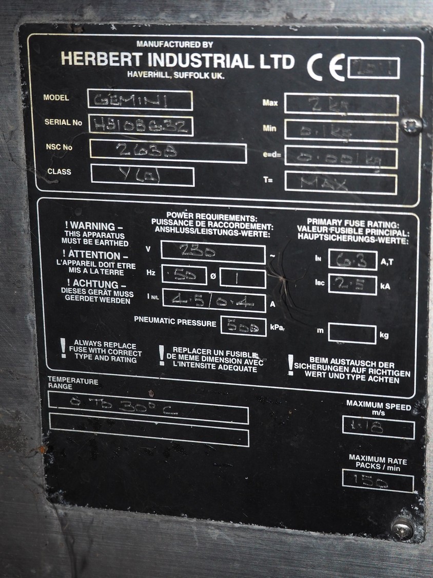 Herbert Industrial LTD. checkweigher, model: Gemini, serial number: HS108632, year of construction: 2011, 230 V, 1 Ph, 50 Hz, 4.5/0.4 A, capacity: 150 packages/minute, plastic belt, belt width: (2x) 100 mm, total dimensions: 1330 mm x 820 mm x 1730 mm.