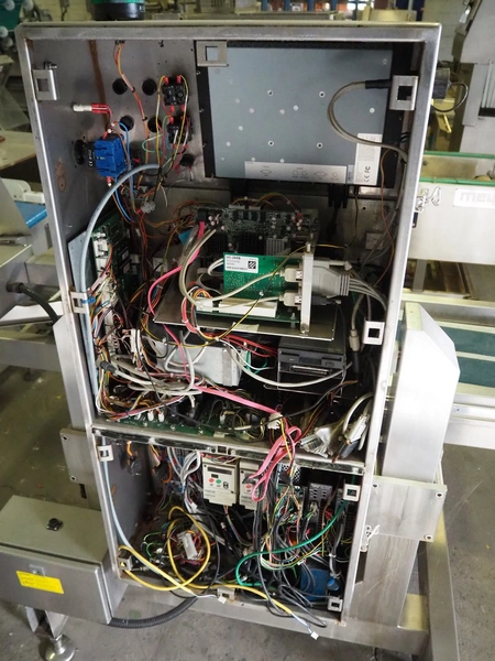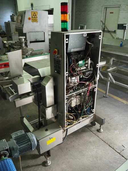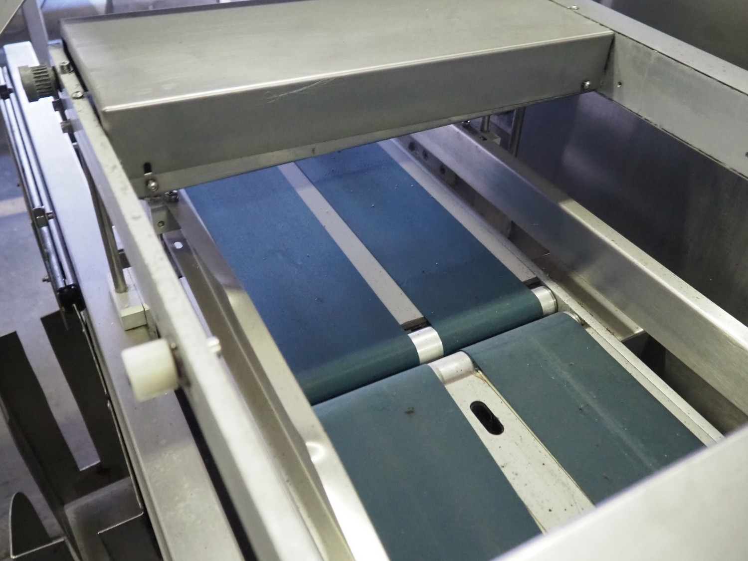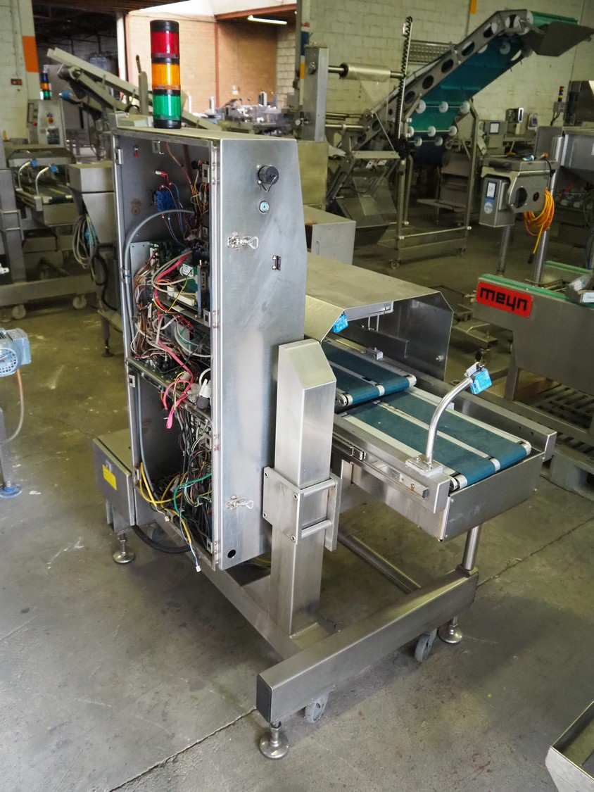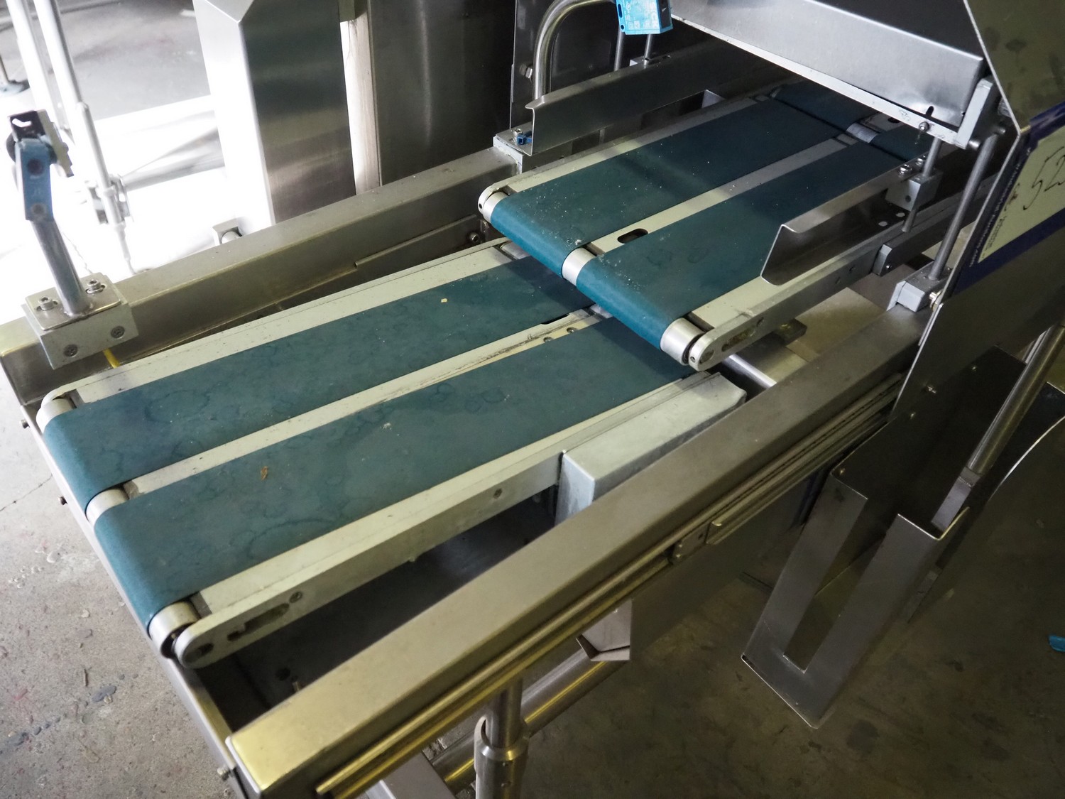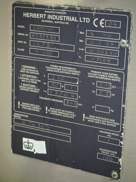 Herbert Industrial LTD checkweigher, model: GEMINI, serial number: HS82830, 230 V, 1 Ph, 50 Hz, 1.3/0.4 A, plastic belt, belt width: (2x) 100 mm, total dimensions: 1450 mm x 950 mm x 1730 mm. Incomplete, technical condition unknown.