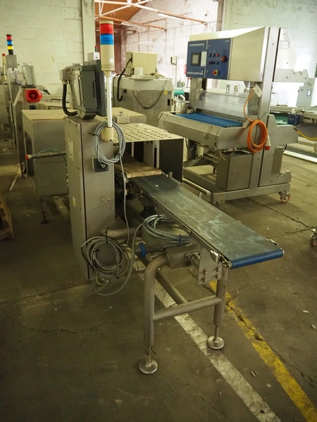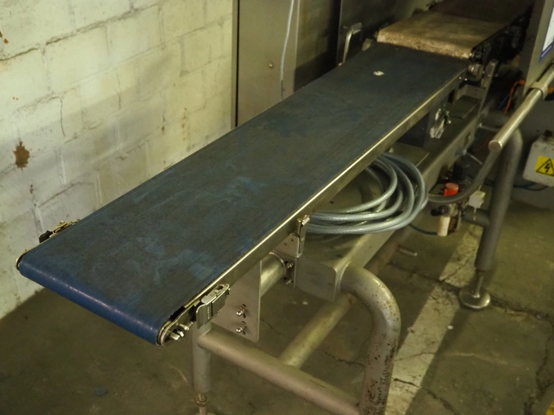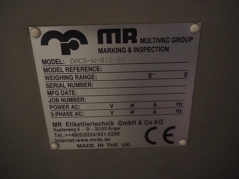 MR Etikettiertechnik GmbH checkweigher with rejector, model: DACS-W-012-SB/WP-I-N(CTS), serial number: 560215, year of construction: 04/2010, 240 V, 1 Ph, 50 Hz, 2 A, plastic belt, belt width: 220 mm, total dimensions: 1900 mm x 970 mm x 1650 mm.