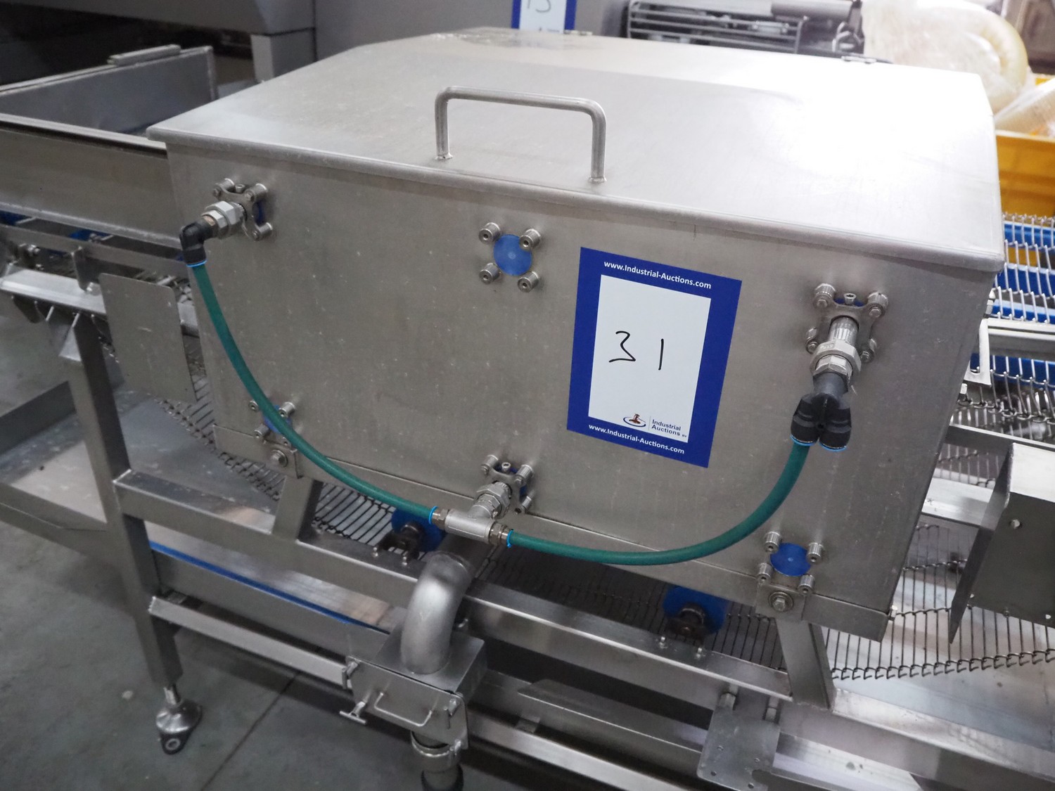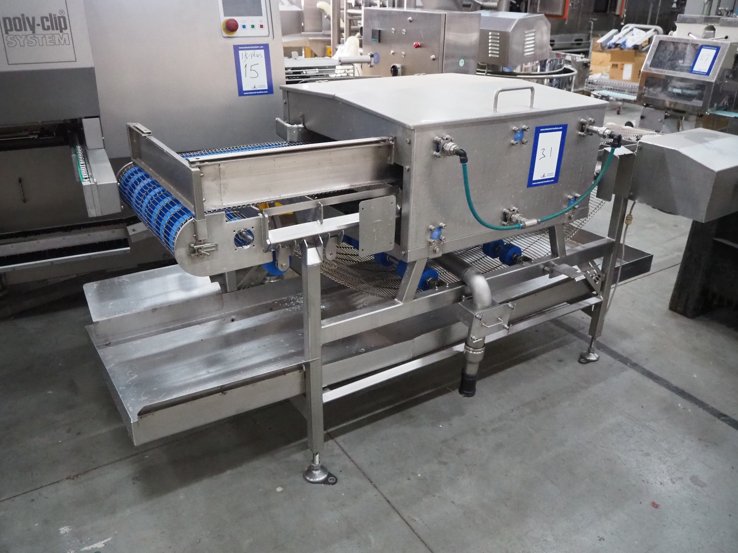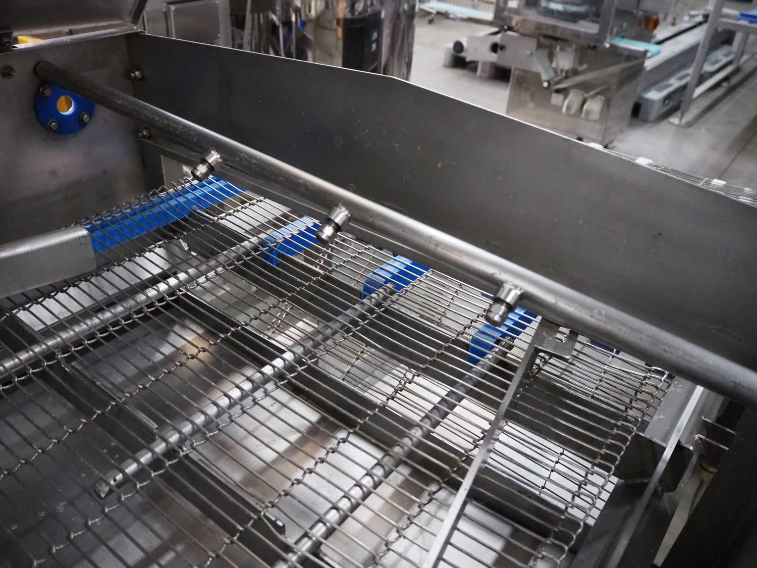Spraying belt, s/s frame, s/s mesh belt, belt width: 600 mm, clearance: 550 mm x 60 mm, total dimensions: 2200 mm x 1100 mm x 1200 mm.
