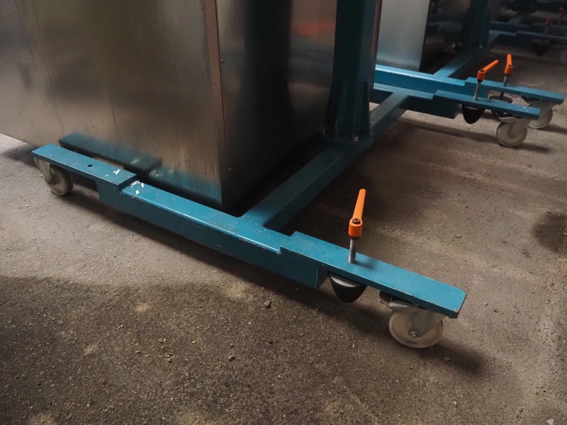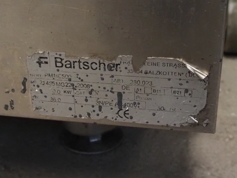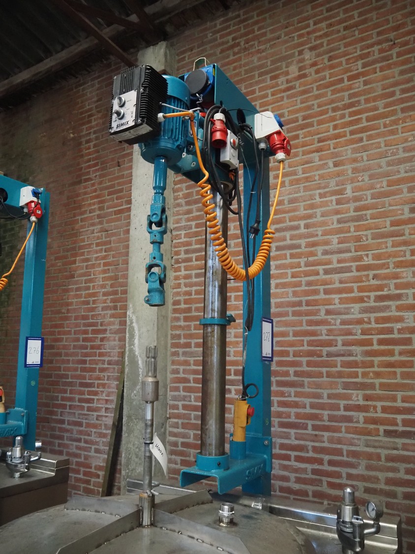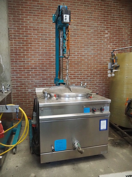 Bartscher cooking vessel with Simix mobile height adjustable mixer, type: PM1IE500, number: 21455MG22, year of construction: 2008, 400 V, 3 Ph, 50 Hz, volume: 500 liter, dimensions cooking vessel: 1150 mm x 1300 mm x 1250 mm, dimensions mobile mixer: 1500 mm x 1400 mm x 2800 mm.