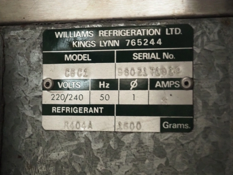 Williams Refrigeration refrigerator, model: CBC1, serial number: 9802171019, 220/240 V, 1 Ph, 50 Hz, 6 A, refrigerant: R404A, 1600 g, 3 floors, dimensions each floor: 530 mm x 330 mm, total dimensions: 700 mm x 700 mm x 800 mm.