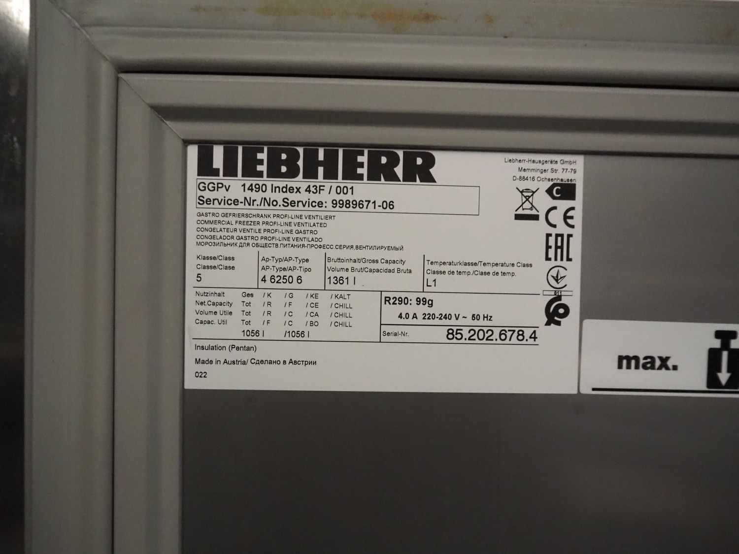 Liebherr-Hausgeräte GmbH s/s freezer, model: HHPv 1490 Index 43F / 001, serial number: 85.202.678.4, 220-240 V, 50 Hz, 4.0 A, brut volume: 1361 liter, net volume: 1056 liter, refrigerant: R290/99gram, dimensions: 1420 mm x 820 mm x 2140 mm.