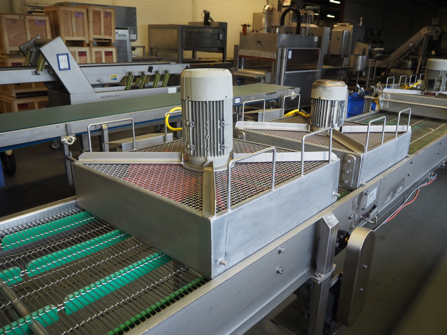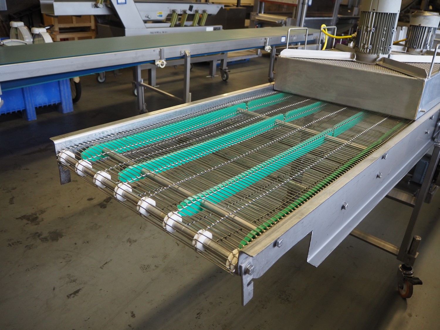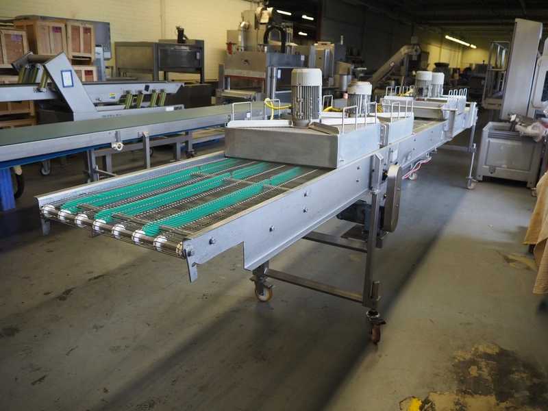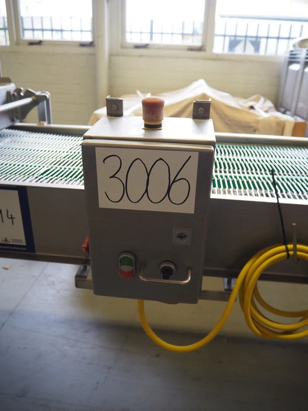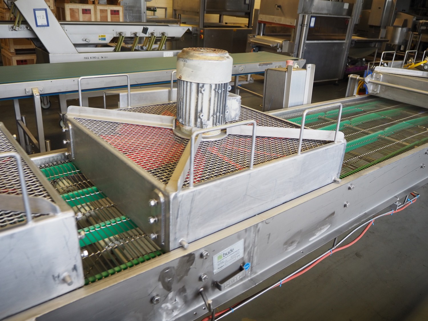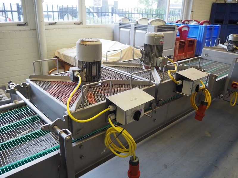 Budé cooling conveyor with 4 ventilators, type: 6000/600, serial number: E044183-1, 3 x 400 V, 50 Hz, 3.25 kW, s/s mesh belt, belt width: 600 mm, belt length: 6100 mm, total dimensions: 6100 mm x 1000 mm x 1550 mm.
