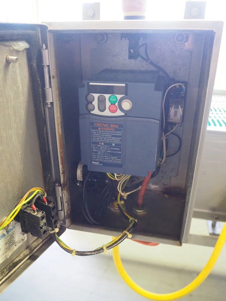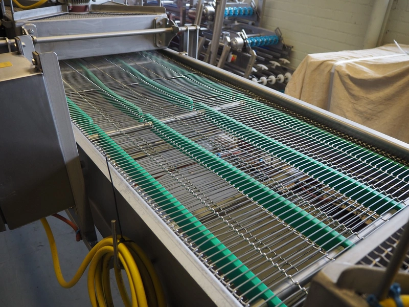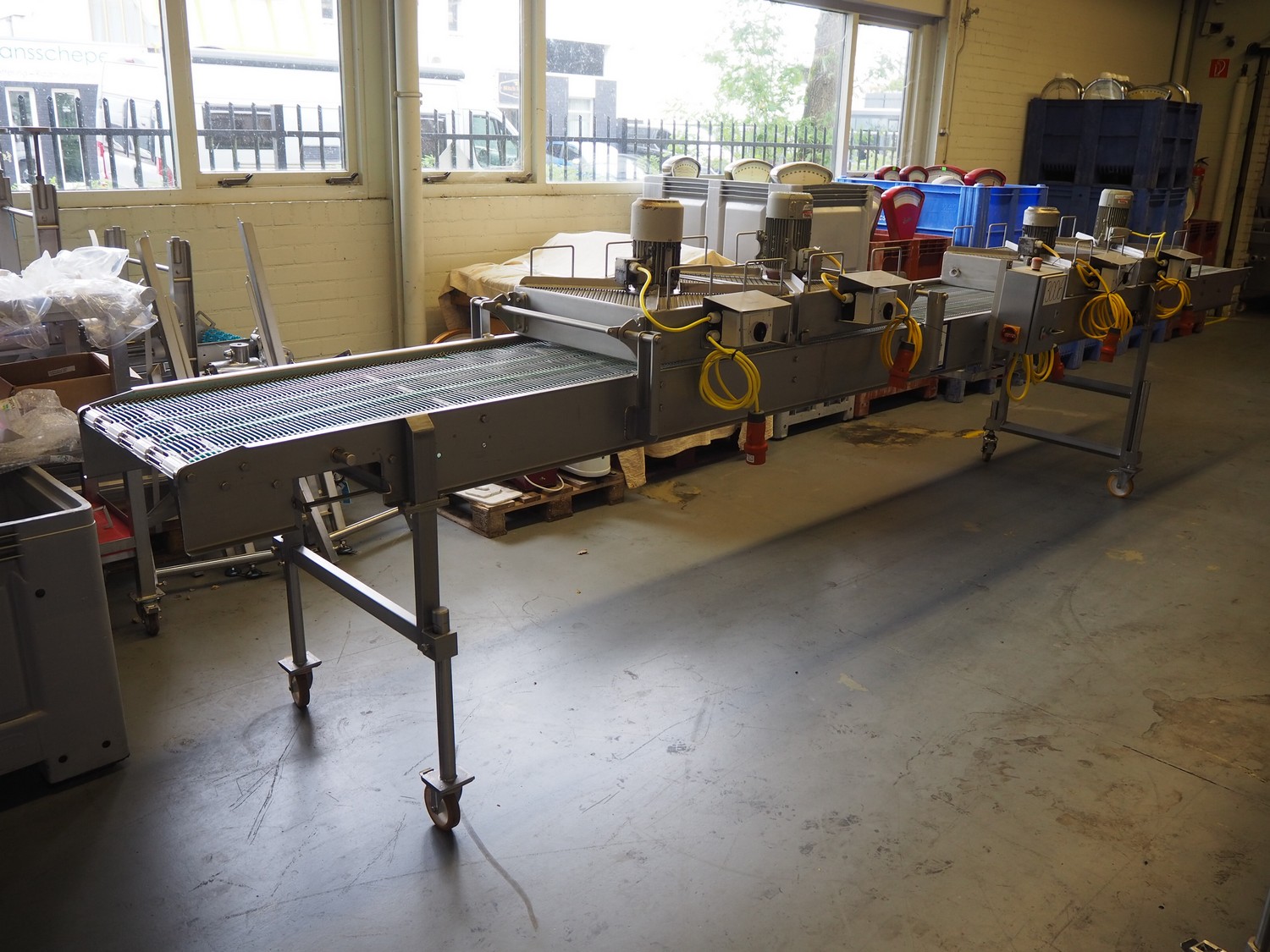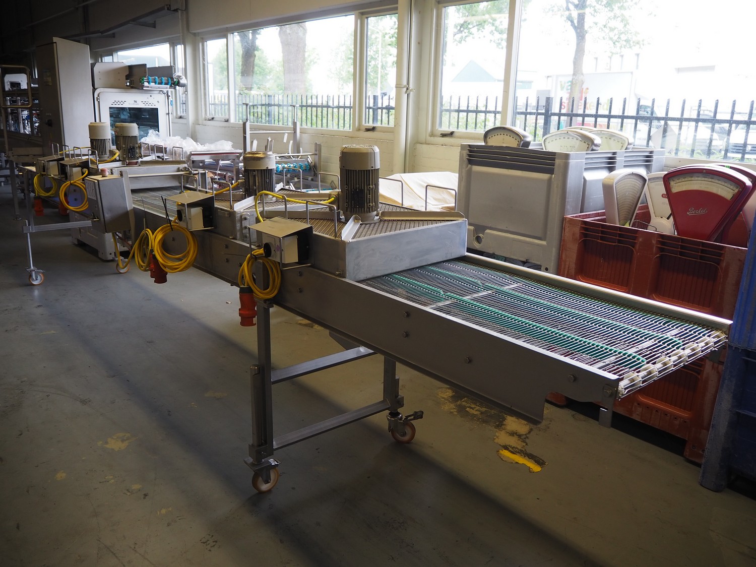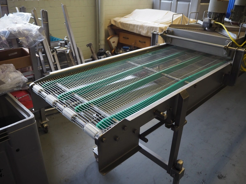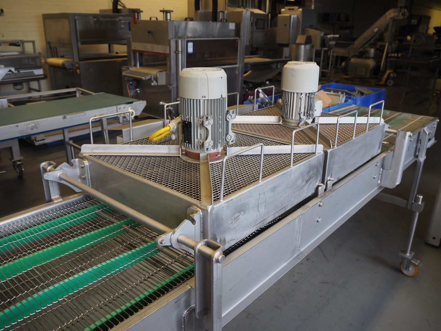 Budé cooling conveyor with 4 ventilators, type: 6000/600, serial number: E044183-1, 3 x 400 V, 50 Hz, 3.25 kW, s/s mesh belt, belt width: 600 mm, belt length: 6100 mm, total dimensions: 6100 mm x 1000 mm x 1550 mm.