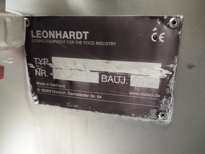 Leonhardt mobile dosing machine, type: TGS SERVO, serial number: 0140 1561 year of construction: 2018, s/s infeed hopper, dimensions hopper: Ø 560 mm x 500 mm, total dimensions: 1400 mm x 1000 mm x 1950 mm. Incomplete.