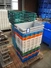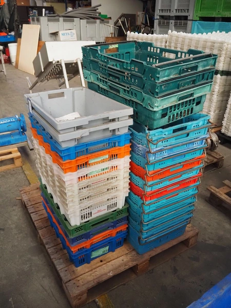 Pallet with large amount of various plastic crates, total dimensions: 1200 mm x 1000 mm x 1400 mm.
