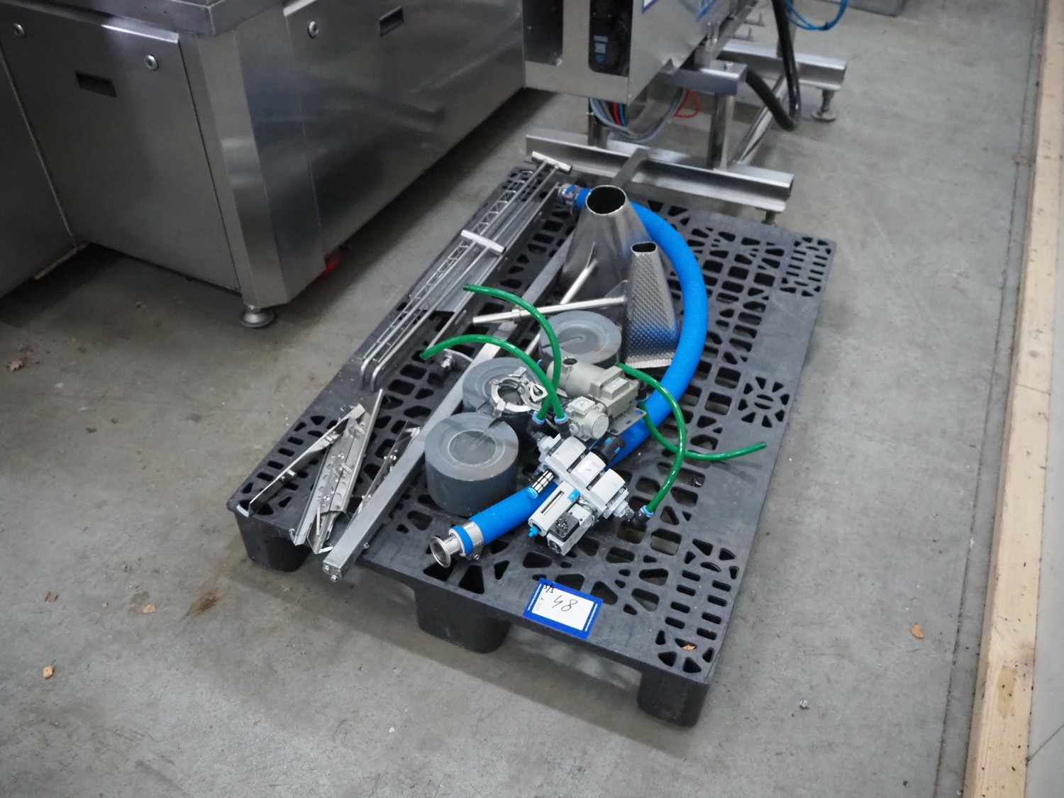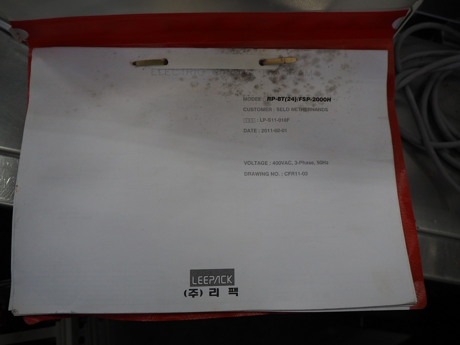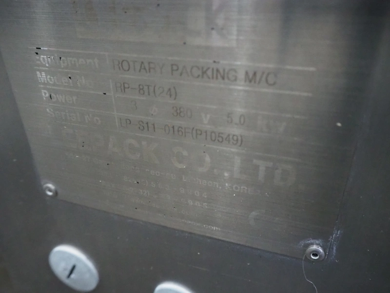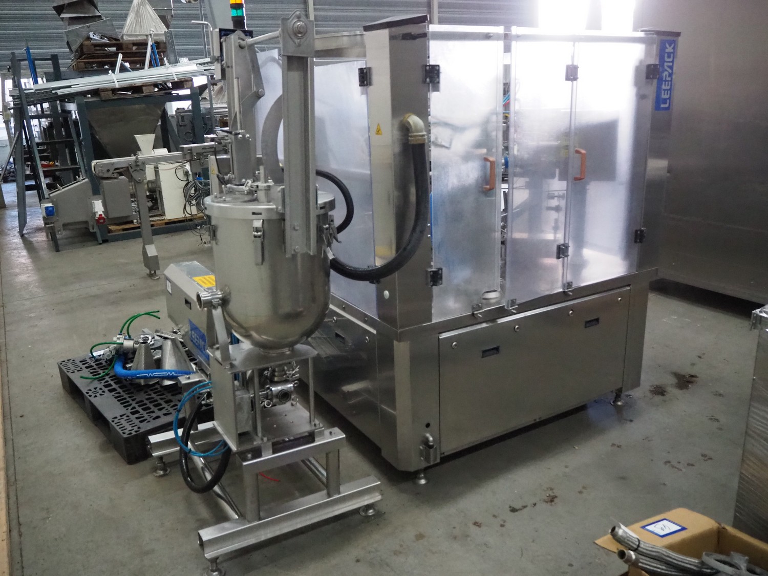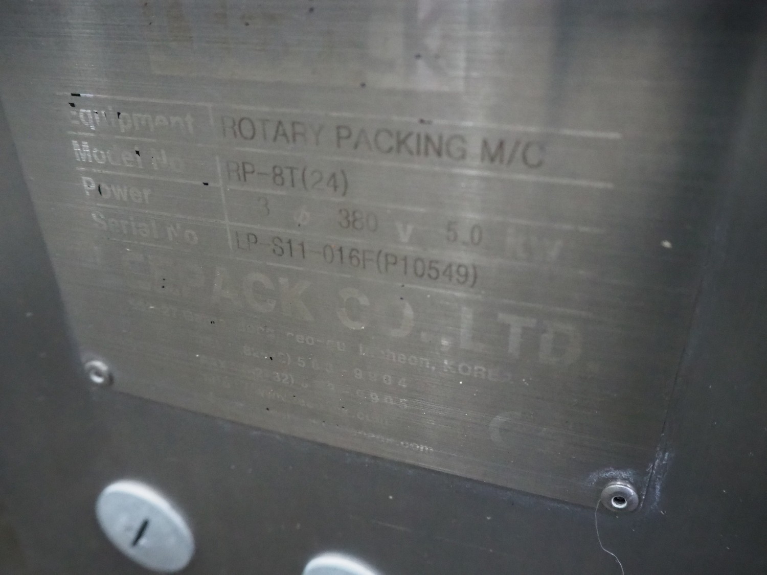 Leepack rotary filling machine for pouches, model number: RP-8T, serial number: LP-S11-016F(P10549), 380 V, 3 Ph, 5.0 kW, 8 stations, seal length: (8x) 260 mm, belt width outfeed belt: 280 mm, total dimensions: 3000 mm x 2200 mm x 2300 mm, including Leepack liquid filler, model number: FSP-2000H, serial number: LP-S11-016F(P1005T), dimensions: 1500 mm x 700 mm x 1900 mm and pallet with parts, dimensions: 1200 mm x 800 mm x 350 mm.