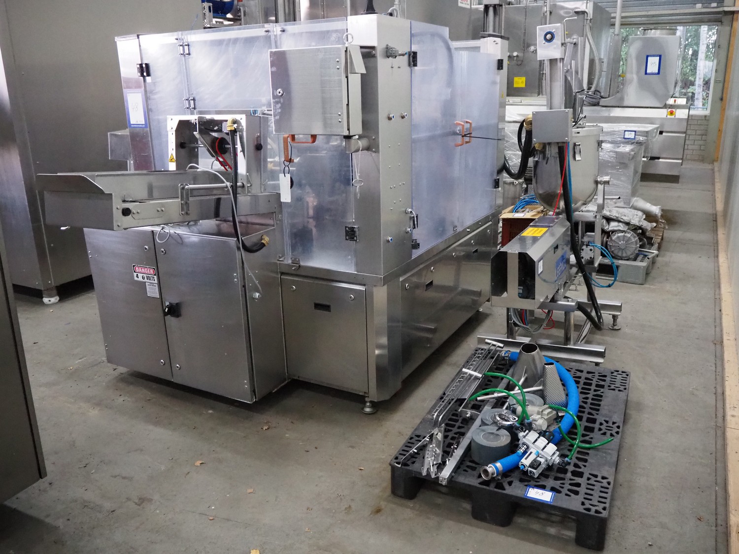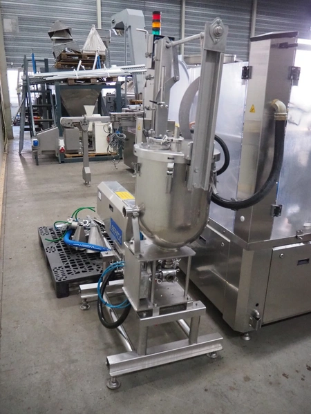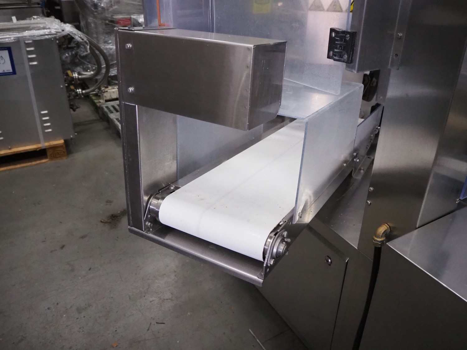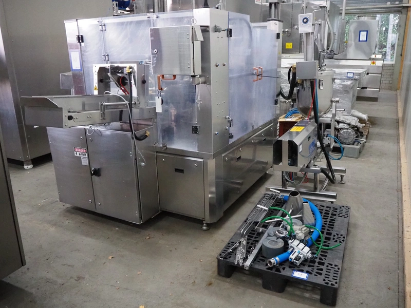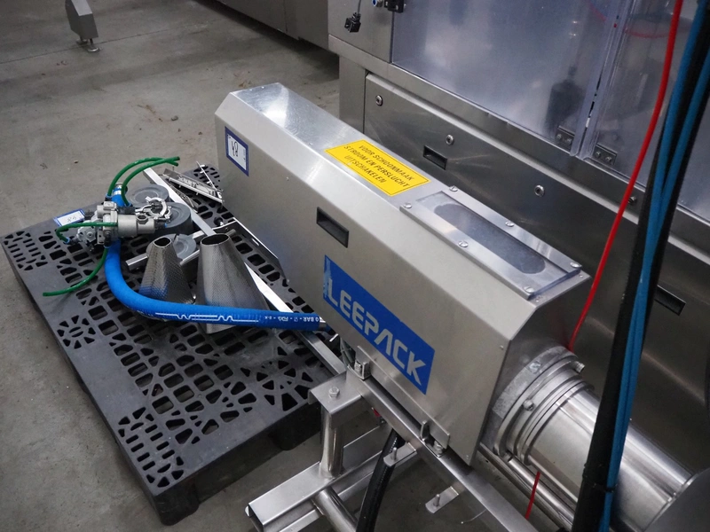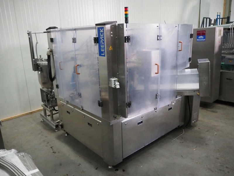 Leepack rotary filling machine for pouches, model number: RP-8T, serial number: LP-S11-016F(P10549), 380 V, 3 Ph, 5.0 kW, 8 stations, seal length: (8x) 260 mm, belt width outfeed belt: 280 mm, total dimensions: 3000 mm x 2200 mm x 2300 mm, including Leepack liquid filler, model number: FSP-2000H, serial number: LP-S11-016F(P1005T), dimensions: 1500 mm x 700 mm x 1900 mm and pallet with parts, dimensions: 1200 mm x 800 mm x 350 mm.