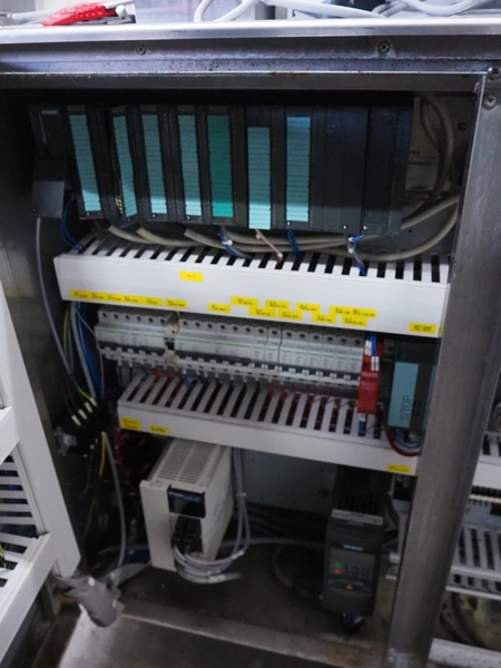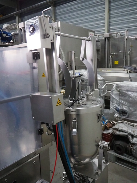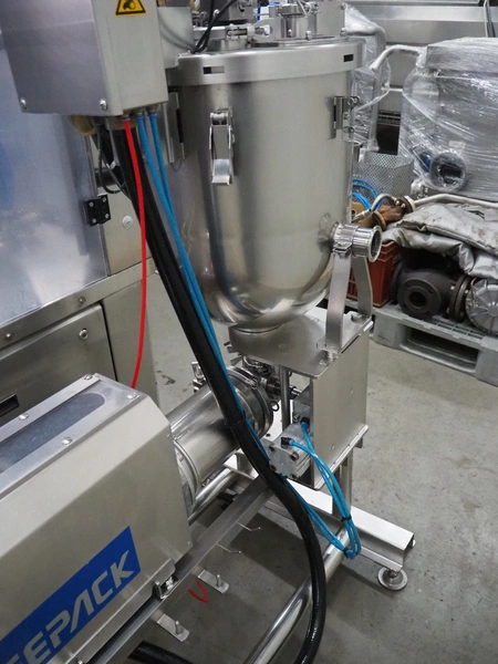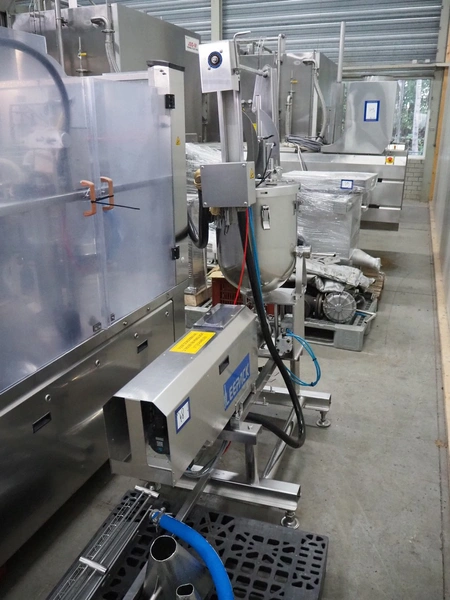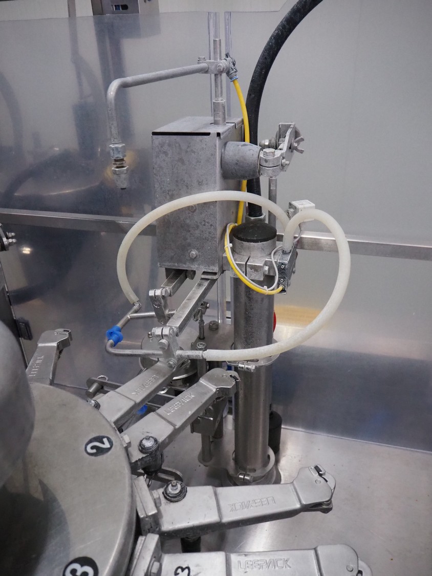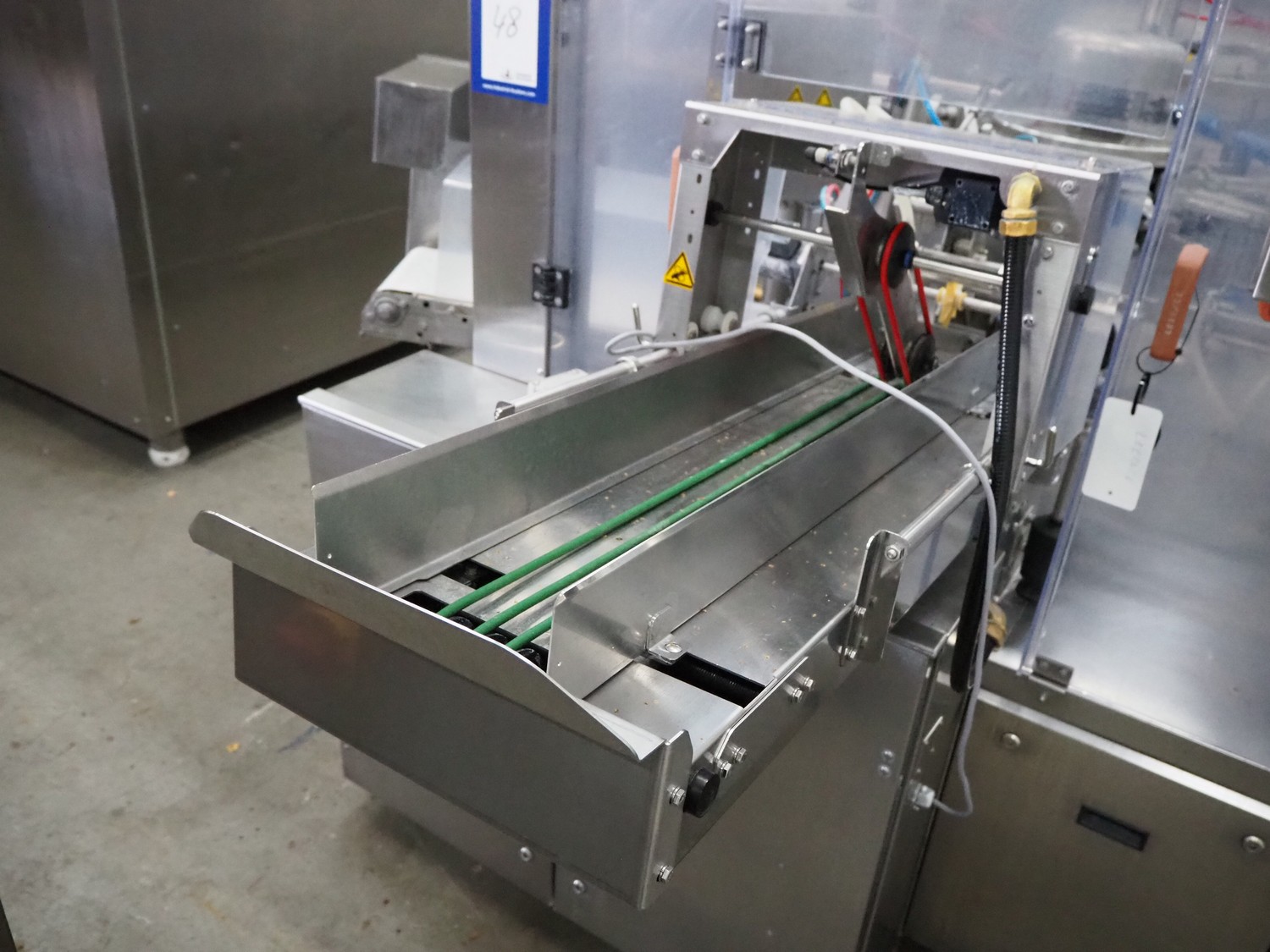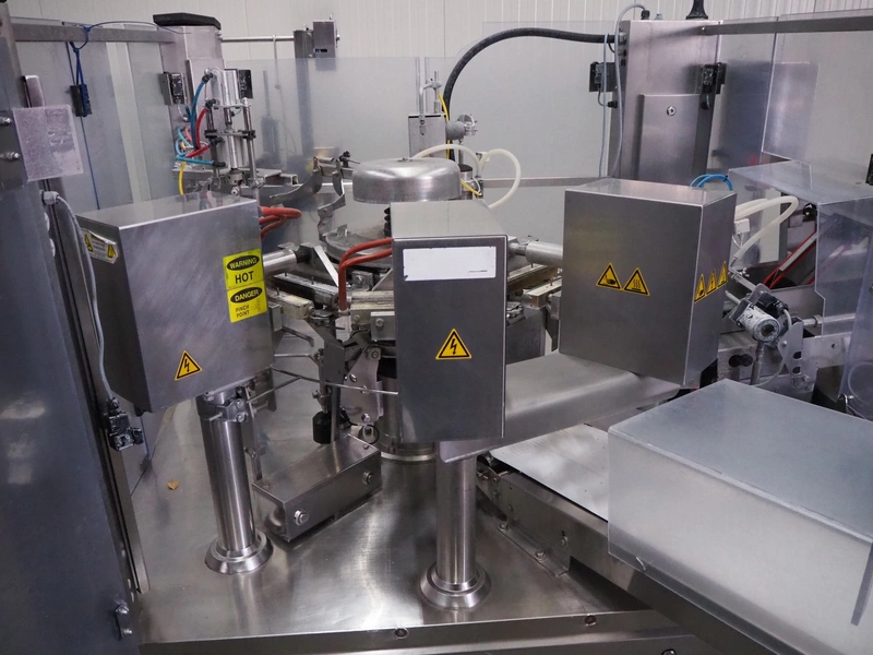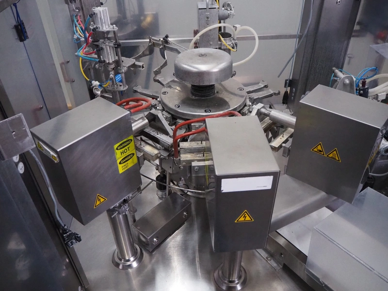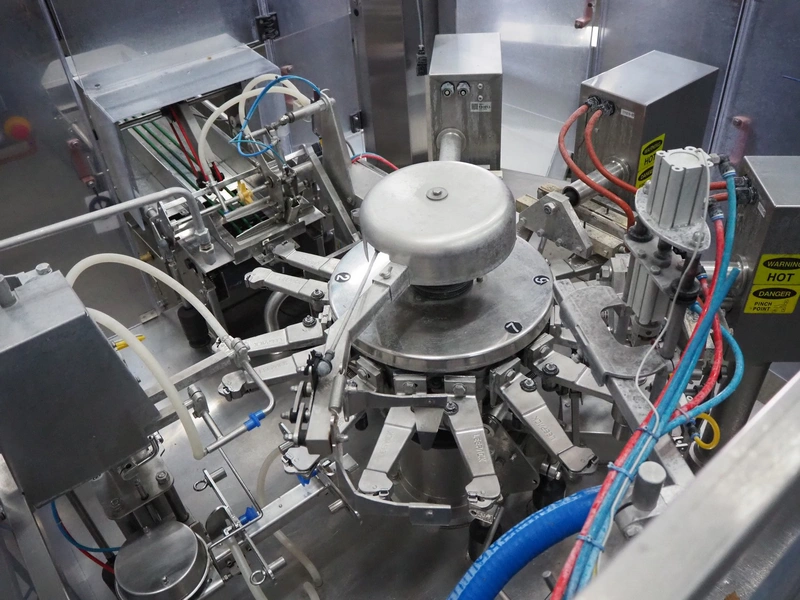 Leepack rotary filling machine for pouches, model number: RP-8T, serial number: LP-S11-016F(P10549), 380 V, 3 Ph, 5.0 kW, 8 stations, seal length: (8x) 260 mm, belt width outfeed belt: 280 mm, total dimensions: 3000 mm x 2200 mm x 2300 mm, including Leepack liquid filler, model number: FSP-2000H, serial number: LP-S11-016F(P1005T), dimensions: 1500 mm x 700 mm x 1900 mm and pallet with parts, dimensions: 1200 mm x 800 mm x 350 mm.