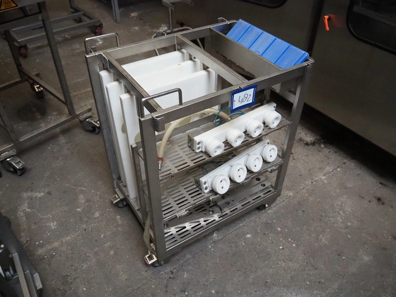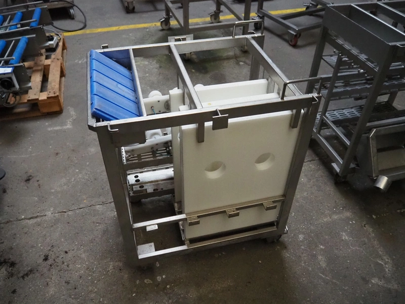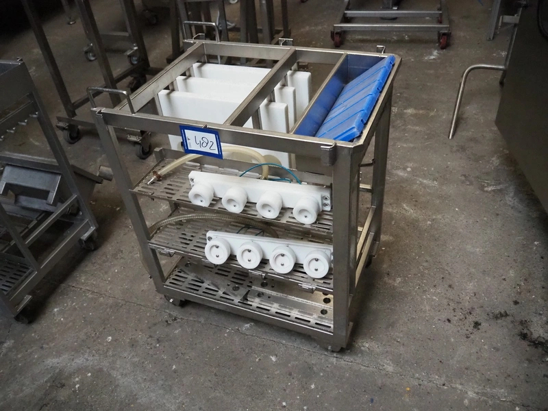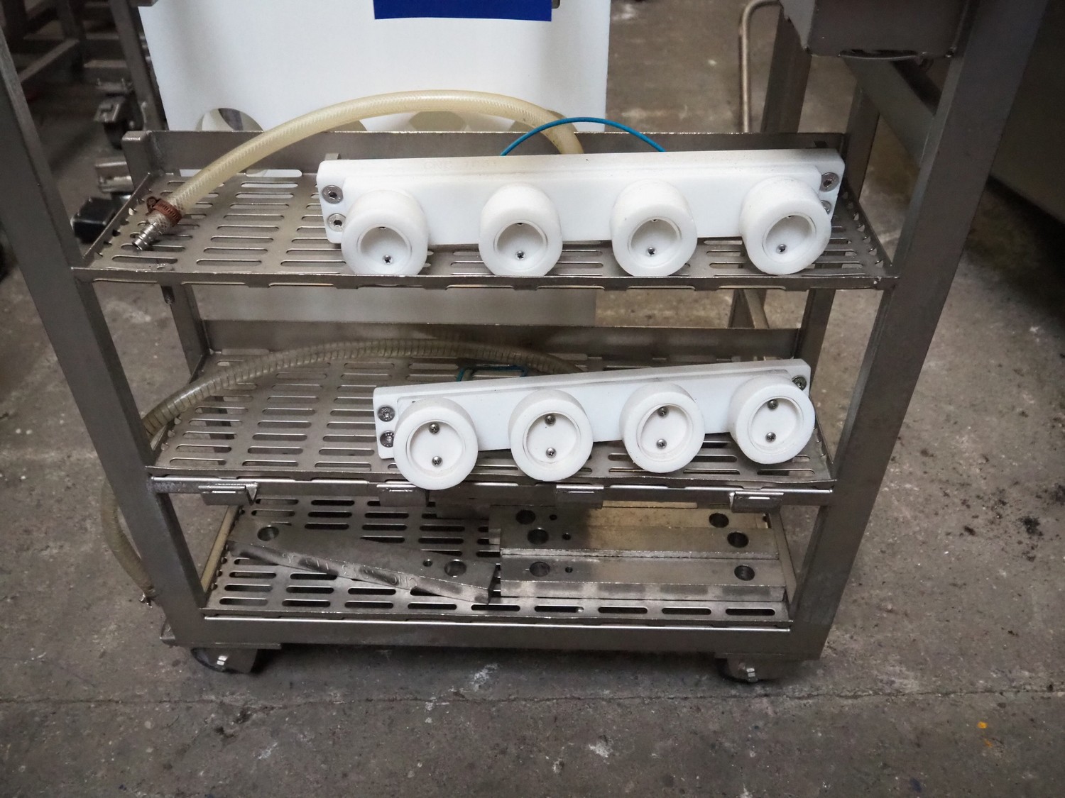 S/s trolley with forms for GEA MultiFormer400 forming machine, diameter: (2x) 75 mm and (1x) 70 mm, total dimensions: 700 mm x 520 mm x 880 mm.