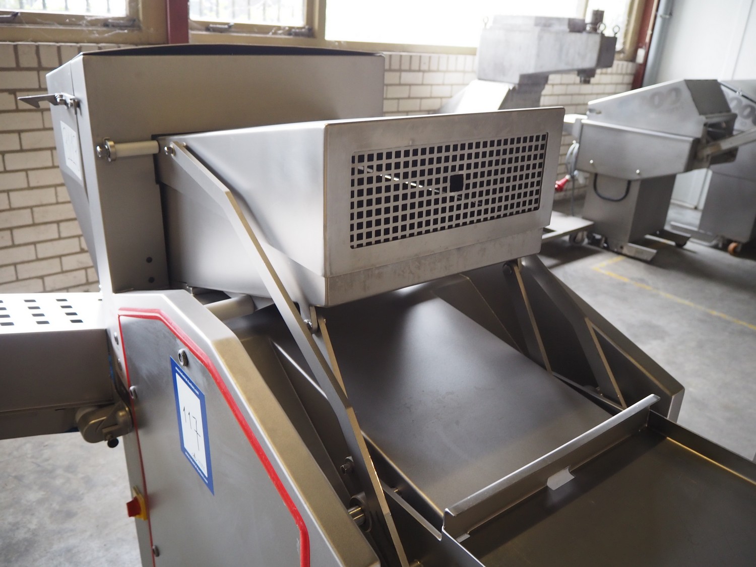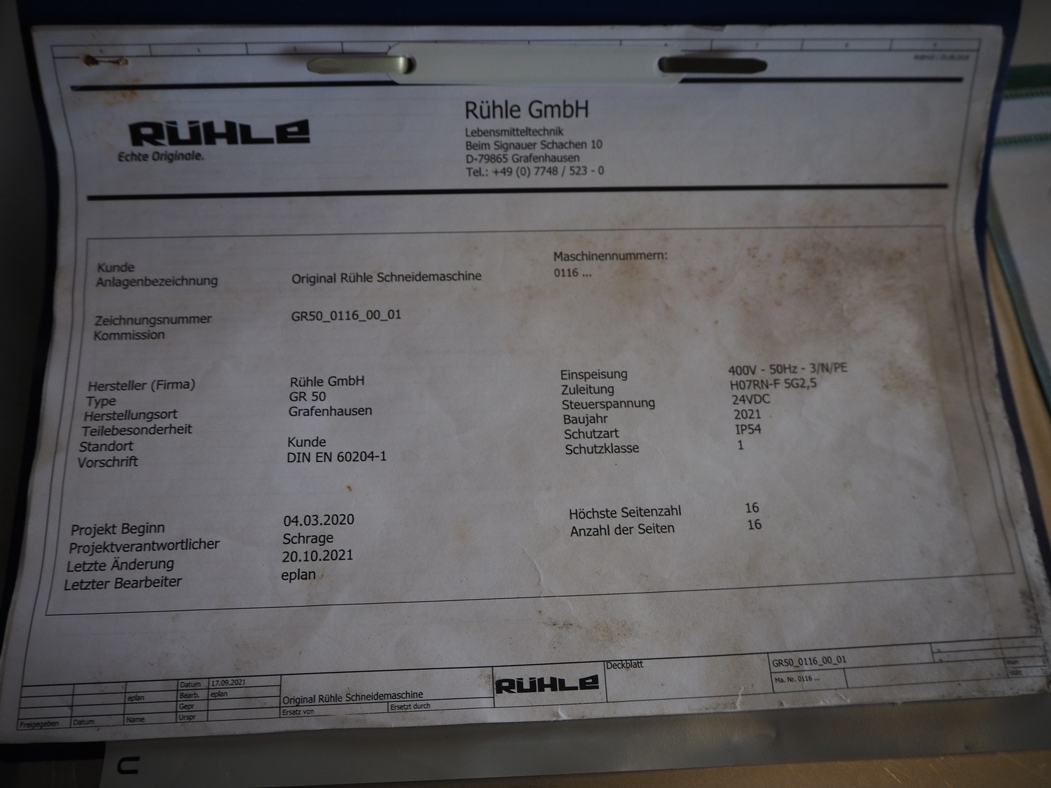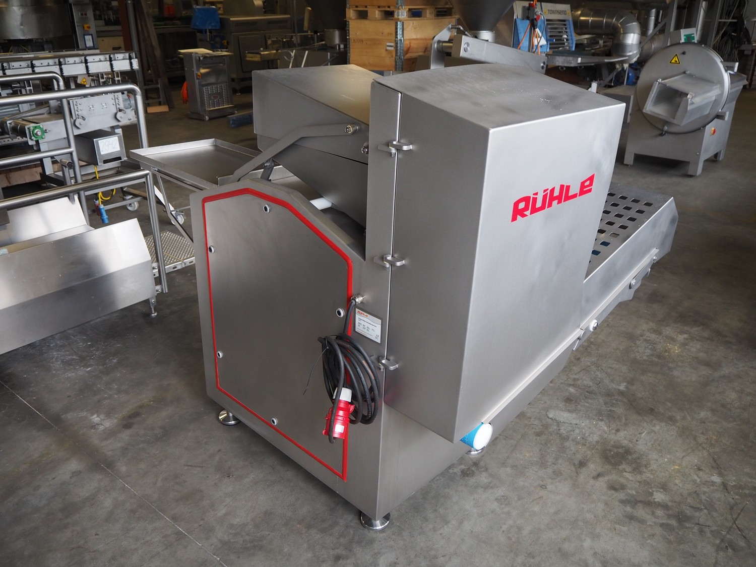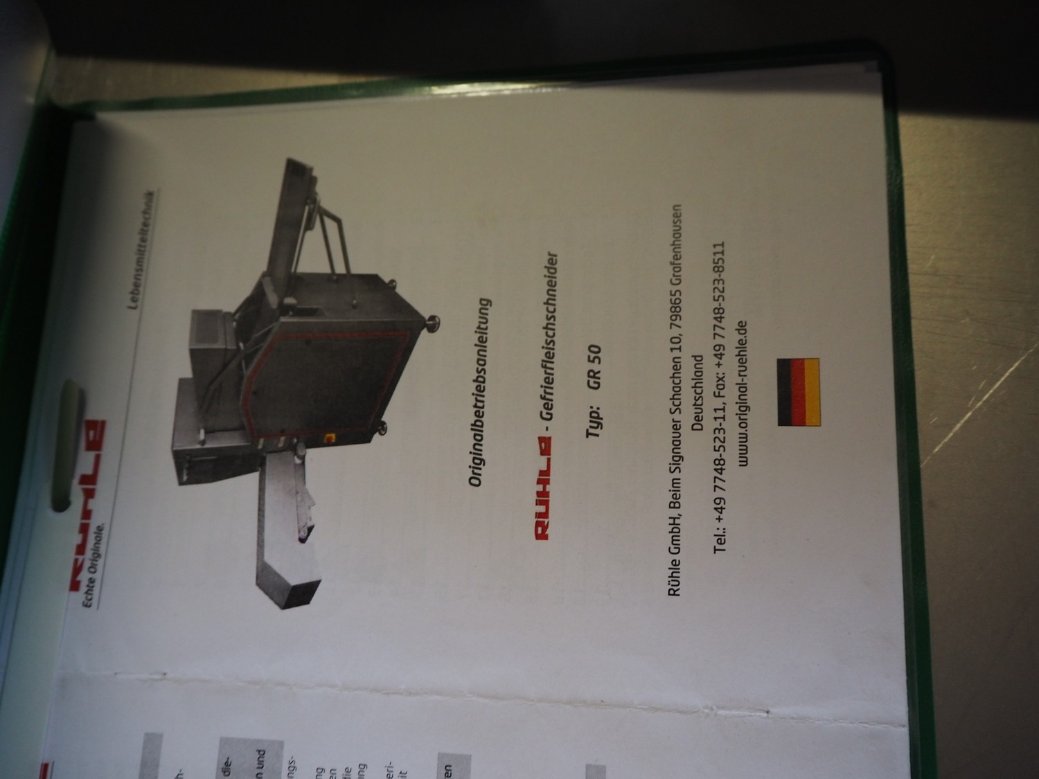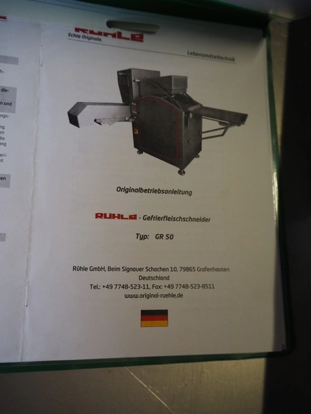 Rühle frozen meat cutter, type: GR 50, serial number: 60040116, year of construction: 2021, 3 x 400 V, 50 Hz, 6.9 kW, weight: 630 kg, block size: 680 mm x 440 mm x 250 mm, speed: 45 cuts / minute, plastic belt, belt width: 260 mm, total dimensions: 1500 mm x 1950 mm x 1500 mm.