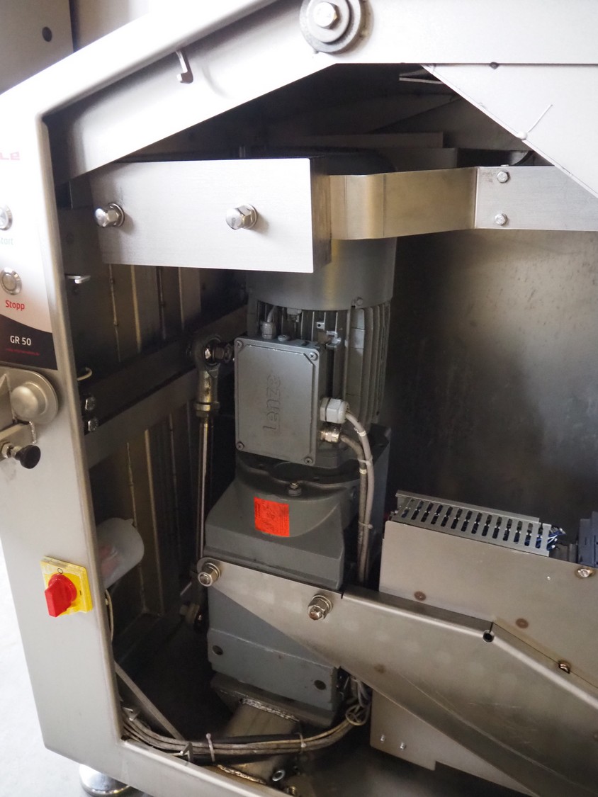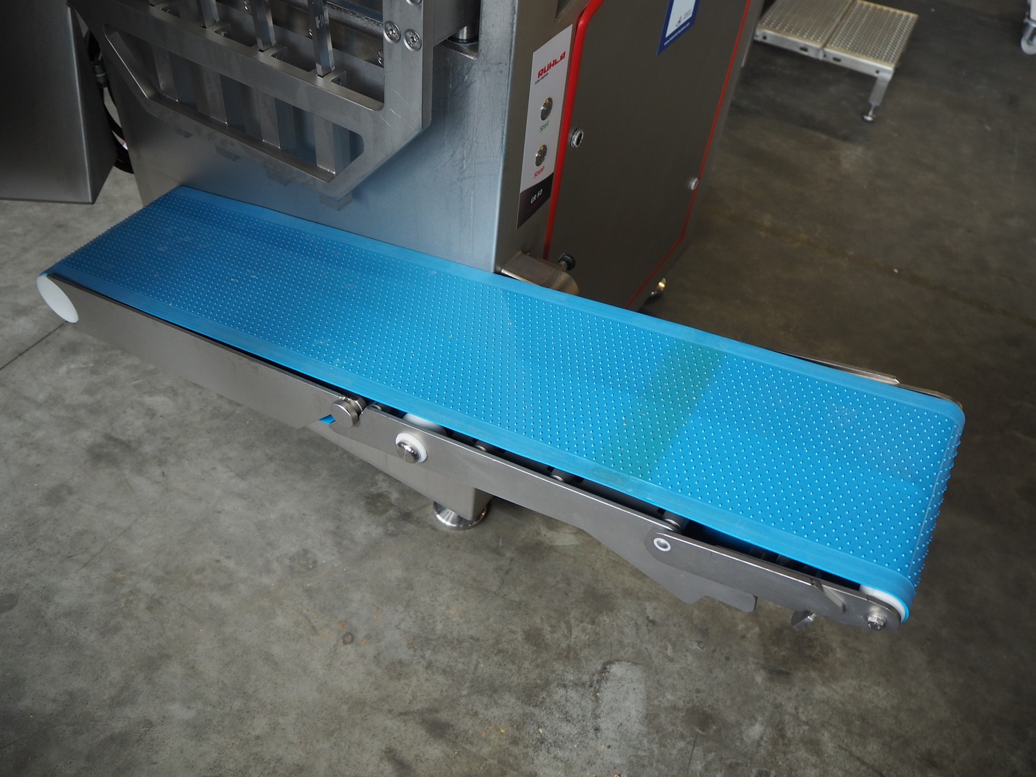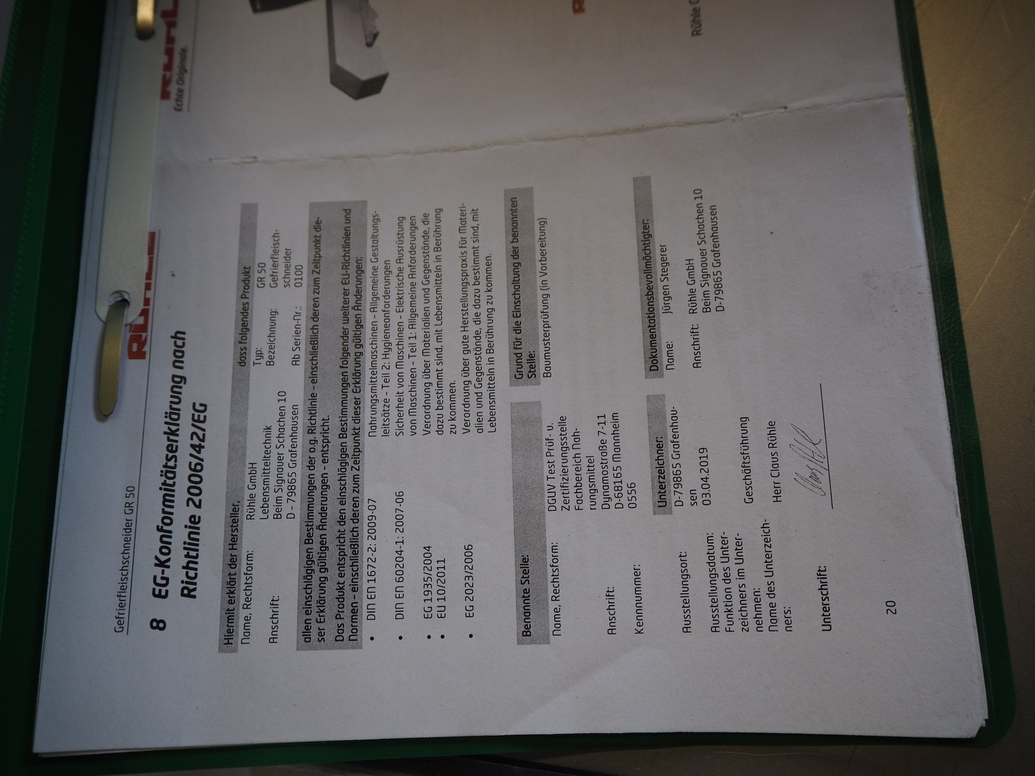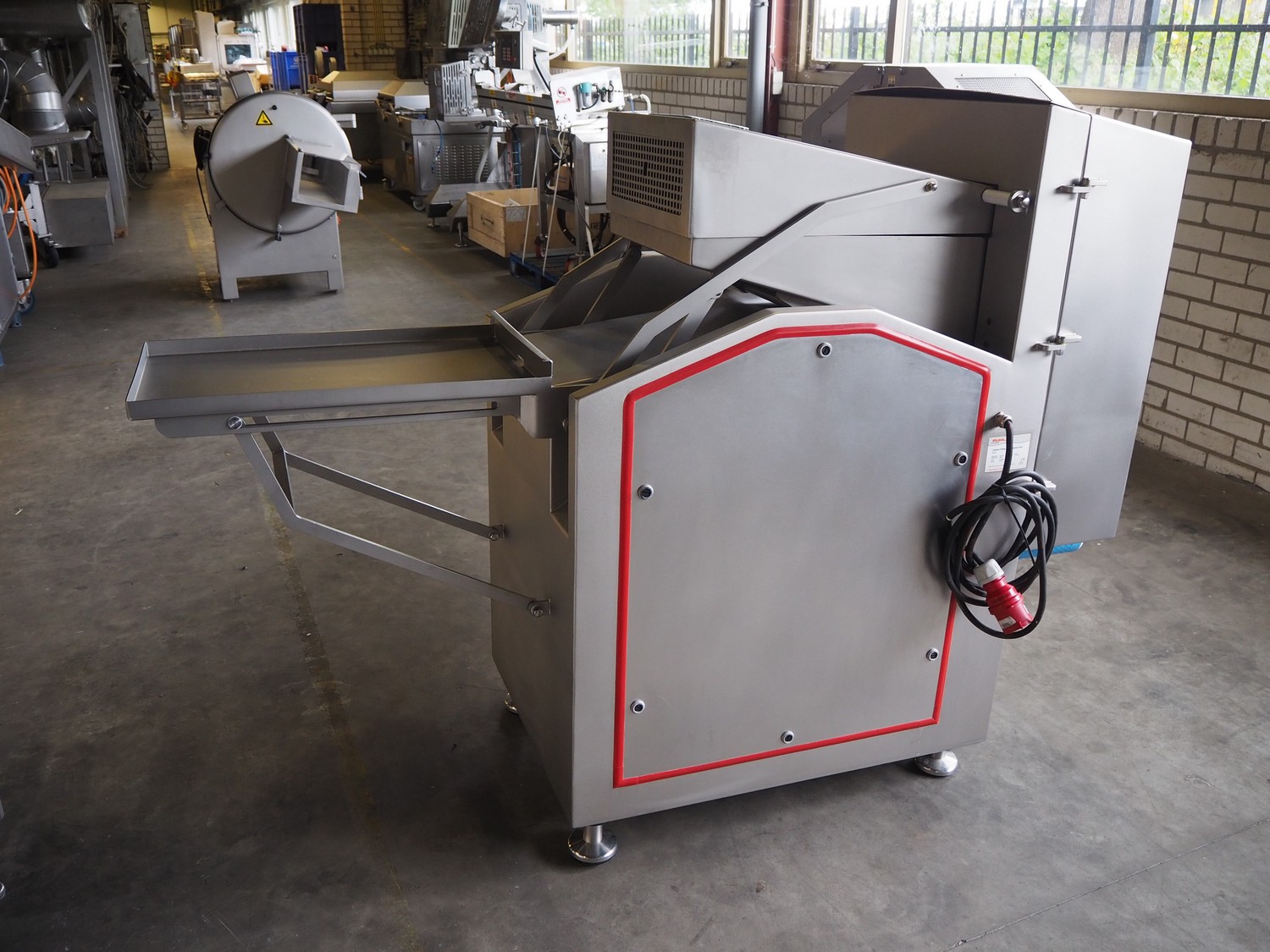 Rühle frozen meat cutter, type: GR 50, serial number: 60040116, year of construction: 2021, 3 x 400 V, 50 Hz, 6.9 kW, weight: 630 kg, block size: 680 mm x 440 mm x 250 mm, speed: 45 cuts / minute, plastic belt, belt width: 260 mm, total dimensions: 1500 mm x 1950 mm x 1500 mm.