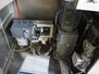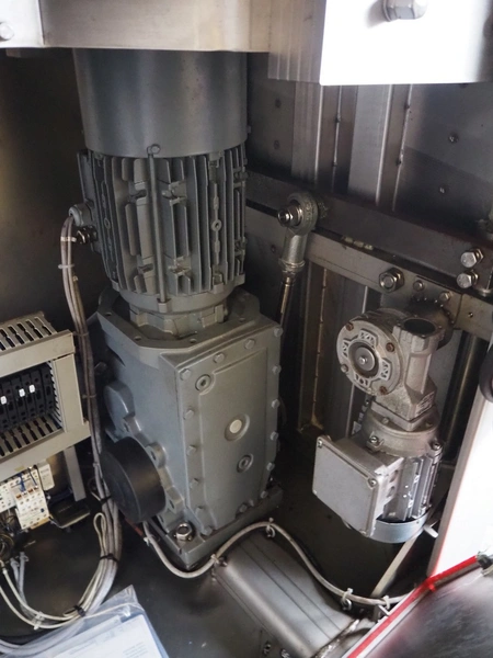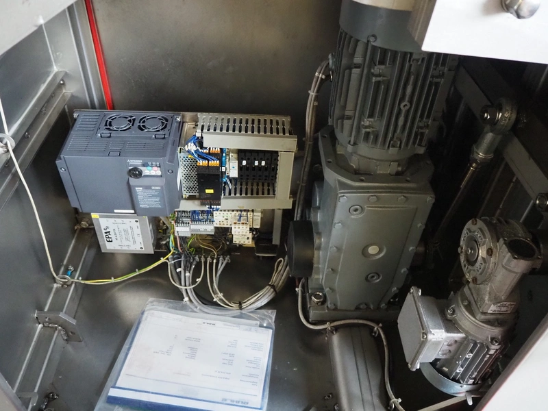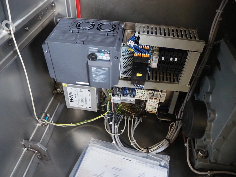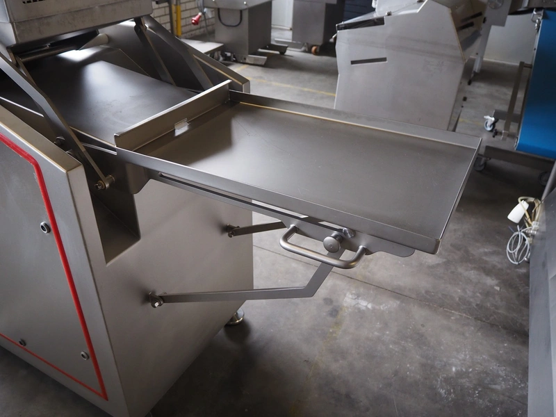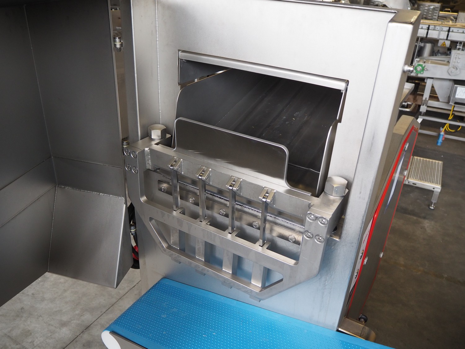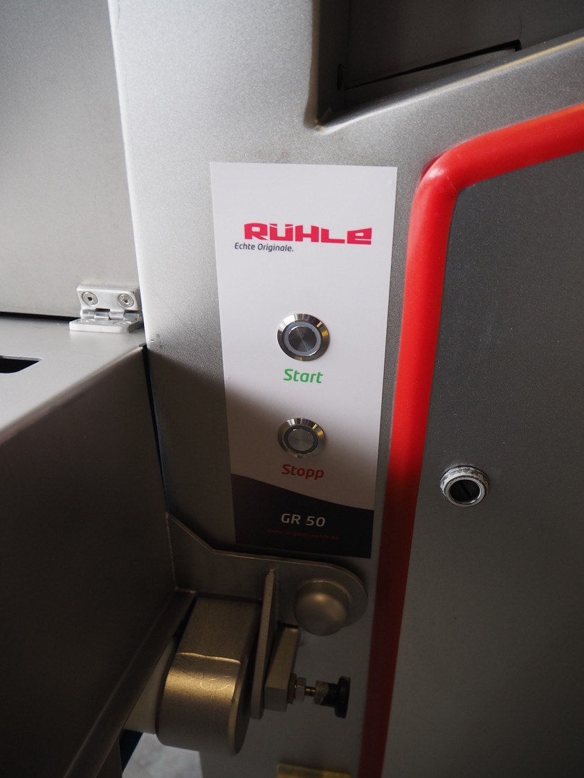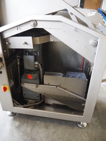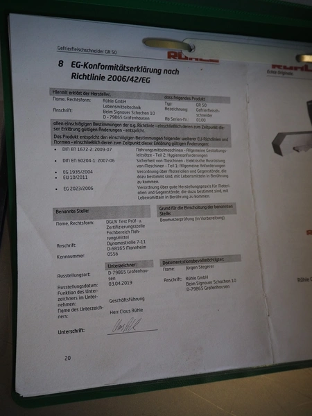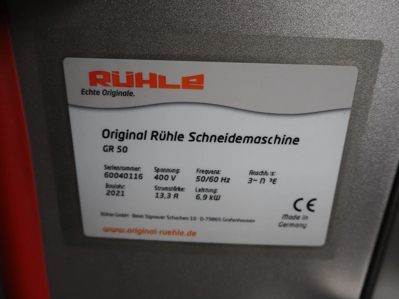 Rühle frozen meat cutter, type: GR 50, serial number: 60040116, year of construction: 2021, 3 x 400 V, 50 Hz, 6.9 kW, weight: 630 kg, block size: 680 mm x 440 mm x 250 mm, speed: 45 cuts / minute, plastic belt, belt width: 260 mm, total dimensions: 1500 mm x 1950 mm x 1500 mm.