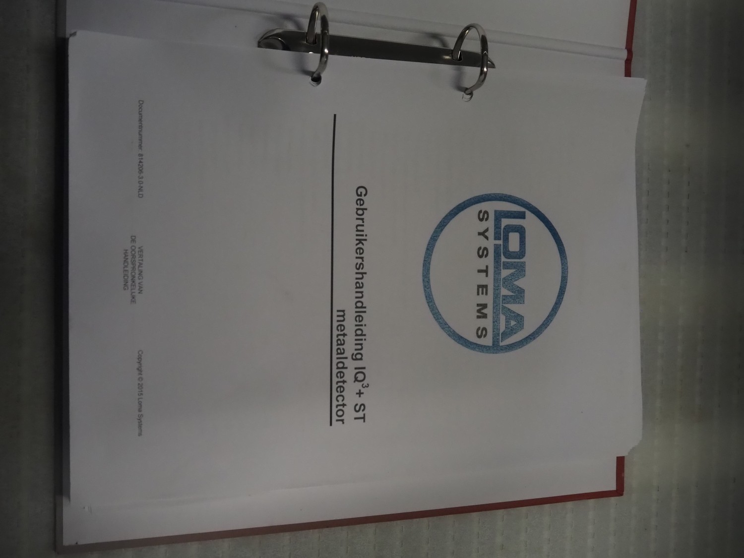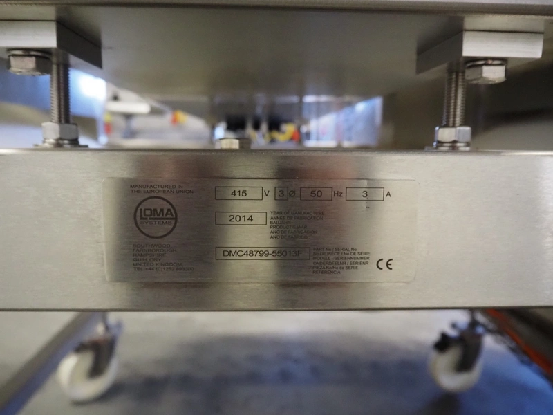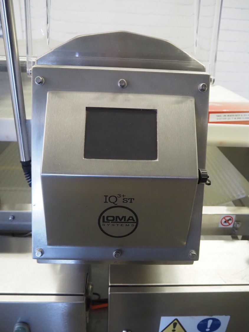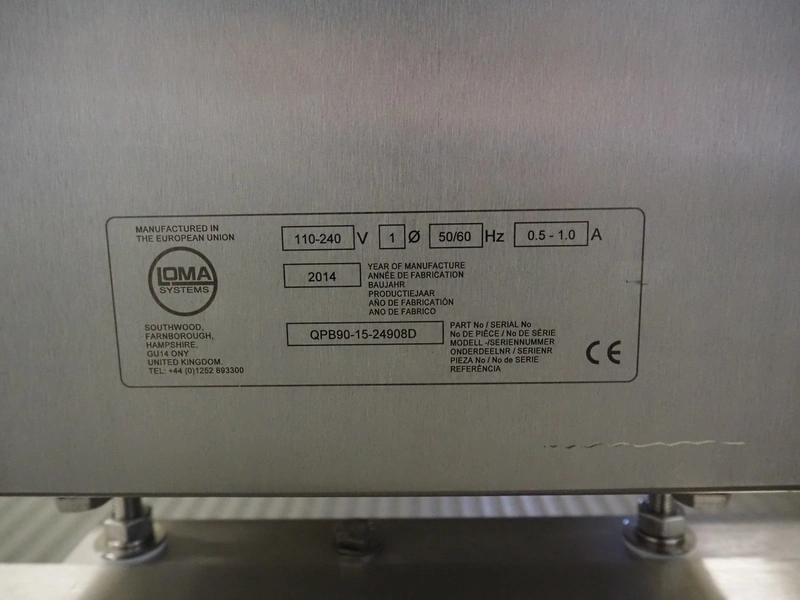 Loma Systems mobile metal detector with rejector, model: IQ³+ST, serial number: QPB90-15-24908D, year of construction: 2014, 110-240 V, 1 Ph, 50/60 Hz, 0.5-1.0 A, plastic mesh belt, belt width: 860 mm, clearance: 860 mm x 160 mm, total dimensions: 2400 mm x 1500 mm x 1700 mm.
