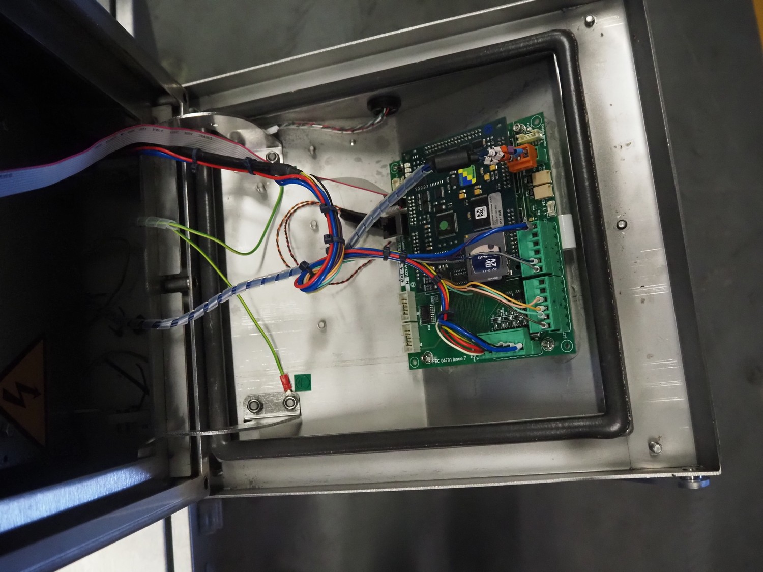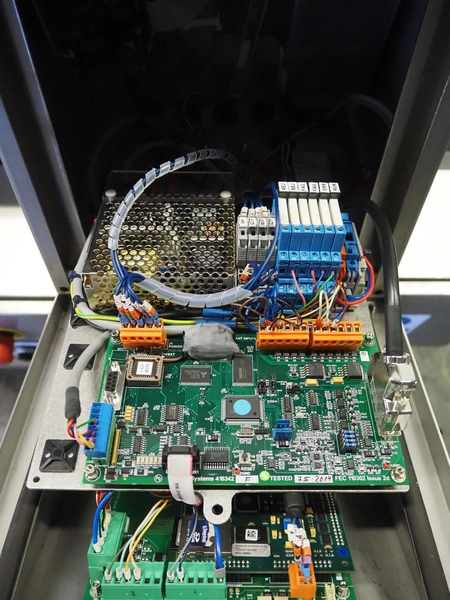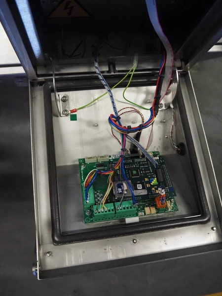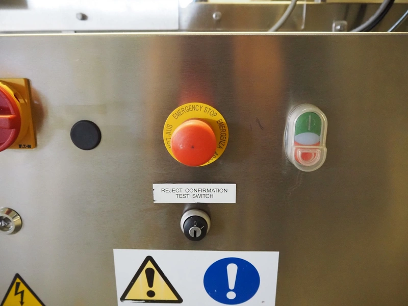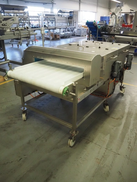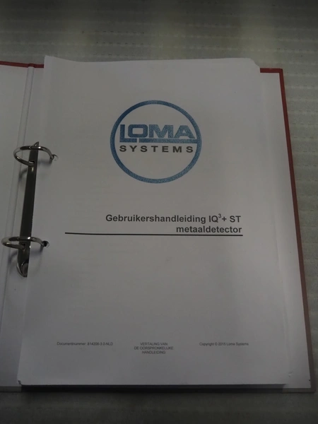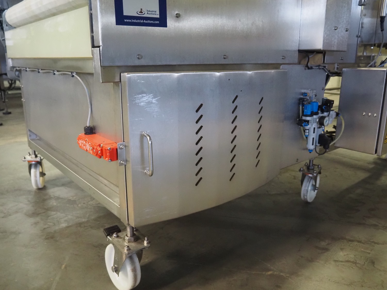 Loma Systems mobile metal detector with rejector, model: IQ³+ST, serial number: QPB90-15-24908D, year of construction: 2014, 110-240 V, 1 Ph, 50/60 Hz, 0.5-1.0 A, plastic mesh belt, belt width: 860 mm, clearance: 860 mm x 160 mm, total dimensions: 2400 mm x 1500 mm x 1700 mm.