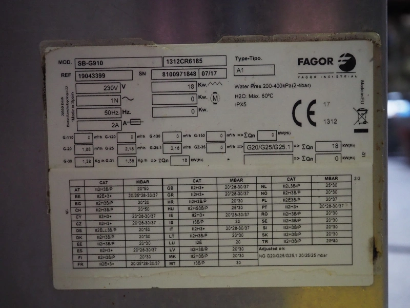 Fagor roasting pan, type: SB-G910, serial number: 8100971848, year of construction: 07/2017, 230 V, 1 Ph, 50 Hz, 2 A, 18 kW, inside dimensions: 700 mm x 600 mm x 200 mm, total dimensions: 1000 mm x 800 mm x 850 mm.