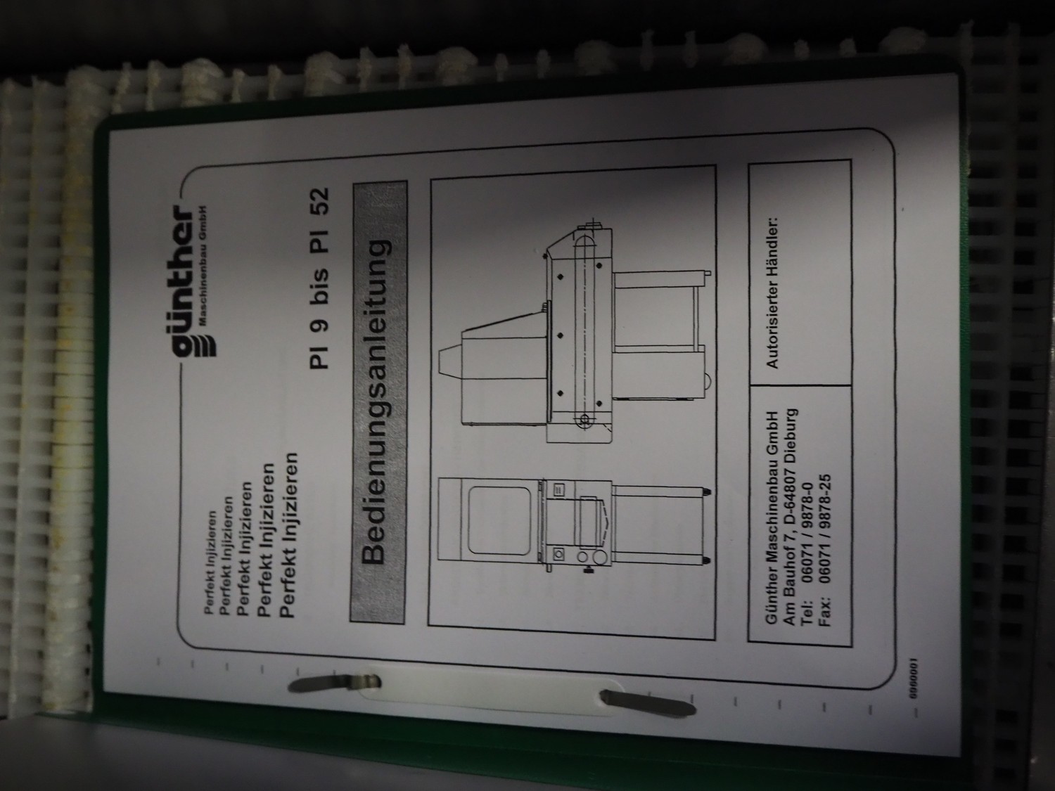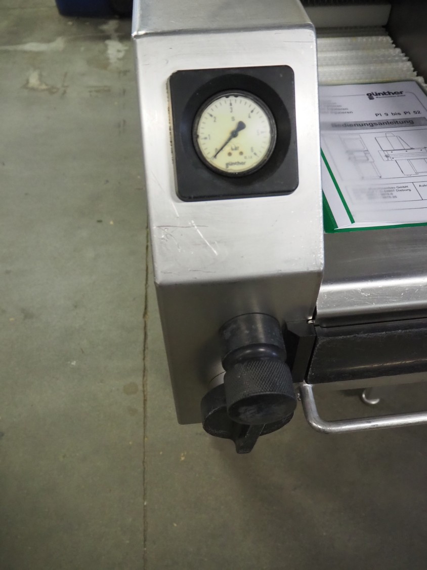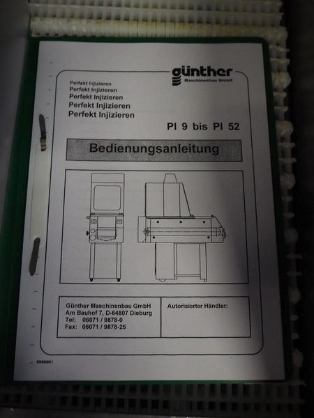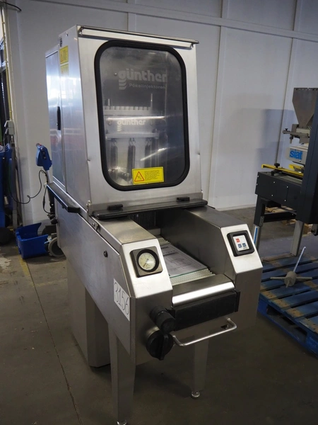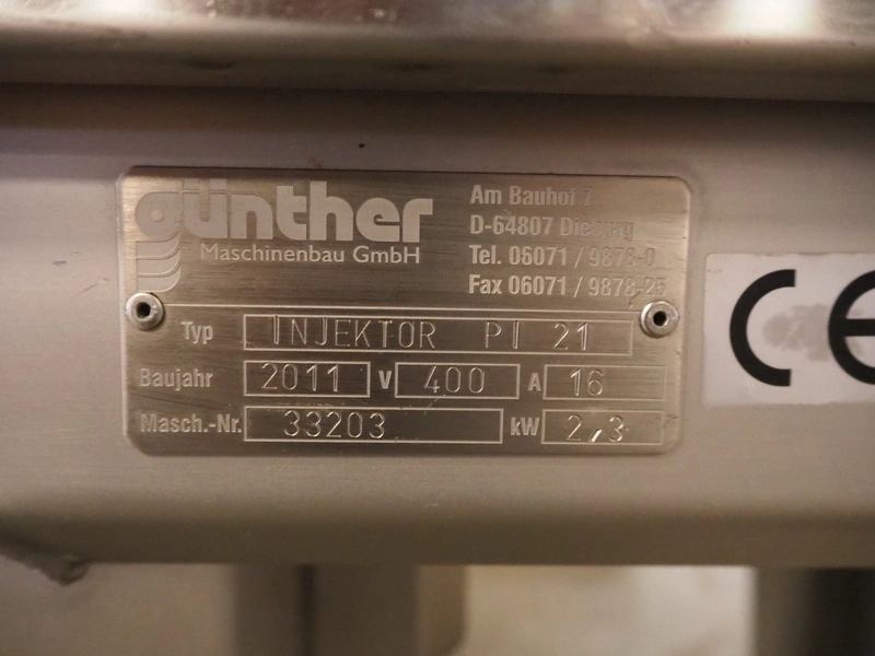 Günther Maschinenbau GmbH injector, type: INJEKTOR PI 21, machine number: 33203, year of construction: 2011, 400 V, 16 A, 2.3 kW, belt width: 260 mm, total dimensions: 1500 mm x 600 mm x 1800 mm.