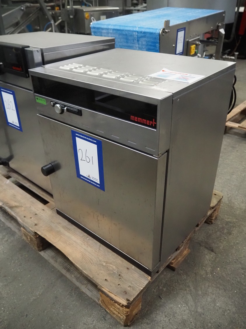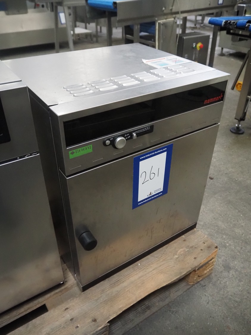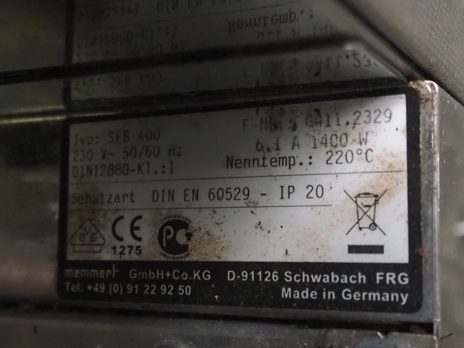 Memmert incubator, type: SFB 400, fabrication number: 0411.2329, 230 V, 50/60 Hz, 6.1 A, 1400 W, ambient temperature: 220˚C, dimensions: 550 mm x 480 mm x 670 mm.