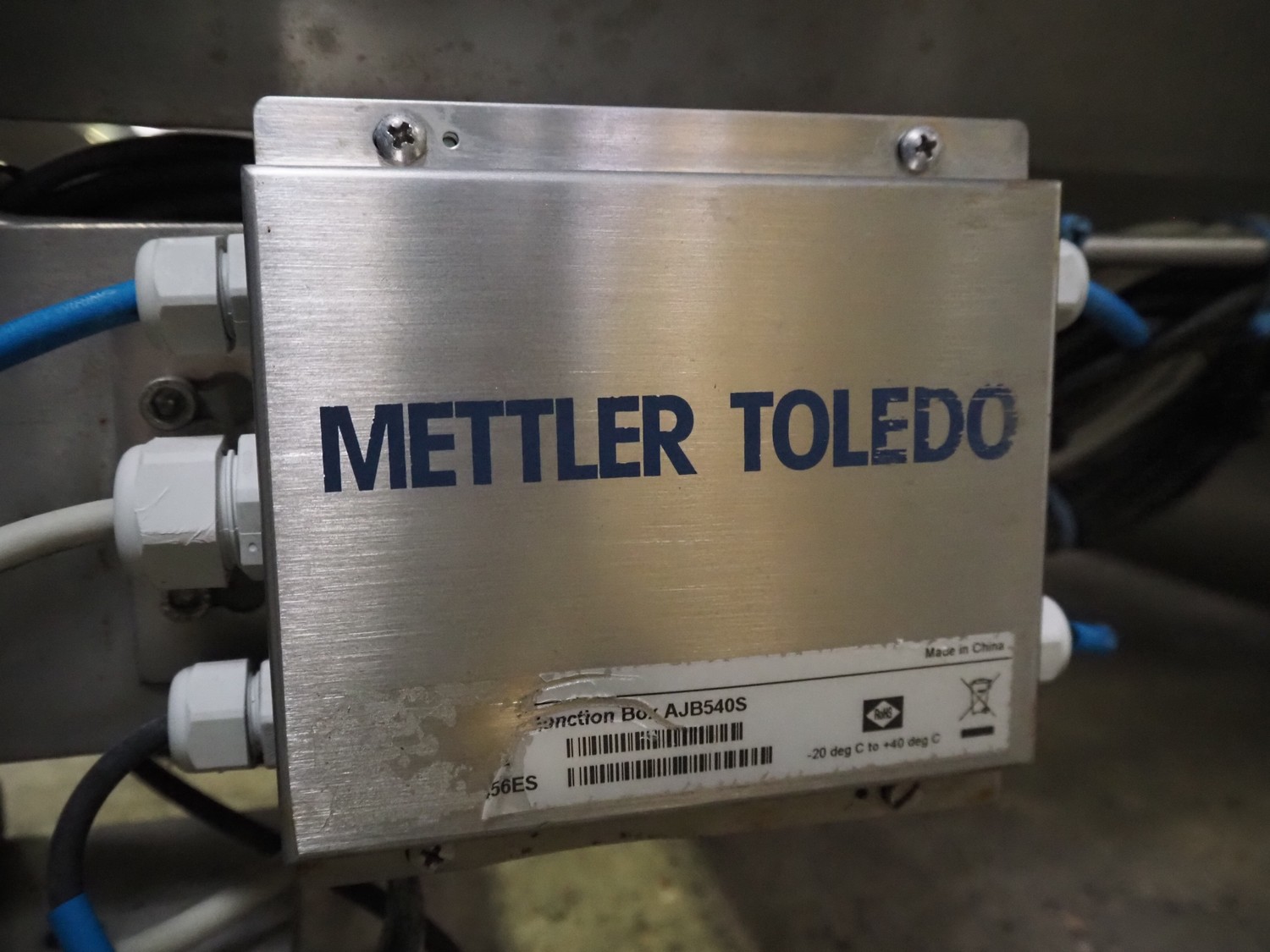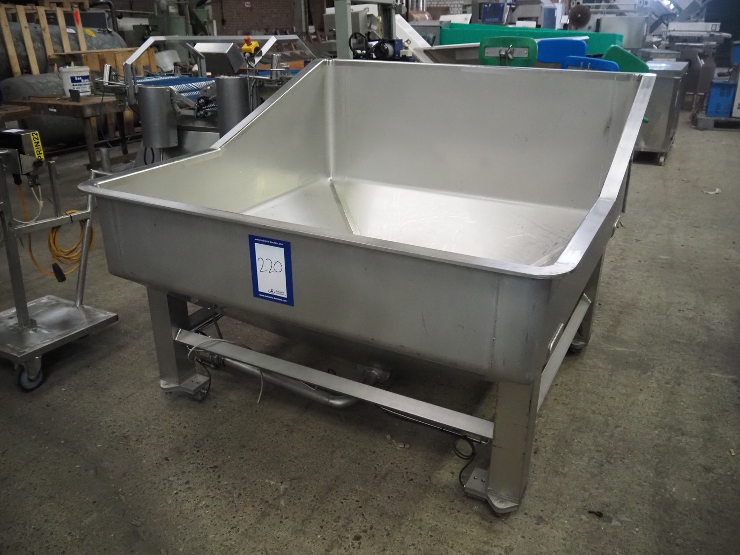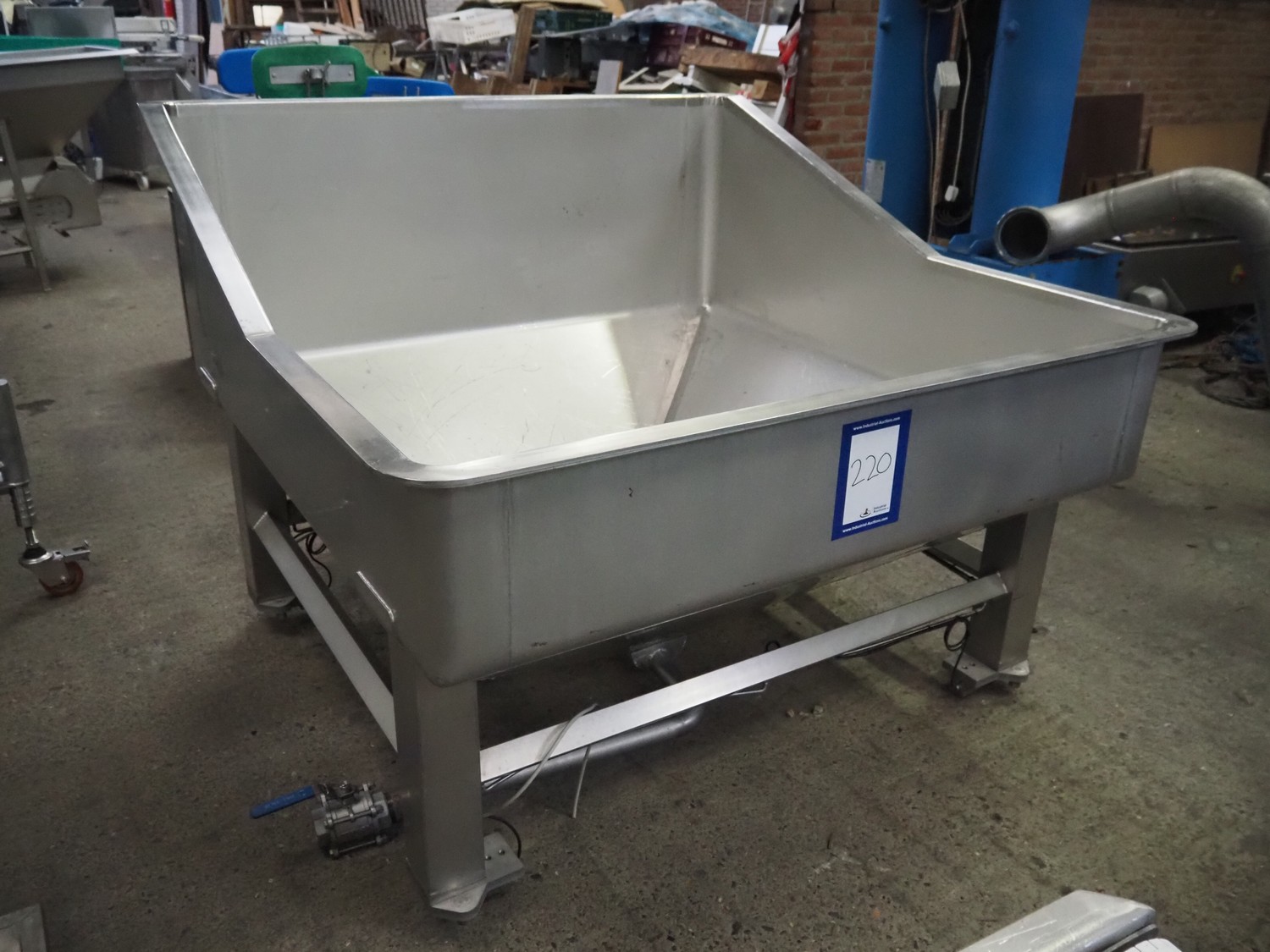 De Jager RVS s/s infeed bunker on Mettler Toledo weighing cells, inside dimensions: 1500 mm x 1500 mm x 800 mm, total dimensions: 1900 mm x 1700 mm x 1240 mm.