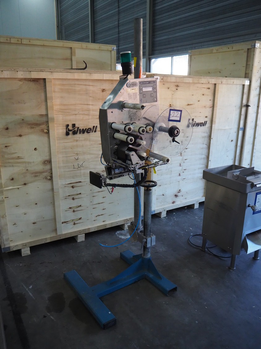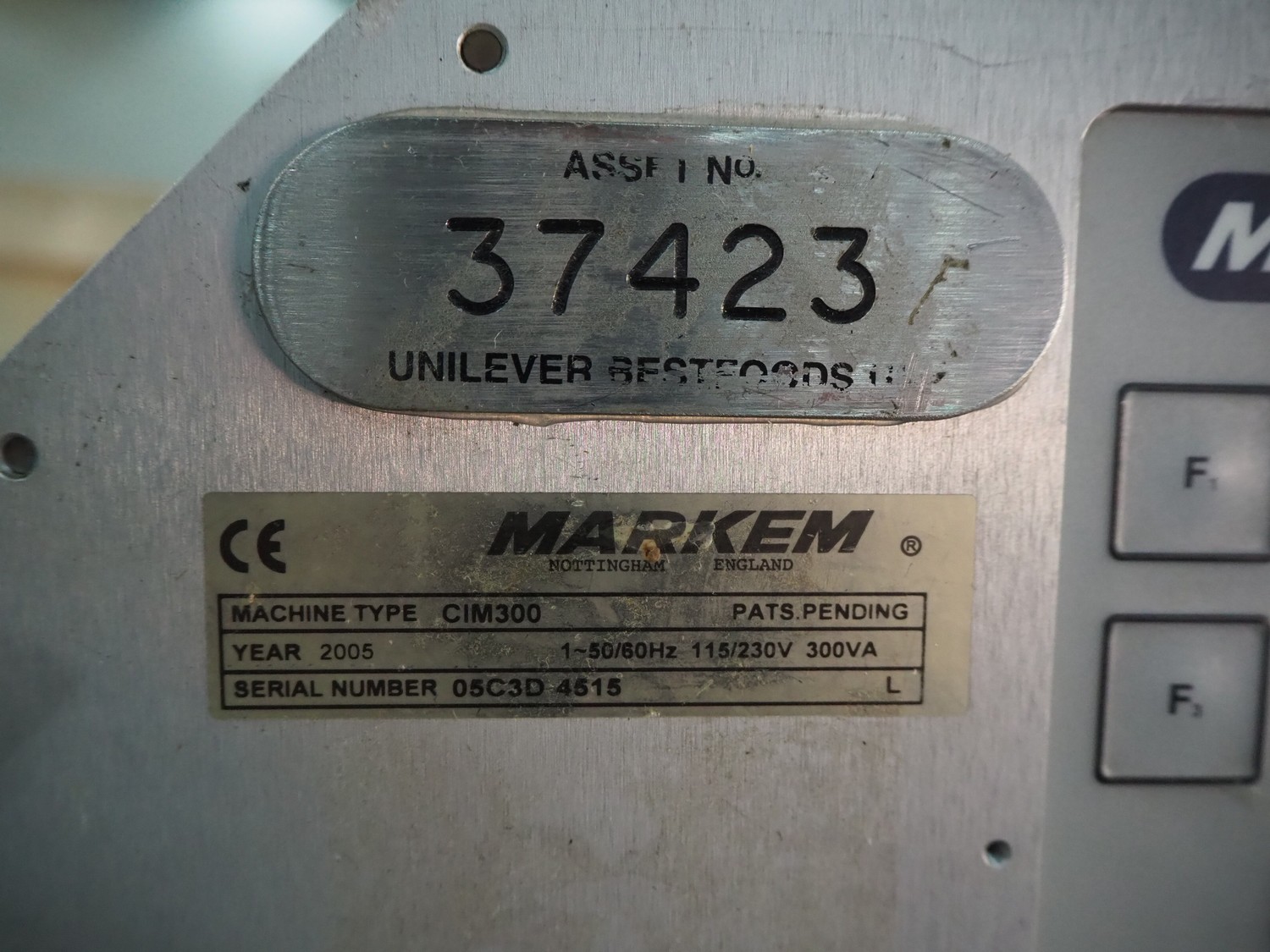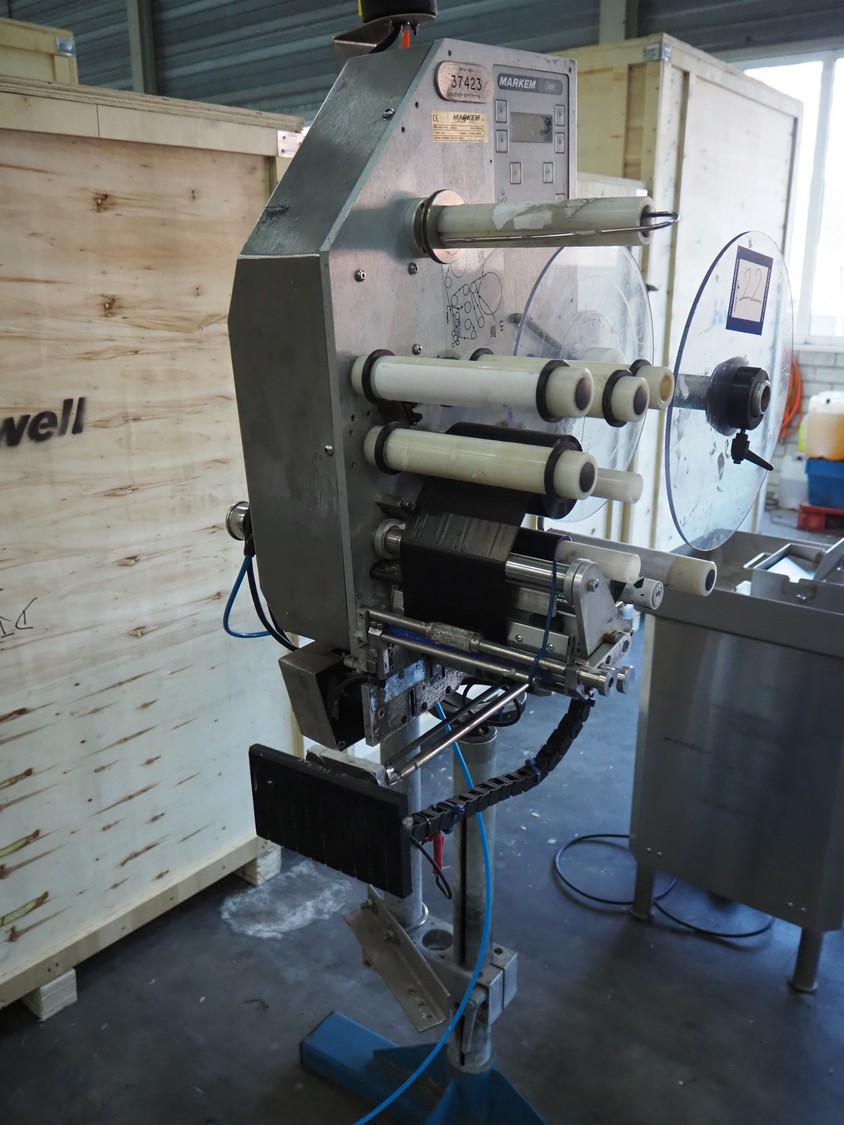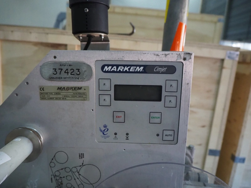 Markem label printer, machine type: CIM300, serial number: 05C3D 4515, year of construction: 2005, 115/230 V, 1 Ph, 50/60 Hz, 300 VA, dimensions: 800 mm x 700 mm x 2000 mm.