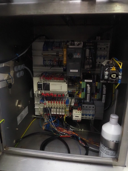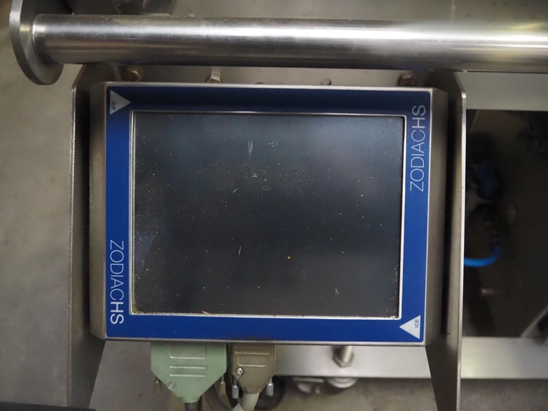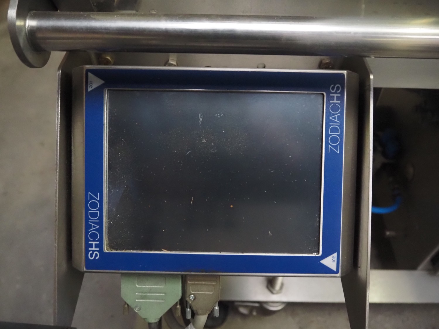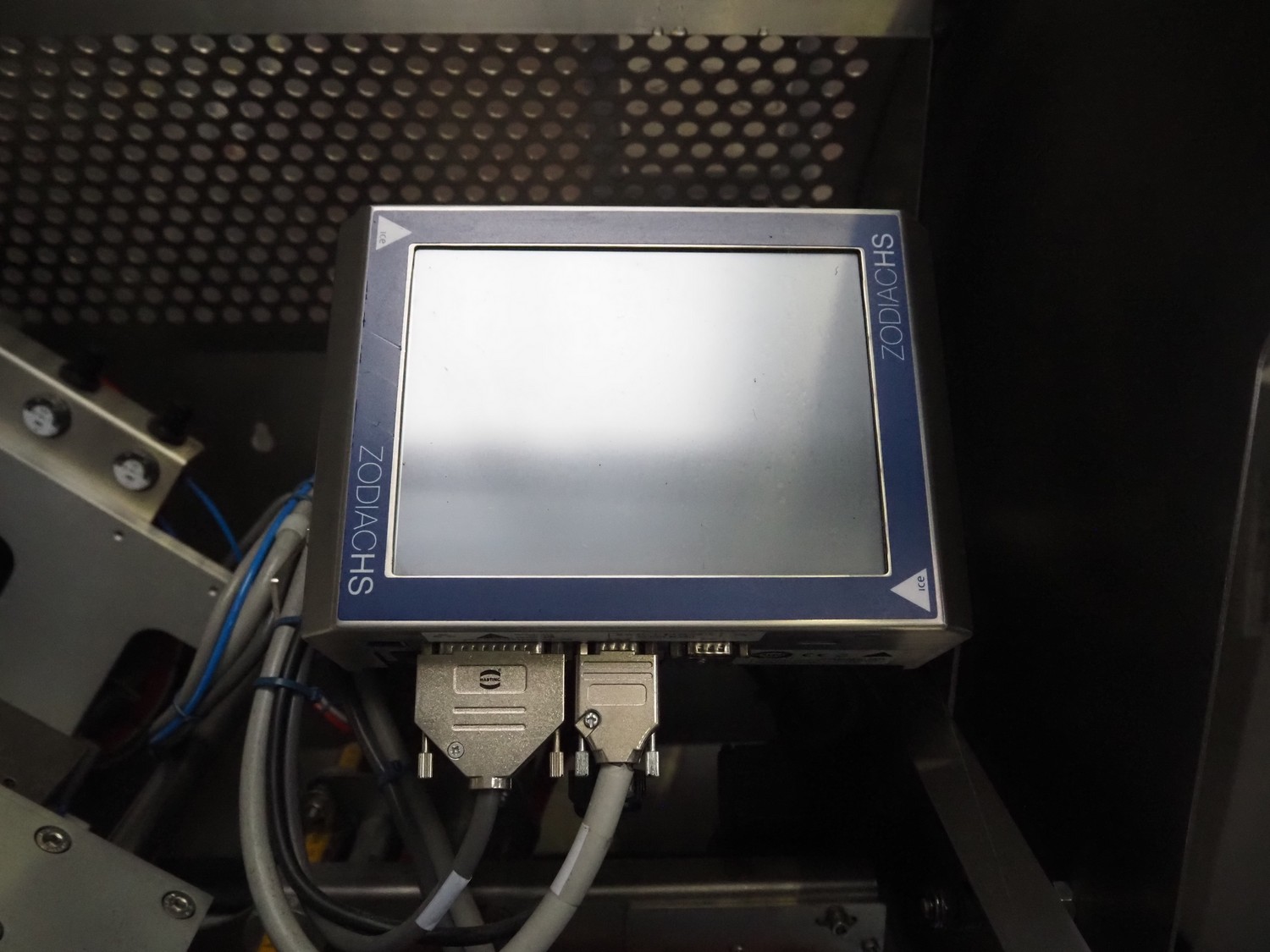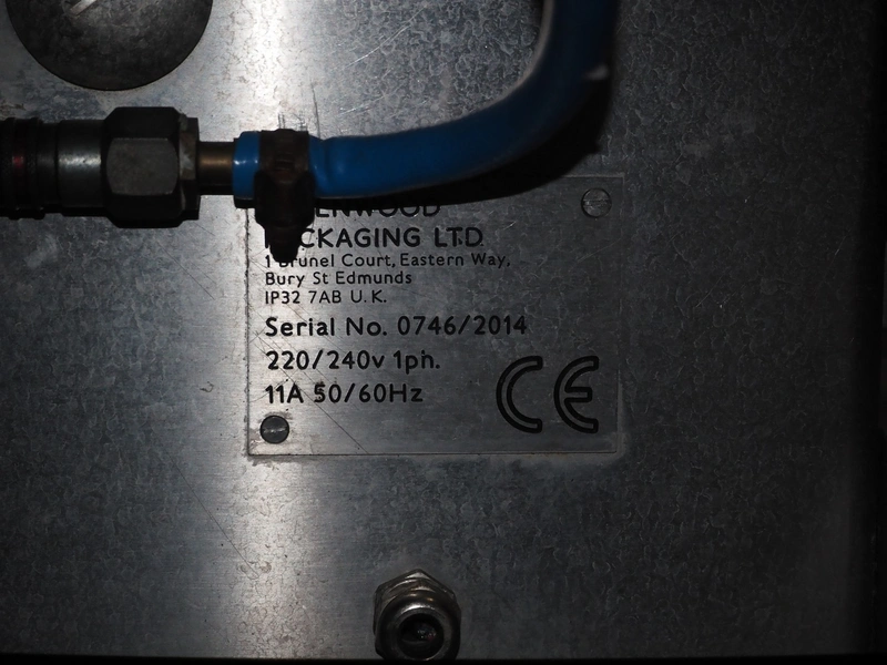 Ravenwood Packaging LTD linerless label applicator with ZodiacHS inkjet printer, serial number: 0746/2014, 220/240 V, 1 Ph, 50/60 Hz, 11 A, plastic belt, belt width: (2x) 100 mm, total dimensions: 1300 mm x 1150 mm x 1550 mm.