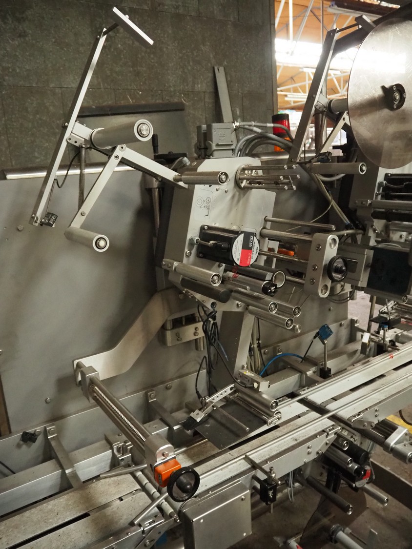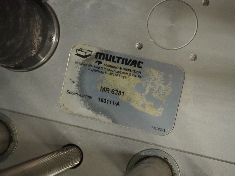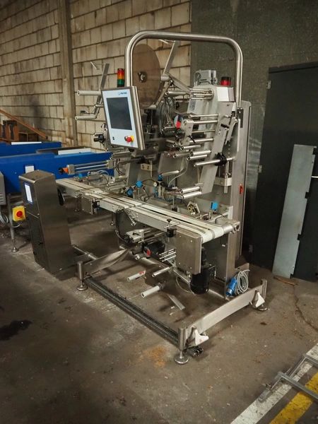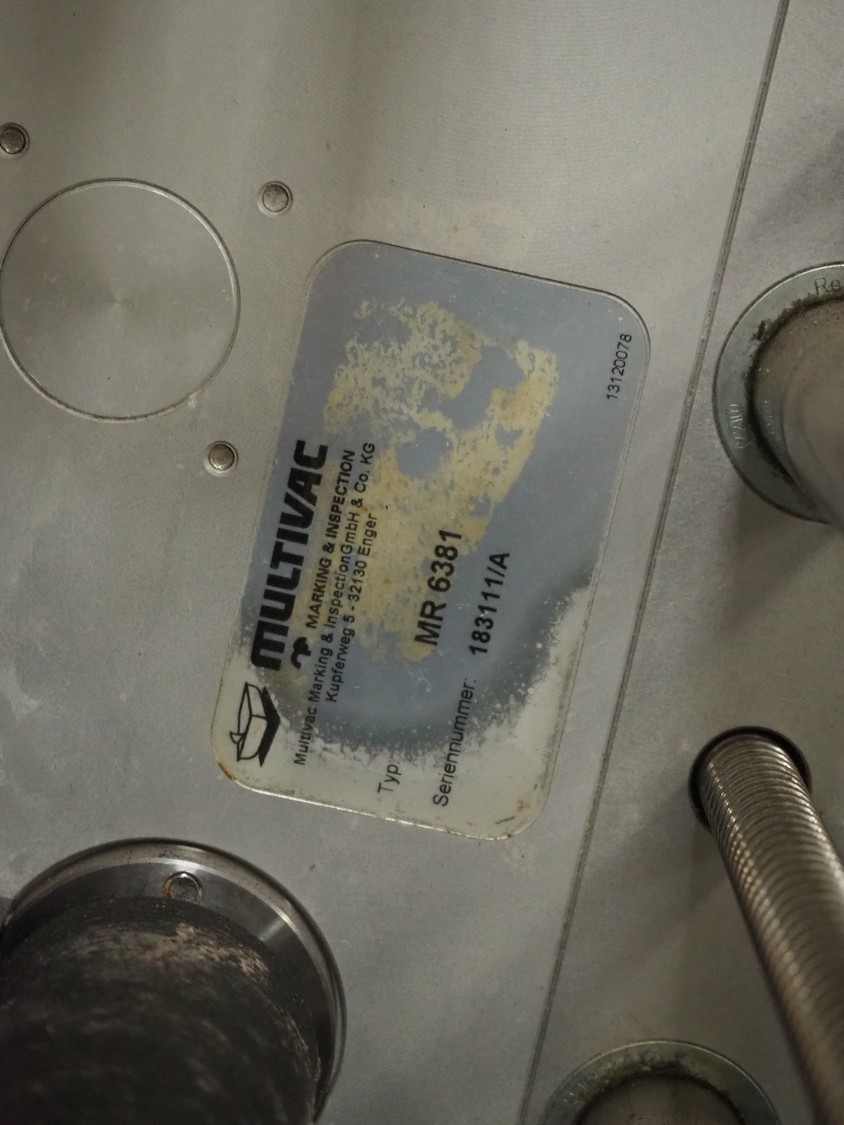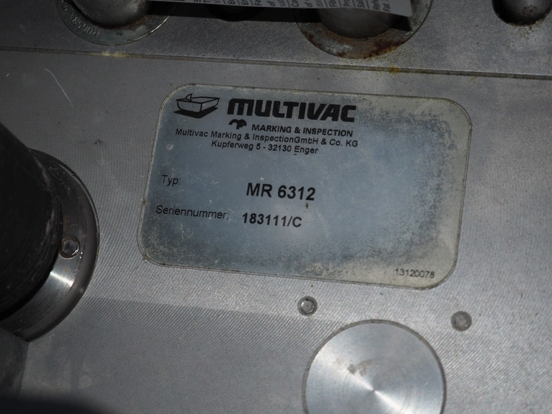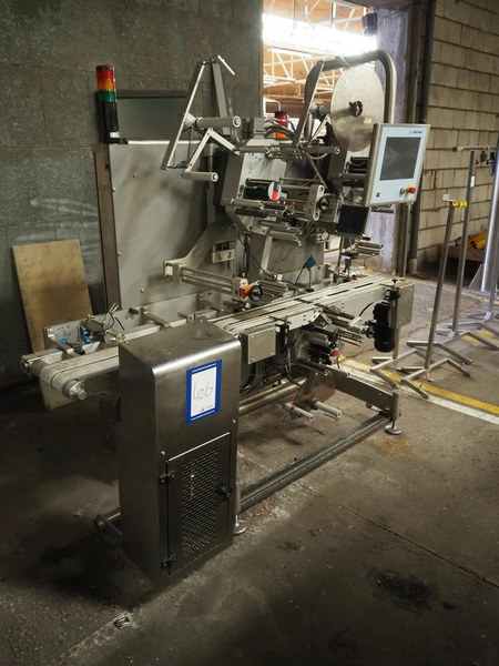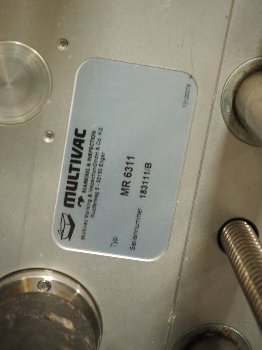 Multivac labelling machine with 2 top and 1 bottom labeller, type: MR336, machine number: 183111, year of construction: 2014, 230 V, 50/60 Hz, plastic belts, belt width: (2x) 85 mm, total dimensions: 2080 mm x 1280 mm x 2060 mm. Missing inkjet printer.