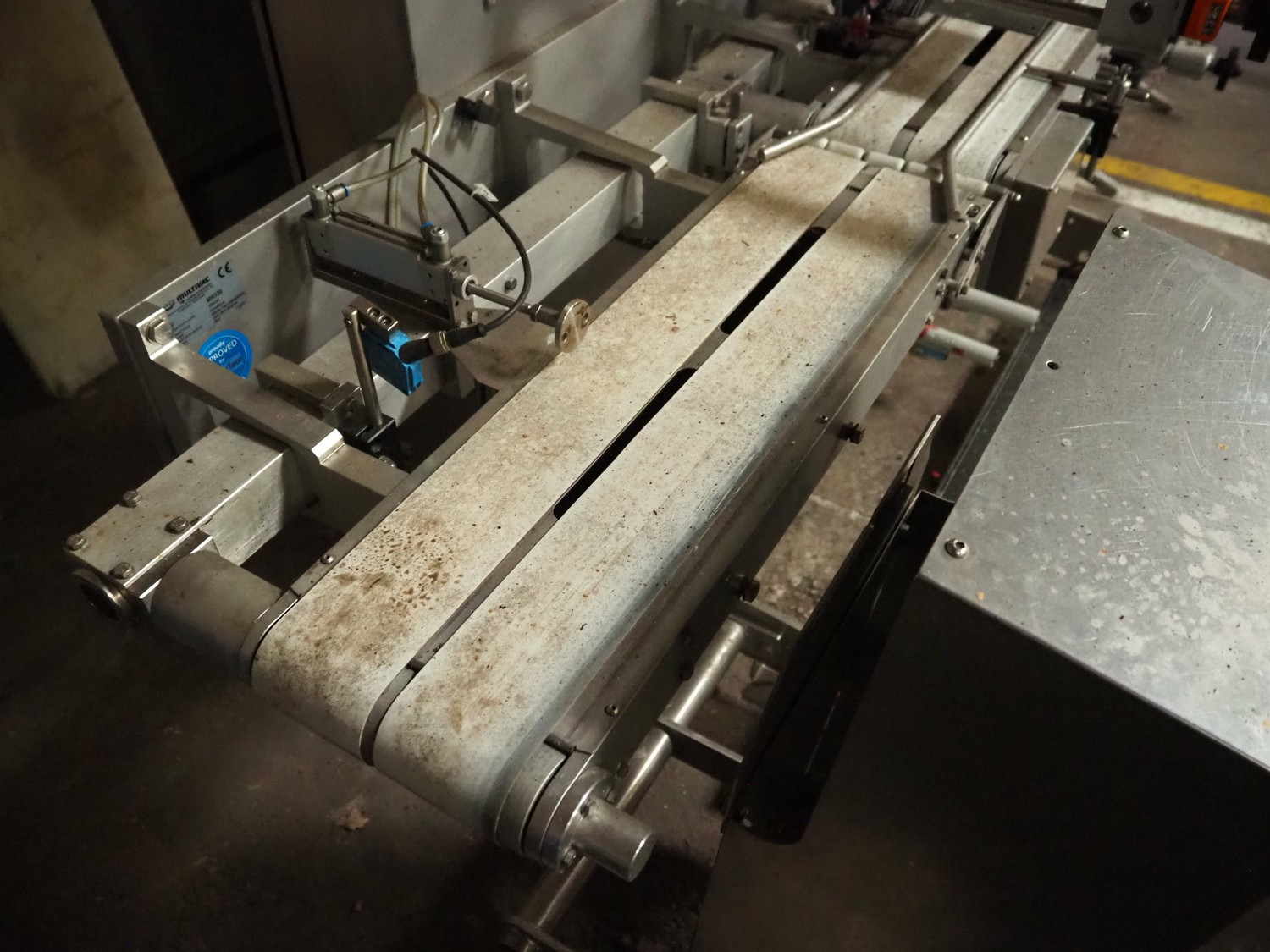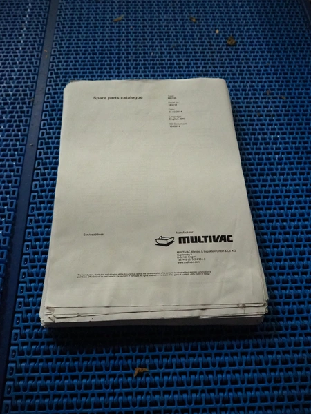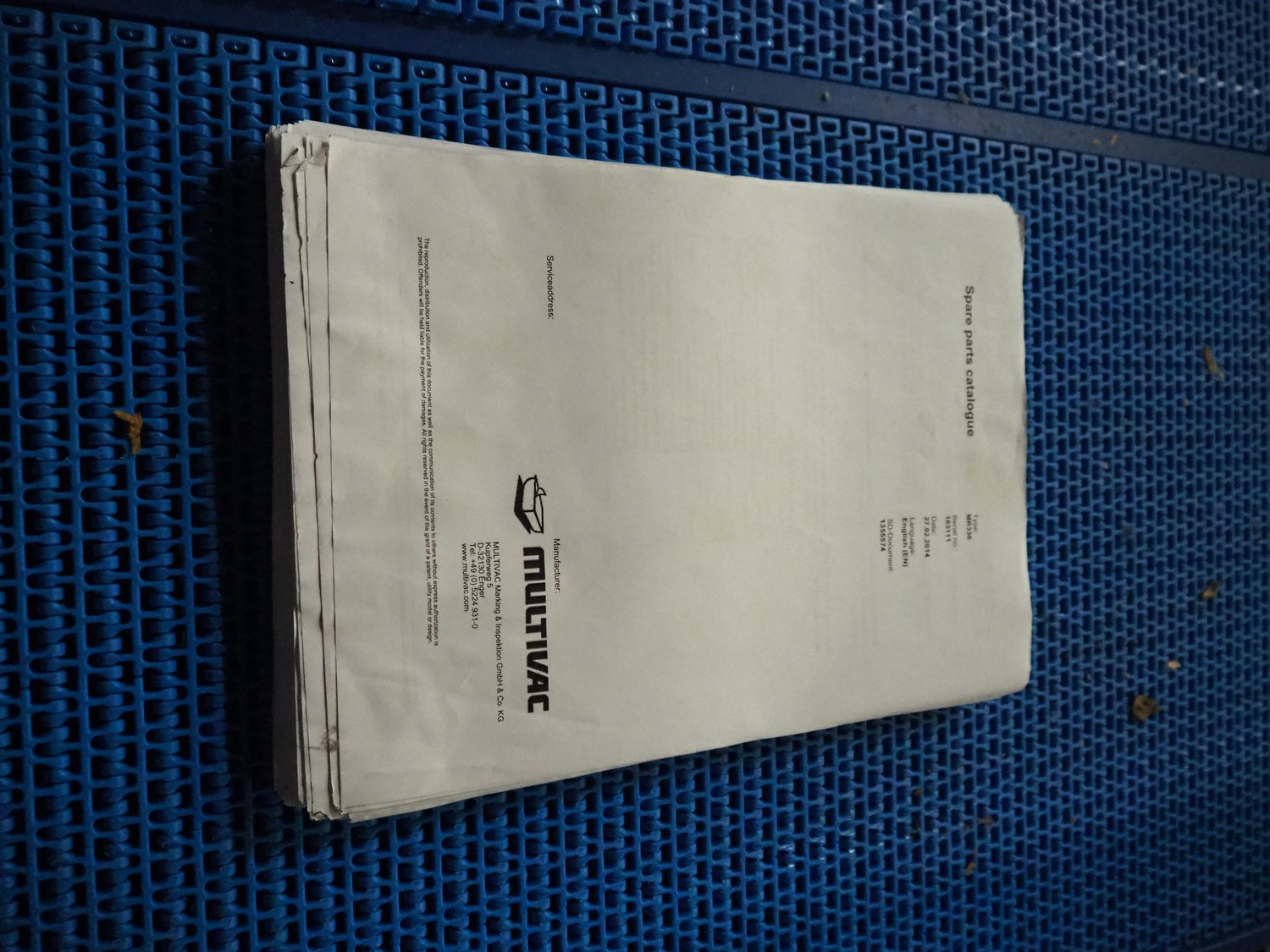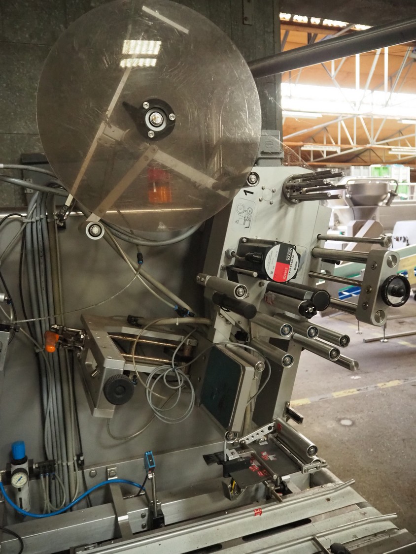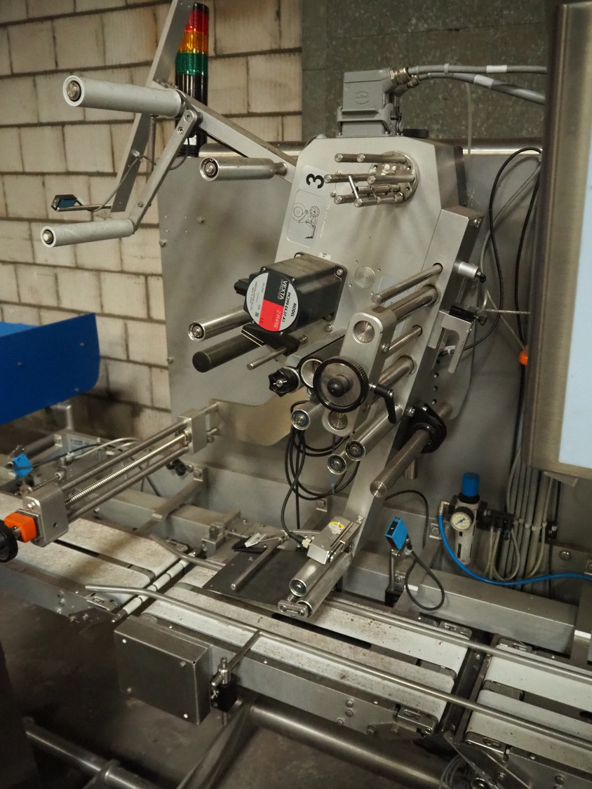 Multivac labelling machine with 2 top and 1 bottom labeller, type: MR336, machine number: 183111, year of construction: 2014, 230 V, 50/60 Hz, plastic belts, belt width: (2x) 85 mm, total dimensions: 2080 mm x 1280 mm x 2060 mm. Missing inkjet printer.