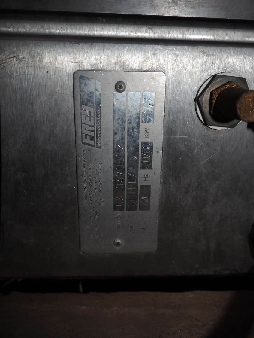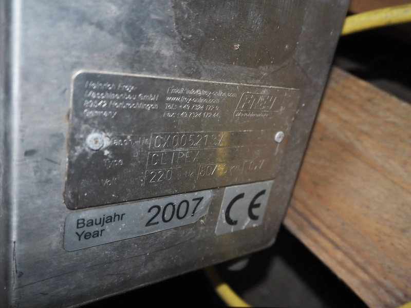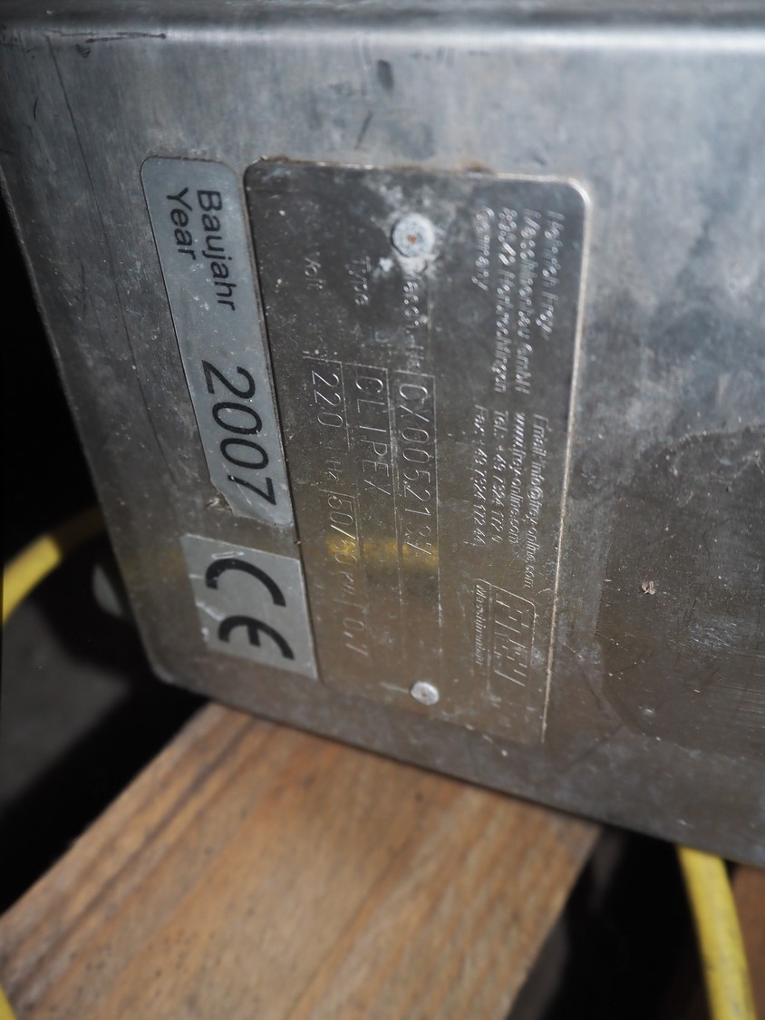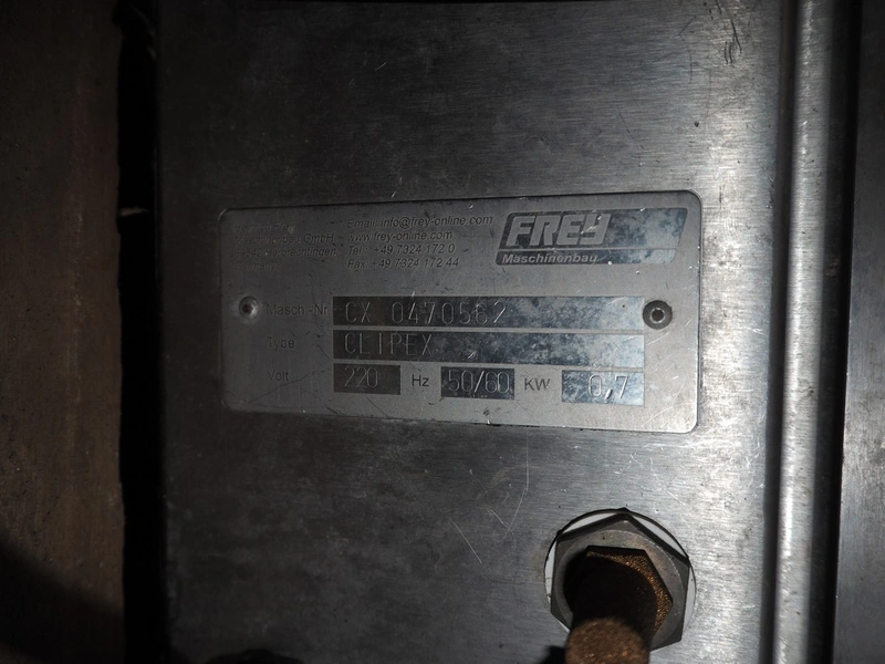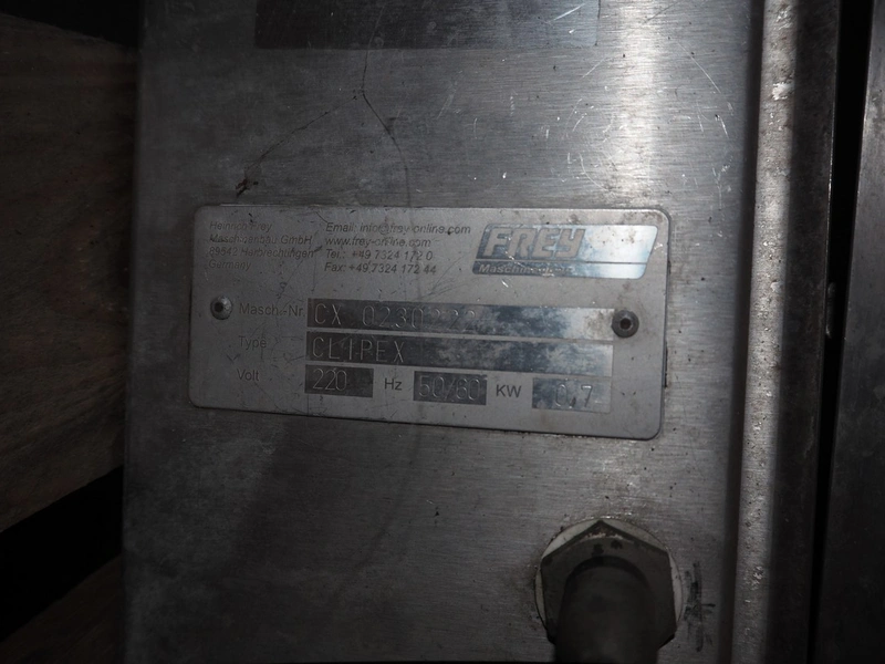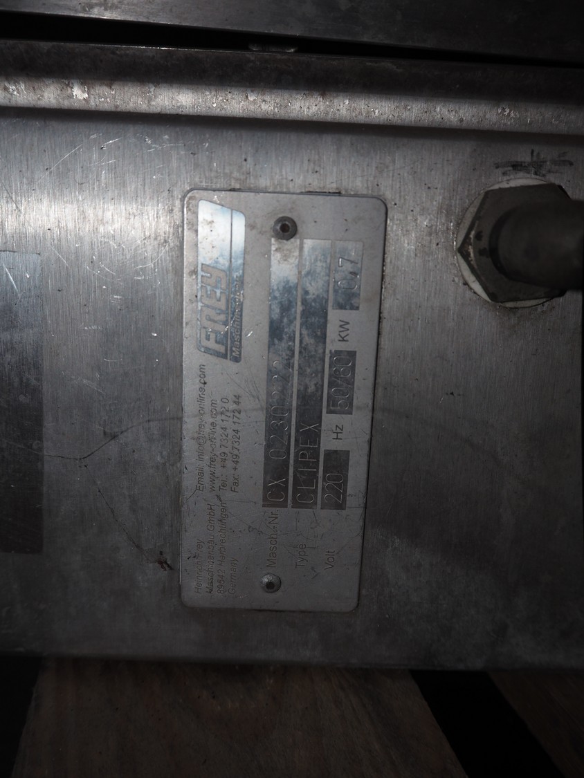 4 Frey Maschinenbau GmbH casing closing machines, type: Clipex, machine number: CX 0230222, CX 0052137, CX 0100833 and CX 0470562, 220 V, 50/60 Hz, 0.7 kW, dimensions: (4x) 400 mm x 160 mm x 300 mm.