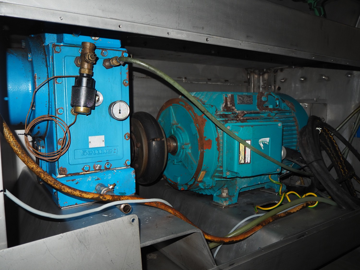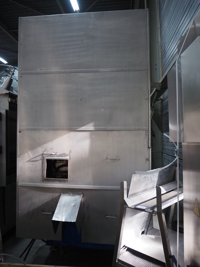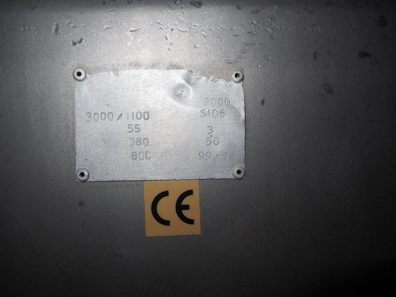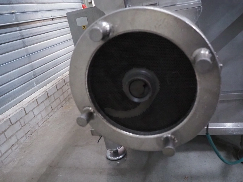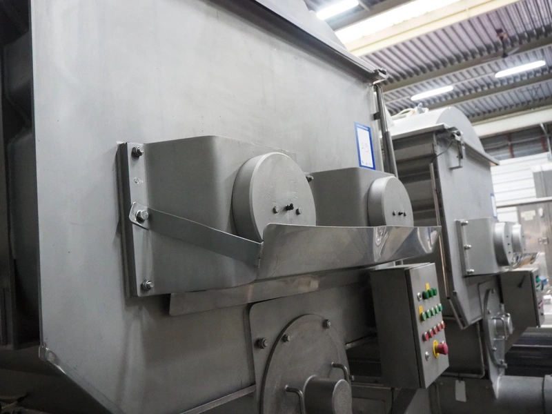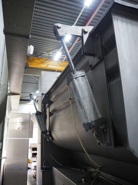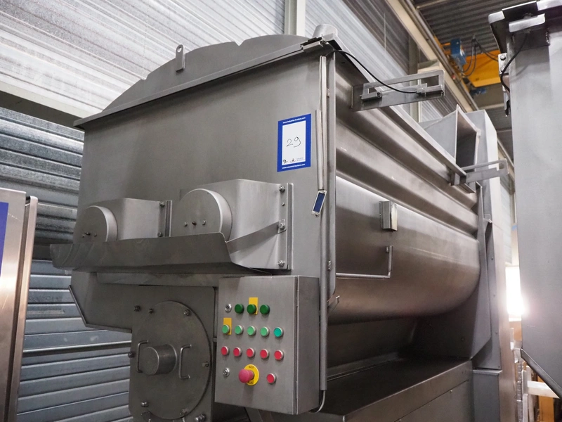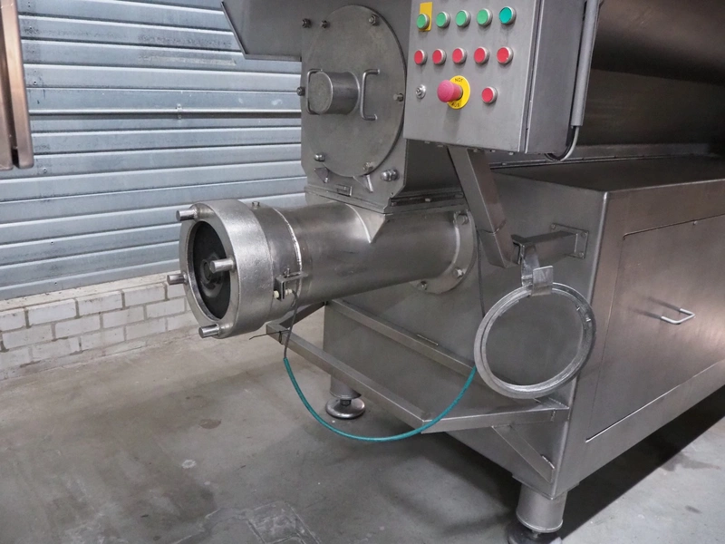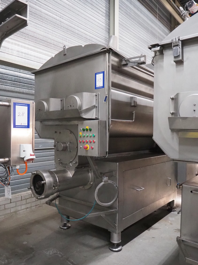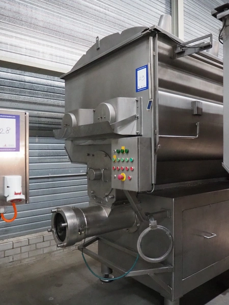 Butcher Boy double shaft paddle mixer-grinder, type: 3000/1100 MG, serial number: S106, year of construction: 2000, 380 V, 3 Ph, 50 Hz, 120 kW, diameter plate: 280 mm, volume: 3000 litres, air pressure: 8 bar, infeed height: 2500 mm, outfeed height: 760 mm, total dimensions: 4000 mm x 2000 mm x 3200 mm. Including tool trolley. Missing top injection.