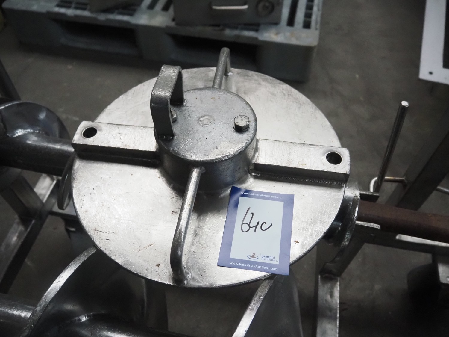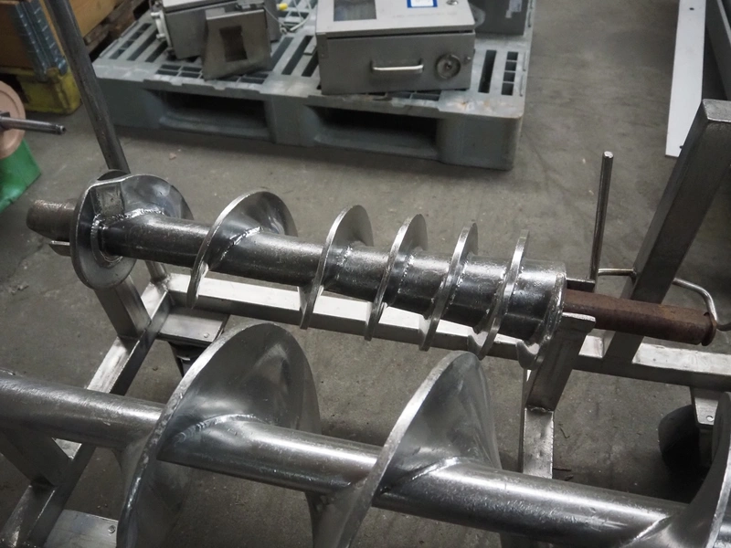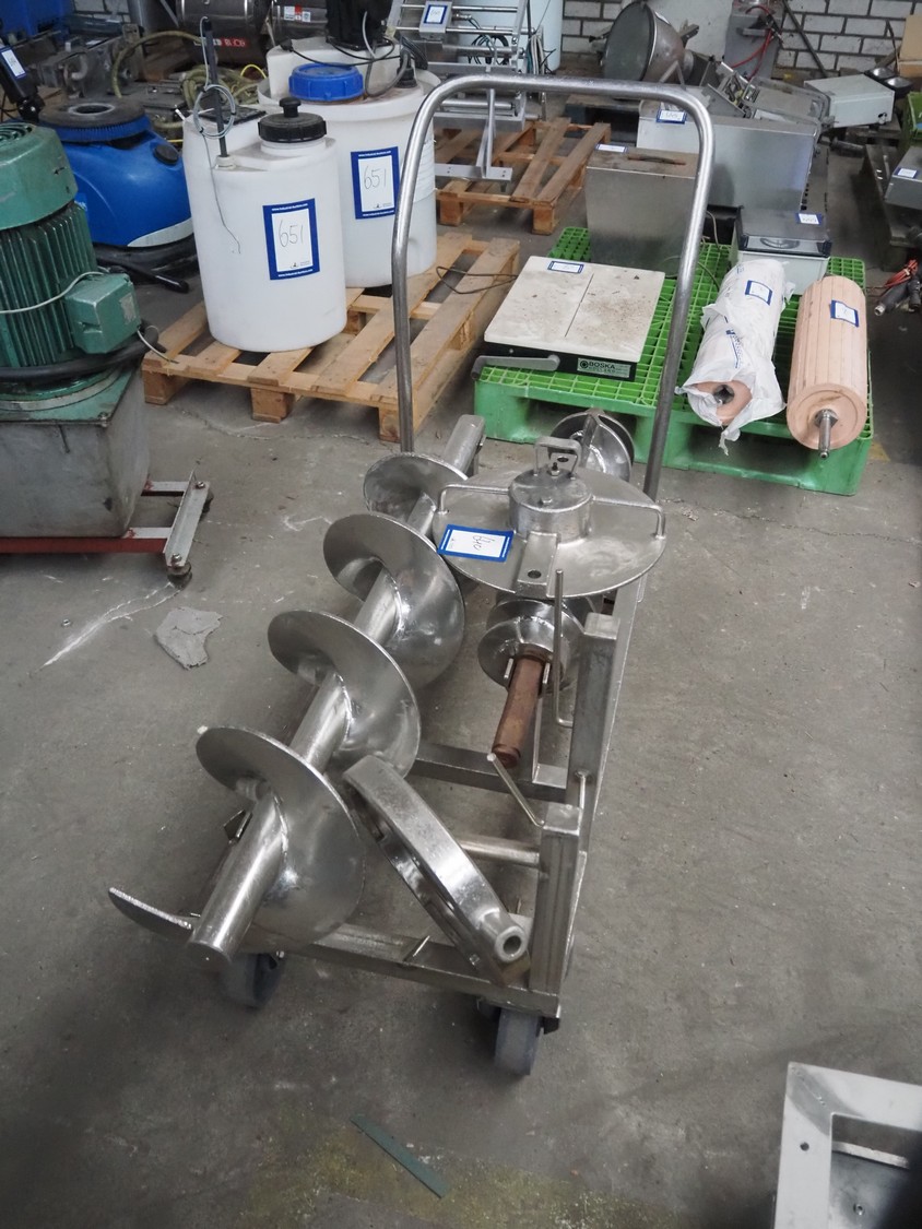 S/s trolley with worms for grinder, dimensions worm: 1200 mm x 300 mm and 850 mm x 170 mm, total dimensions: 1500 mm x 500 mm x 1030 mm.