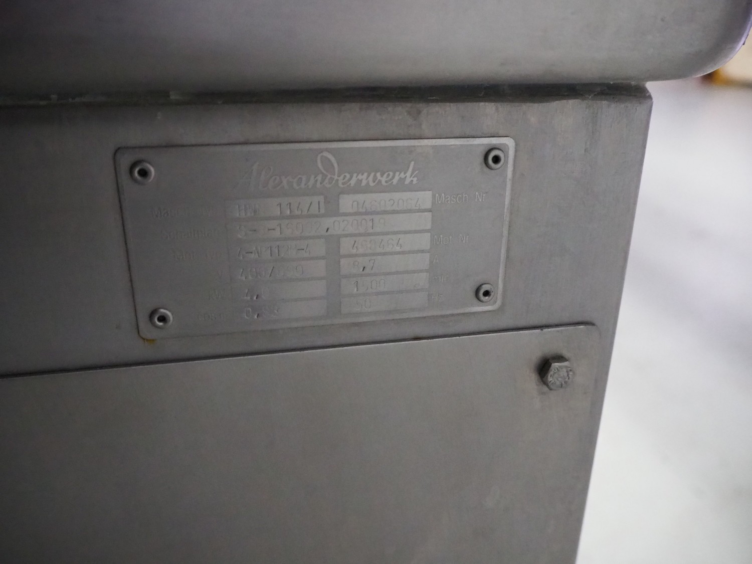 Alexanderwerk grinder, machine type: HWN 114/I, machine number: 04602064, 400/680 V, 50 Hz, 8.7 A, 4.0 kW, plate diameter: 115 mm, total dimensions: 650 mm x 1100 mm x 1100 mm.