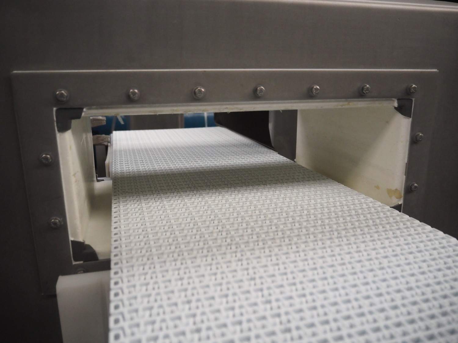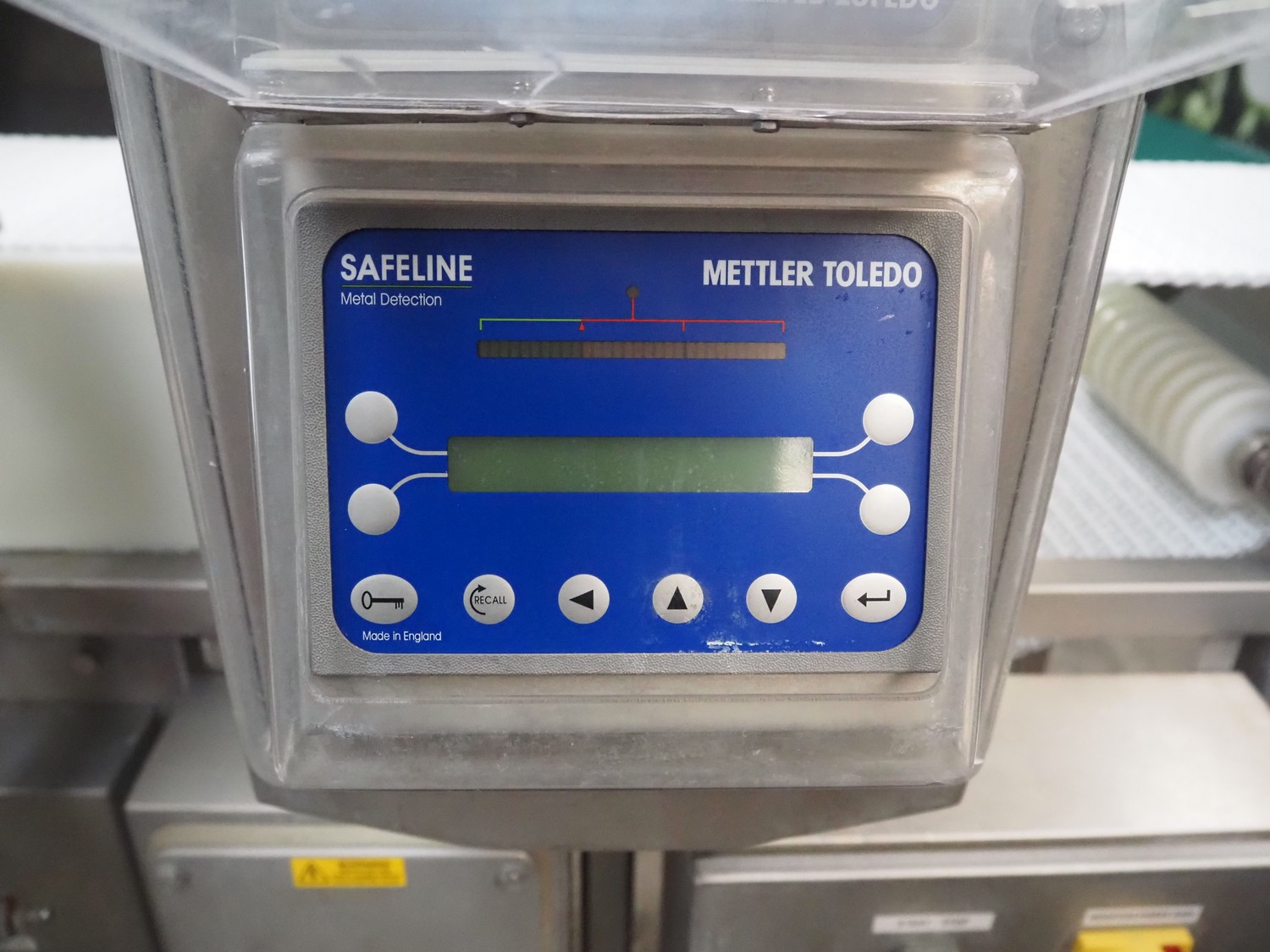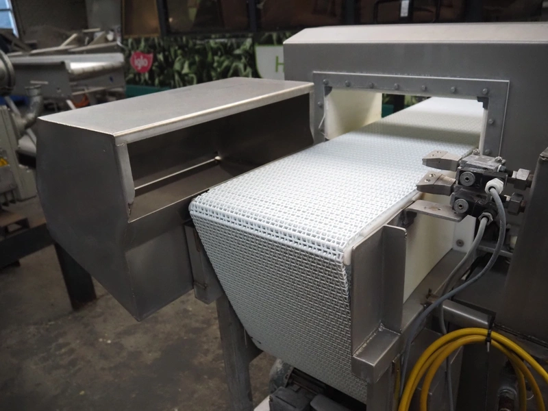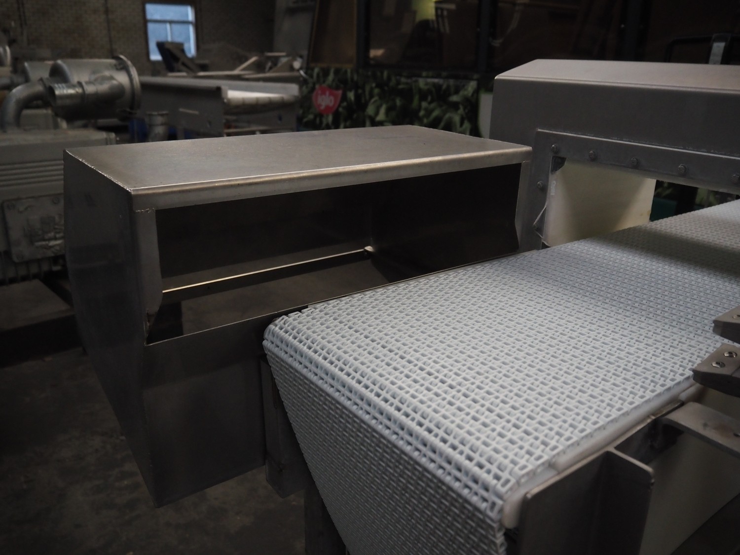 Safeline / Mettler Toledo metal detector with rejector, plastic mesh belt, belt width: 300 mm, clearance: 355 mm x 110 mm, total dimensions: 1300 mm x 1100 mm x 1100 mm.