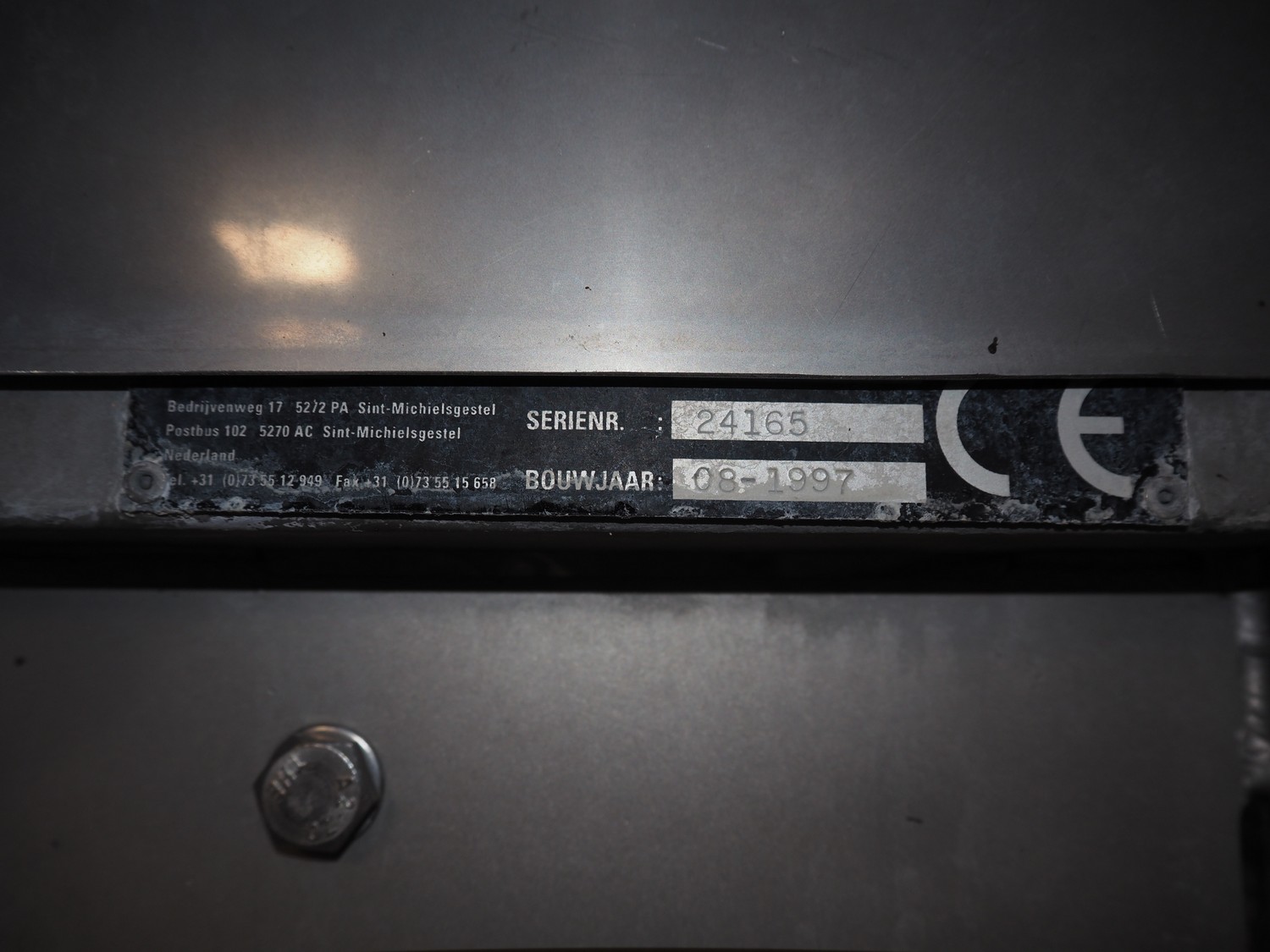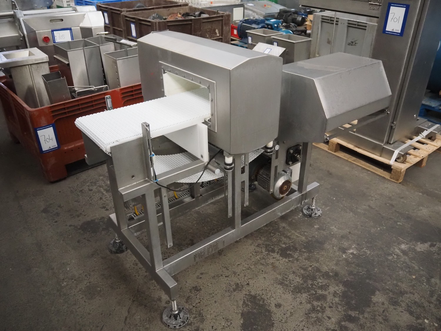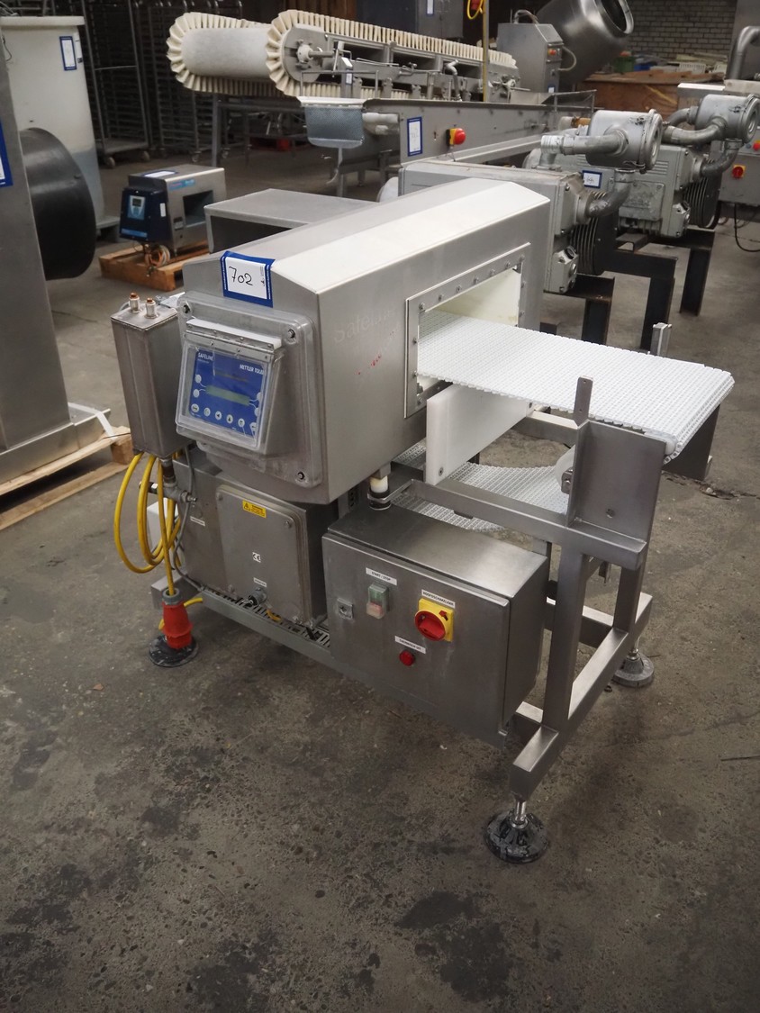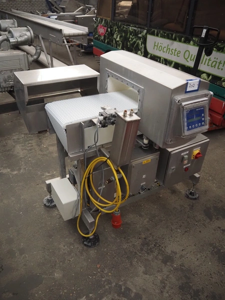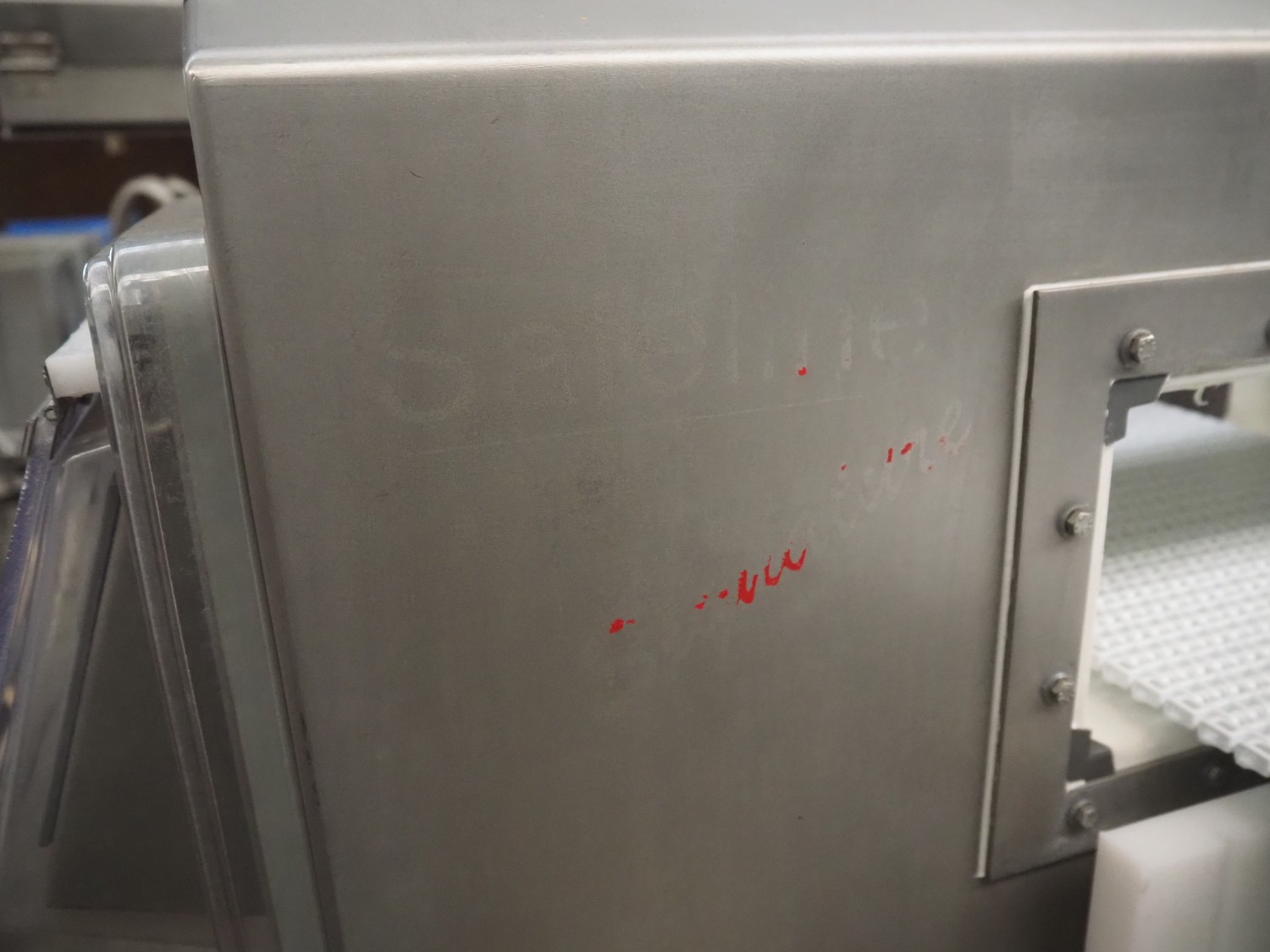 Safeline / Mettler Toledo metal detector with rejector, plastic mesh belt, belt width: 300 mm, clearance: 355 mm x 110 mm, total dimensions: 1300 mm x 1100 mm x 1100 mm.