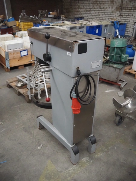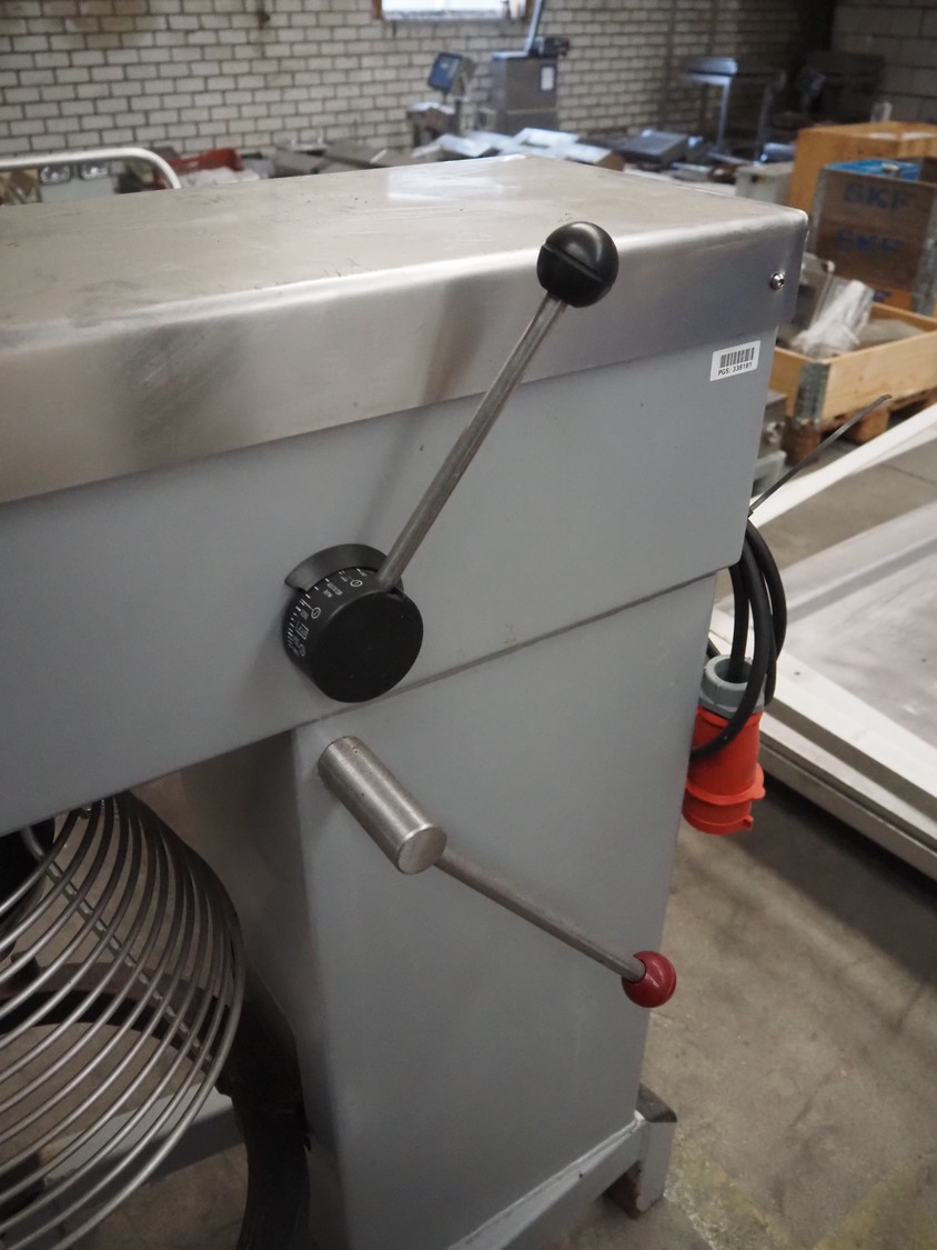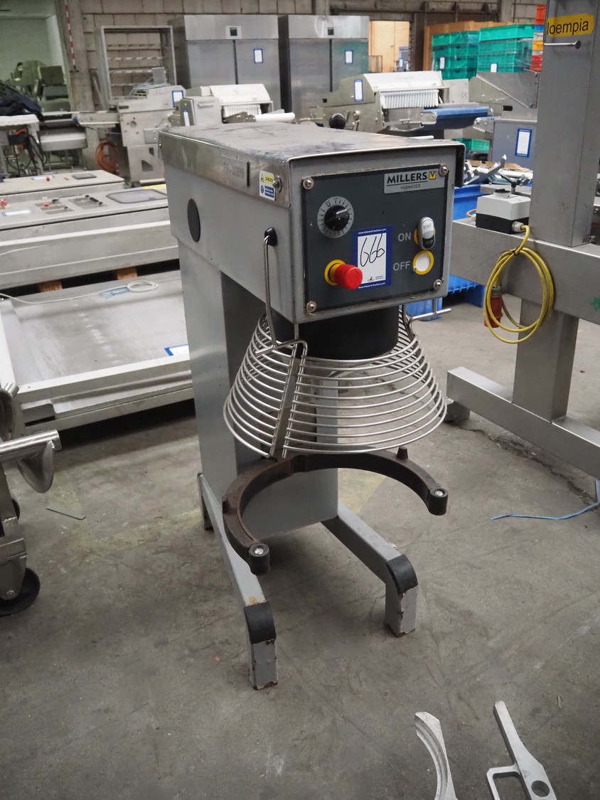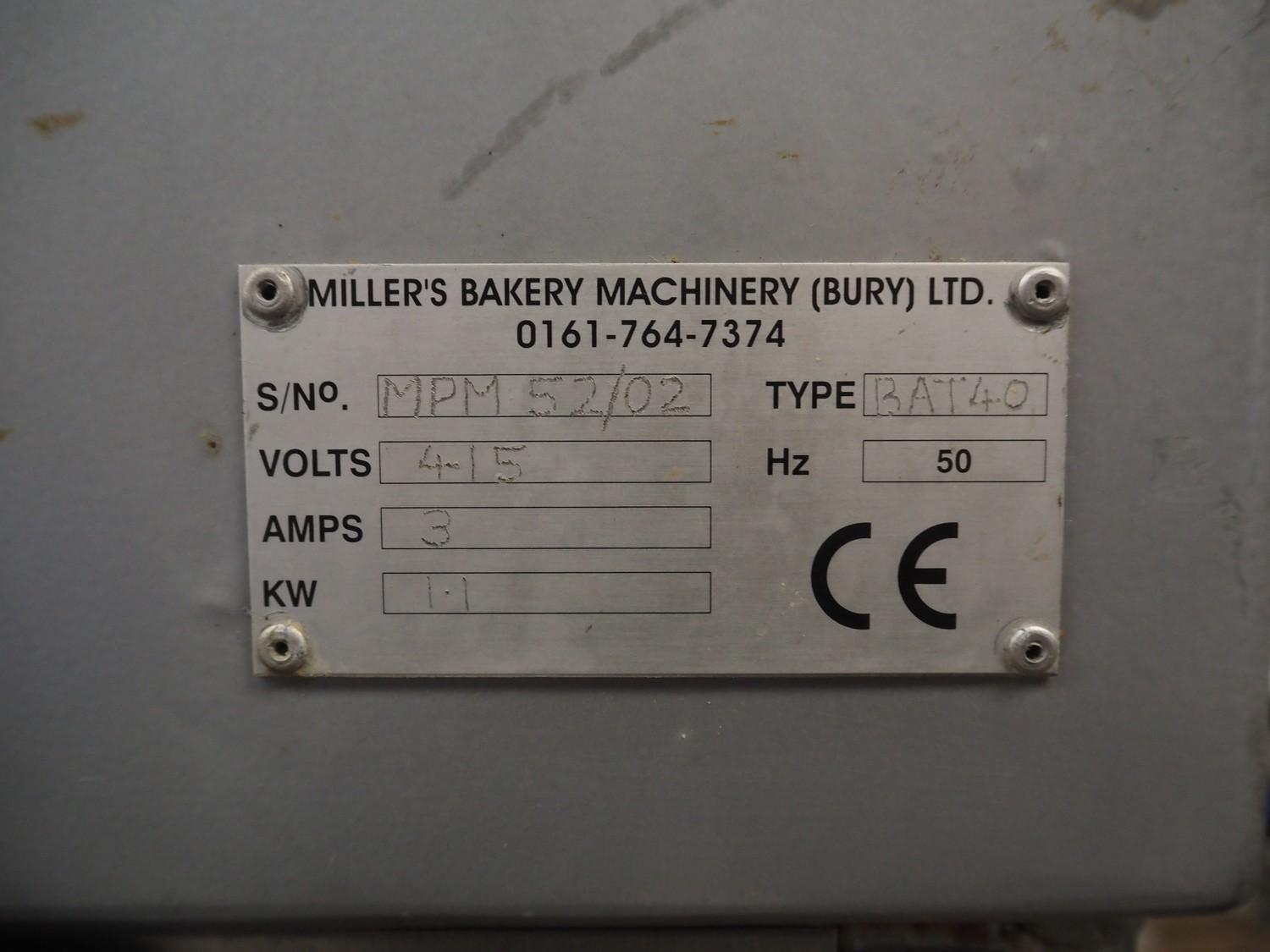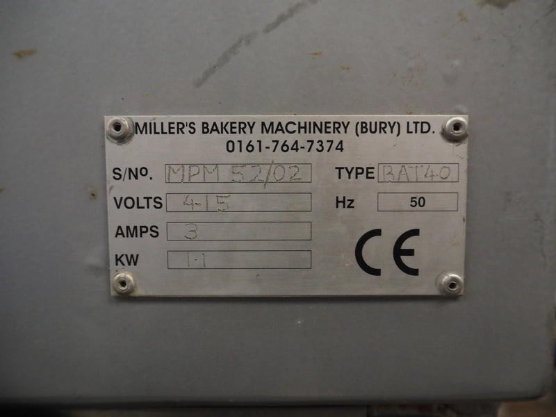 Miller's Bakery Machinery mixer, type: BAT40, serial number: MPM 52/02, 415 V, 50 Hz, 3 A, 1.1 kW, dimensions: 850 mm x 420 mm x 1200 mm. Incomplete, missing whisk and bowl.