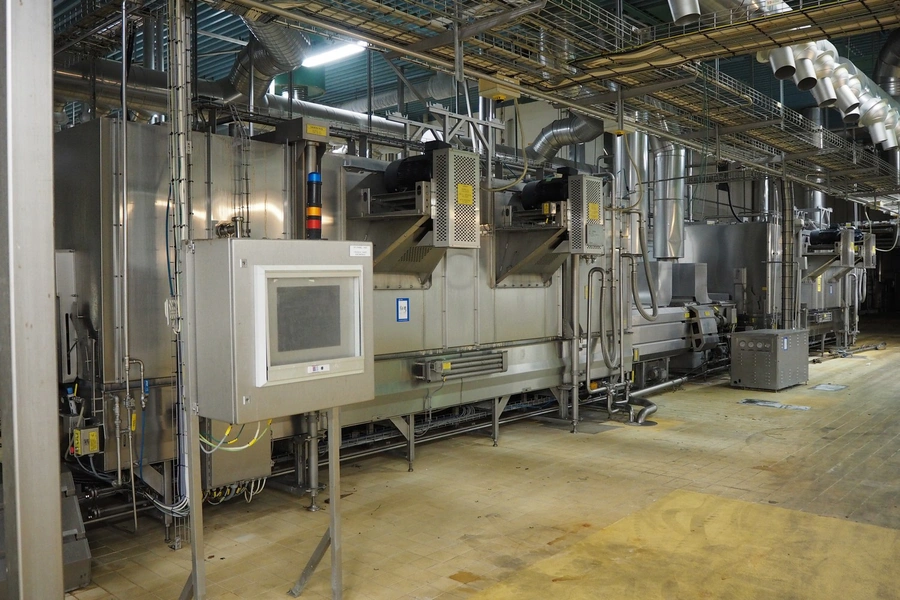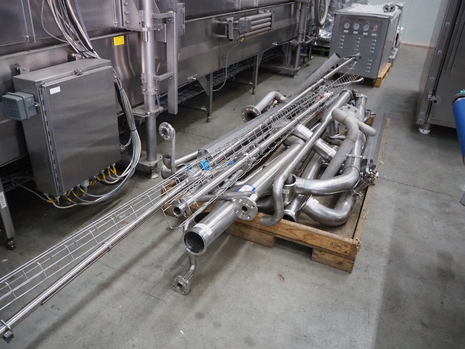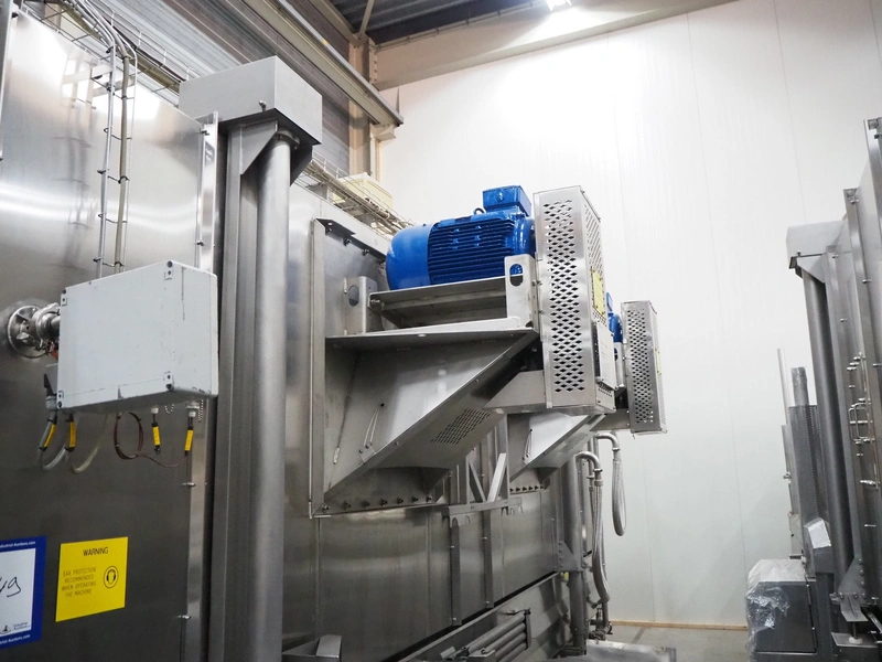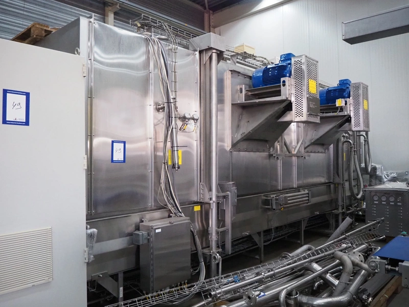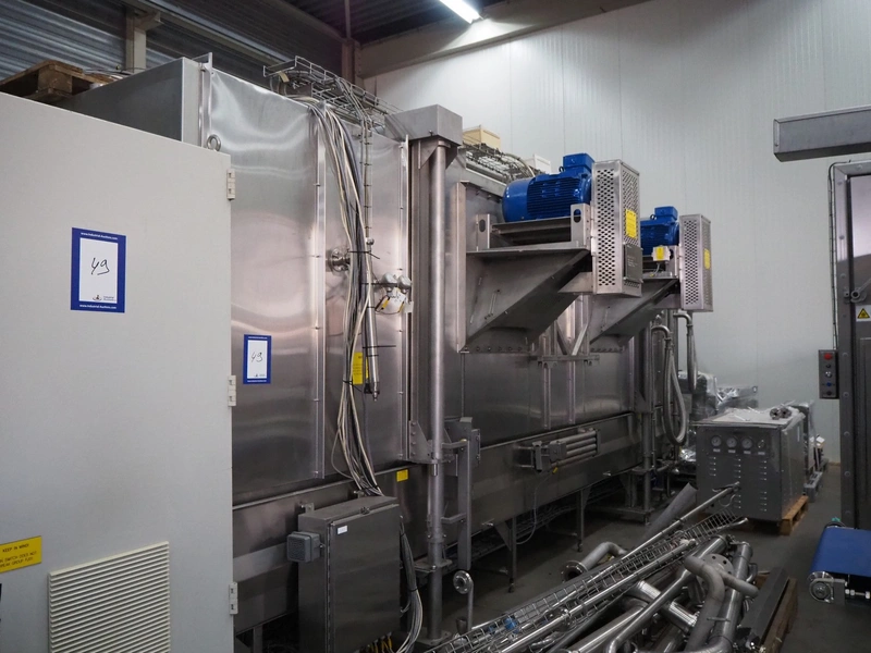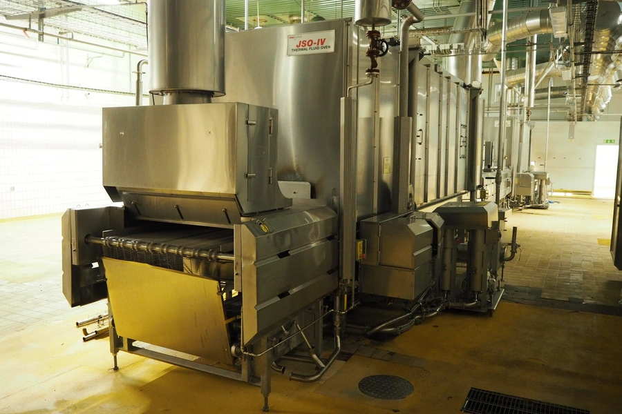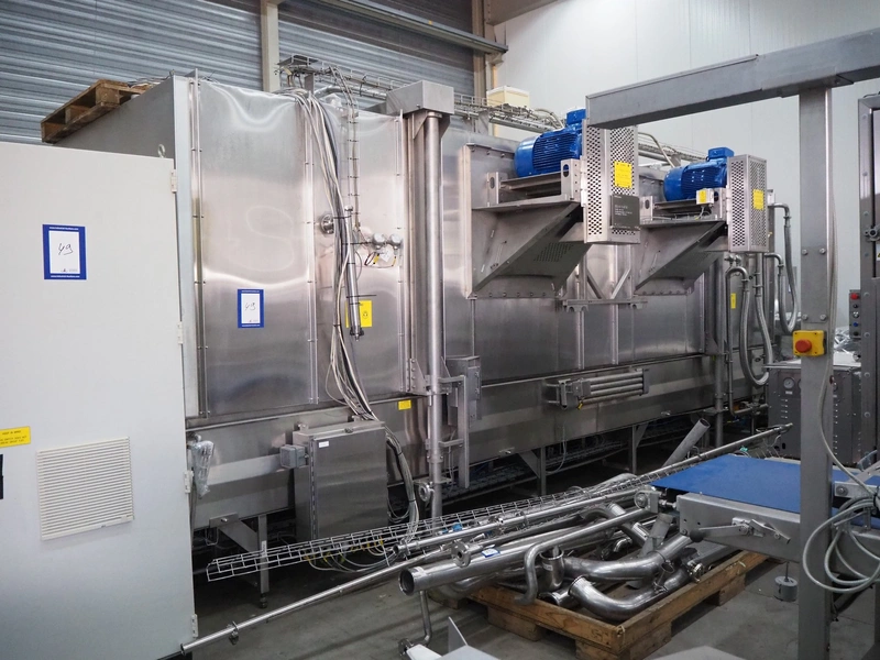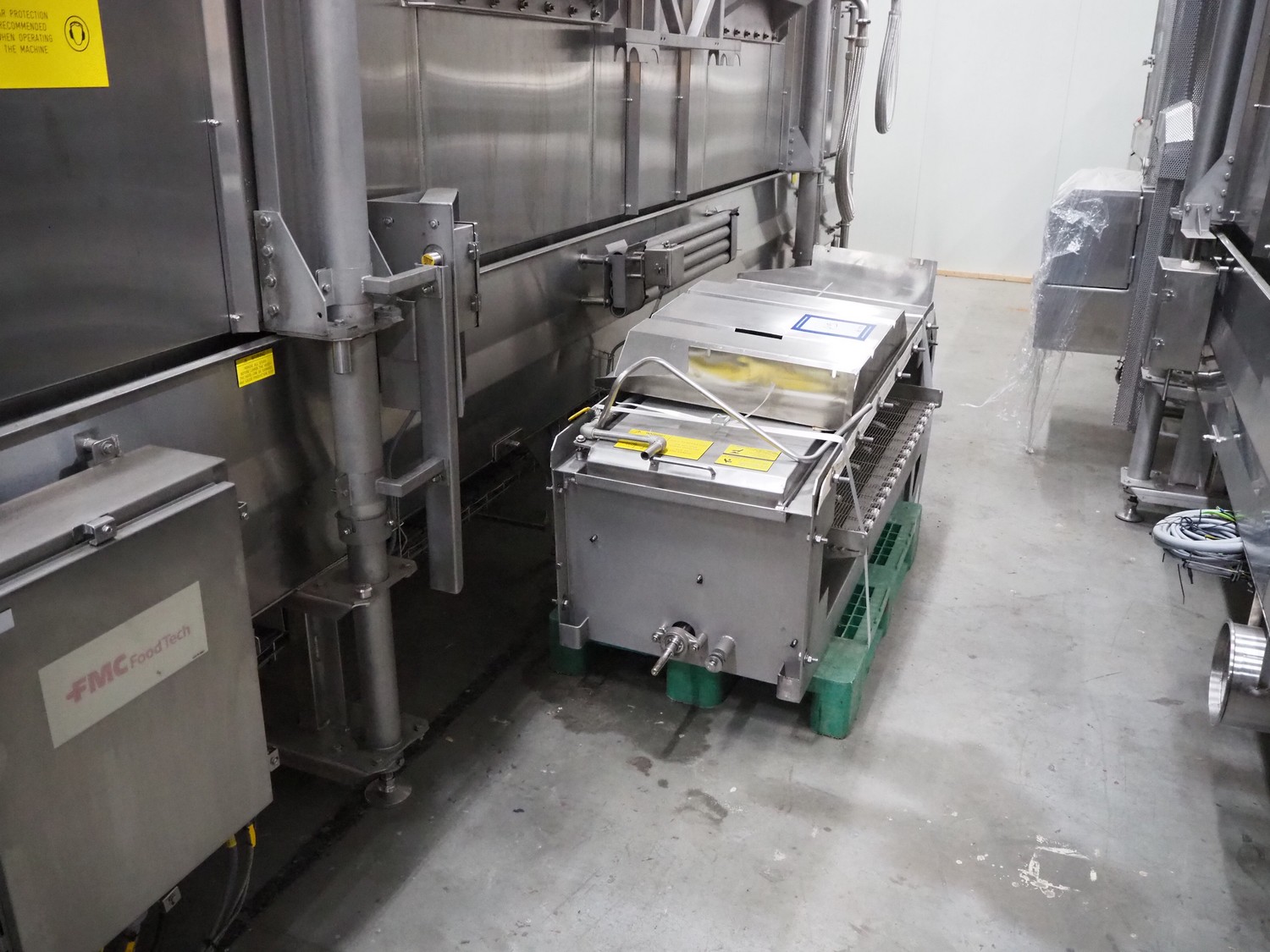 FMC Foodtech / Stein thermal double fluid oven, type: JSO IV OVEN, model: 40-22TF, serial number: 811, 380 VAC, 3 Ph, 50 Hz, full load: 185 A, motor: 46 A, short circuit: 5000 A, s/s mesh belt, belt width: 102 mm, clearance: 25 - 150 mm, total dimensions: 23200 mm x 3700 mm x 3300 mm. Overhauled in 2024.
