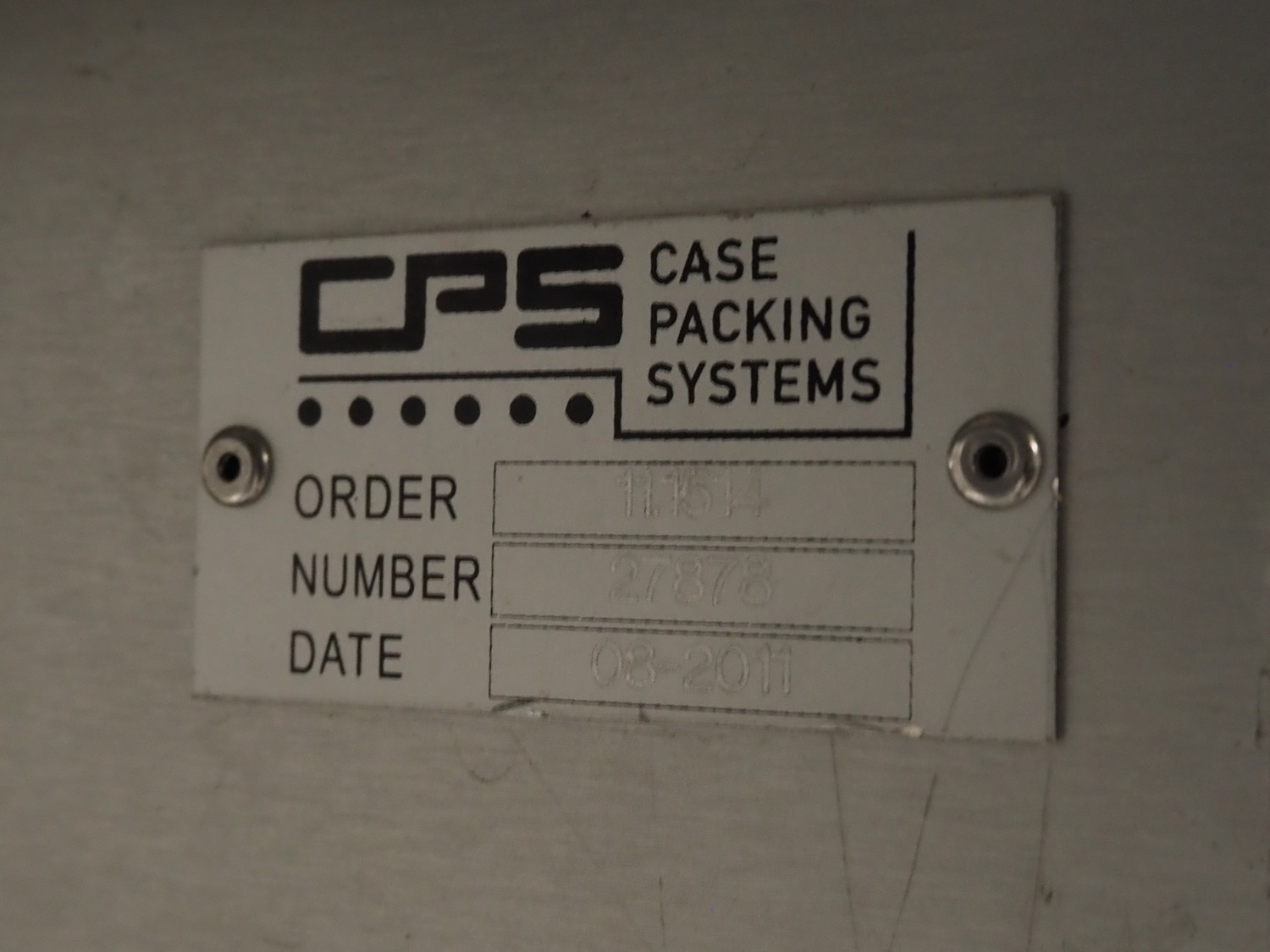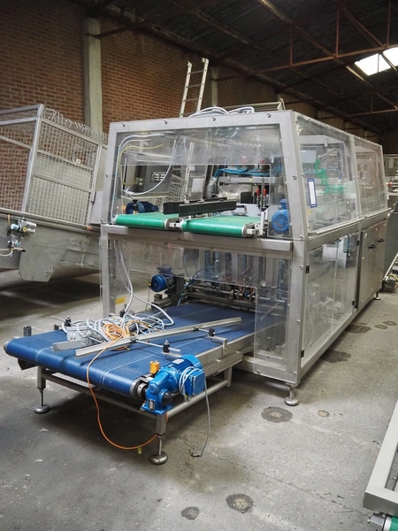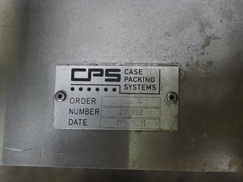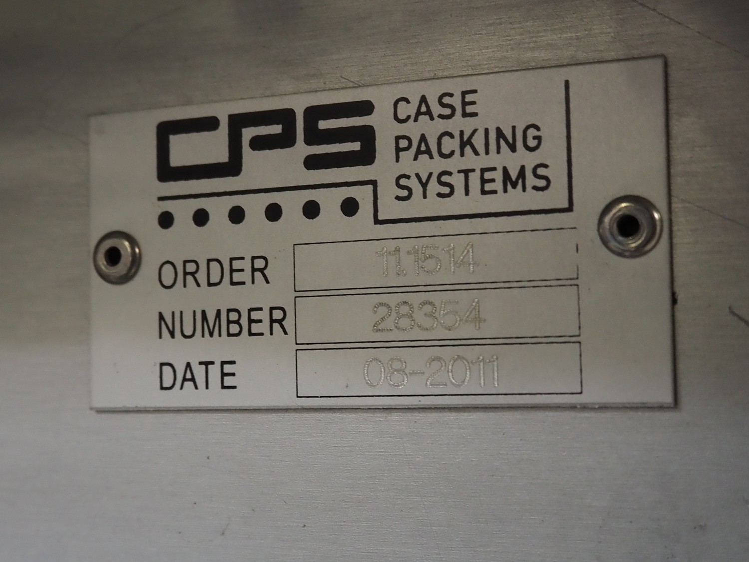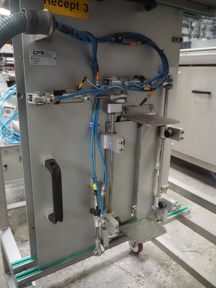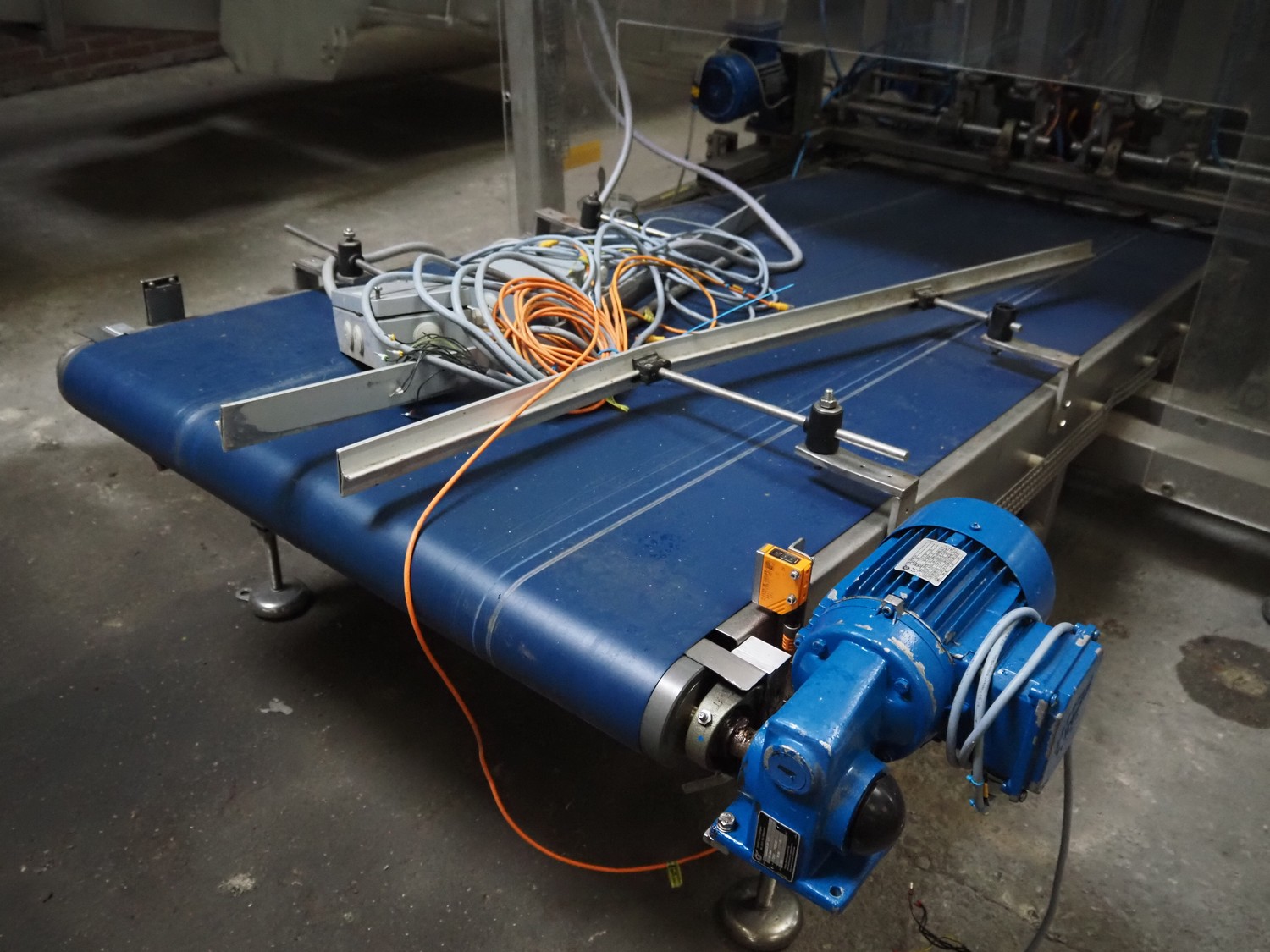 Case Packing Systems sideloader, model: SL 105, year of construction: 2006, infeed belt, s/s frame, plastic belt, belt width: 750 mm, infeed belt, dimensions: (2x) 450 mm, outfeed belt, belt width: 950 mm, total dimensions: 4800 mm x 3000 mm x 2600 mm, 90˚ roller conveyor with elevating belt, s/s frame, plastic belt, belt width: 450 mm, elevating height: 960 mm, total dimensions: 3400 mm x 850 mm x 1000 mm, 2 spare transport belts and trolley with parts.